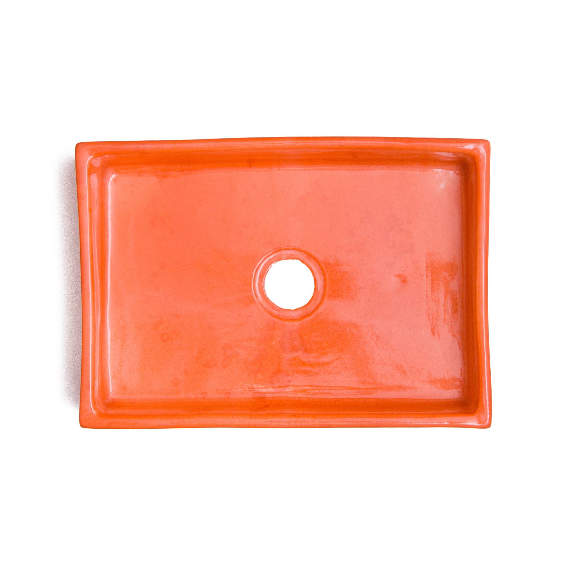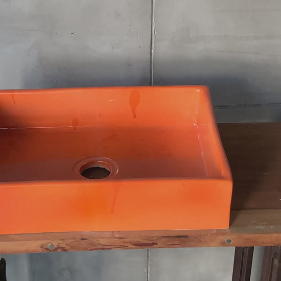 هذا الحوض المستطيل الصغير الحيوي يتميز بطلاء مرجان برتقالي مذهل يغطي الداخل والخارج بالكامل. اللون الغني والدافئ يتحقق من خلال تقنيات الطلاء اليدوي، مما يخلق تباينات دقيقة في العمق واللون. اللمعة النهائية تلتقط الضوء بشكل جميل، مما يجلب الطاقة والدفء إلى مساحات الحمامات الصغيرة.