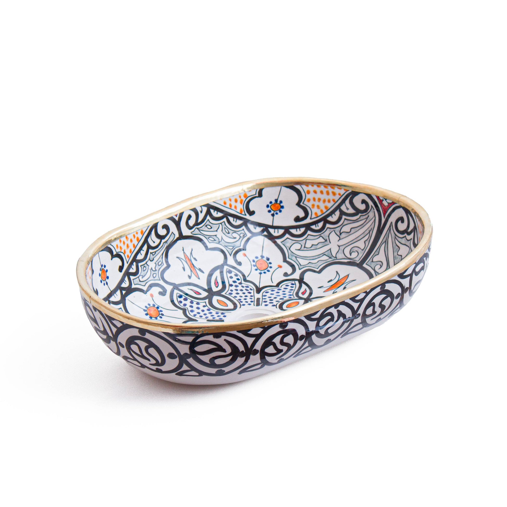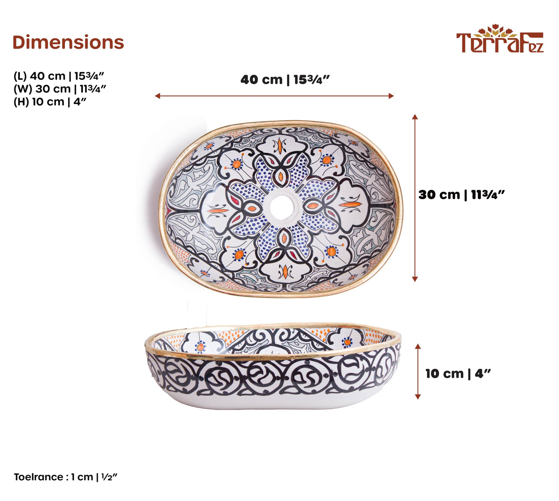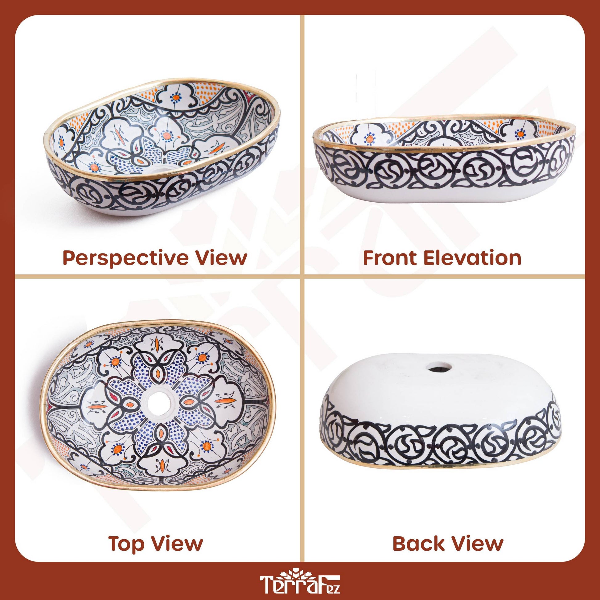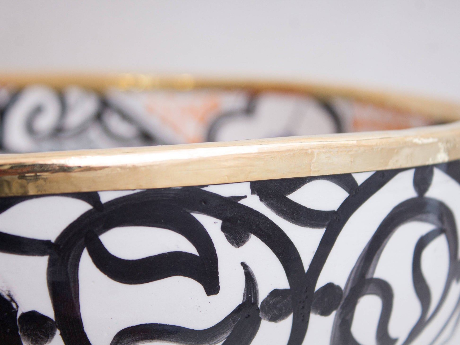 يتميز هذا الحوض البيضاوي الراقي بأعمال تمرير وأنماط زخرفية سوداء فحمية معقدة مرسومة يدويًا في جميع أنحاء الداخل والخارج. تصميمات الأرابيسك المتدفقة مكملة بزهور برتقالية وزرقاء رقيقة، مما يخلق مظهرًا فاخرًا مستوحى من الباروك. كل تمريرة وزخرفة مرسومة يدويًا بعناية فائقة.