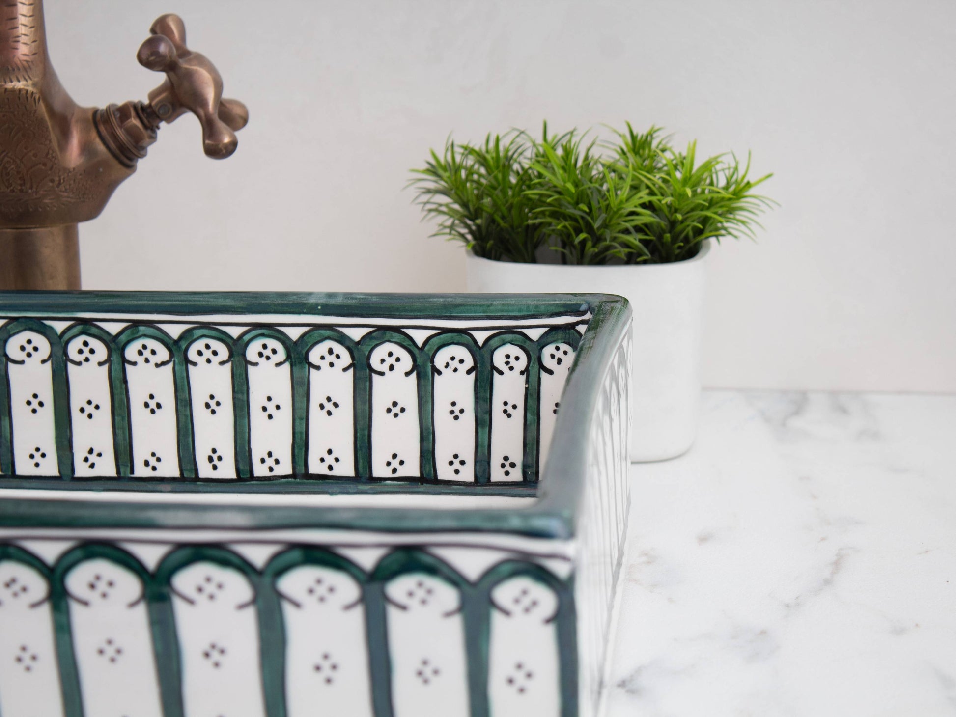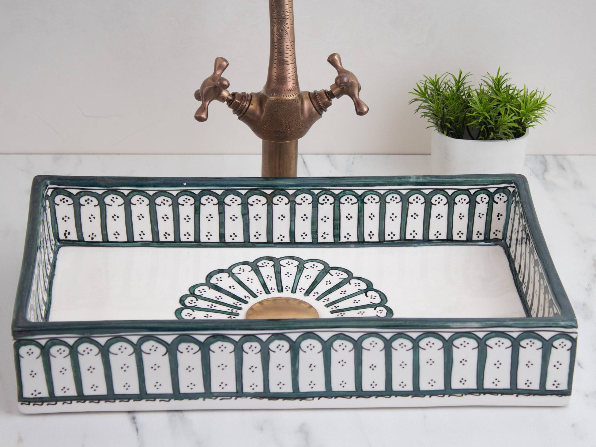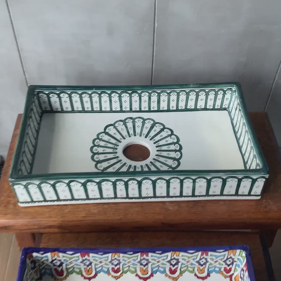 أنماط الأقواس الخضراء الغنية للغابة تخلق حدودًا أنيقة على هذا الحوض المستطيل. زخارف الأقواس المتكررة مستوحاة من الأبواب والنوافذ المغربية التقليدية، ومرسومة بعناية يدويًا على طول الحافة مع لمسة شمس مشرقة بلون البرونز. اللون الأخضر العميق يضفي إحساسًا ترابيًا وراقيًا على حمامك.