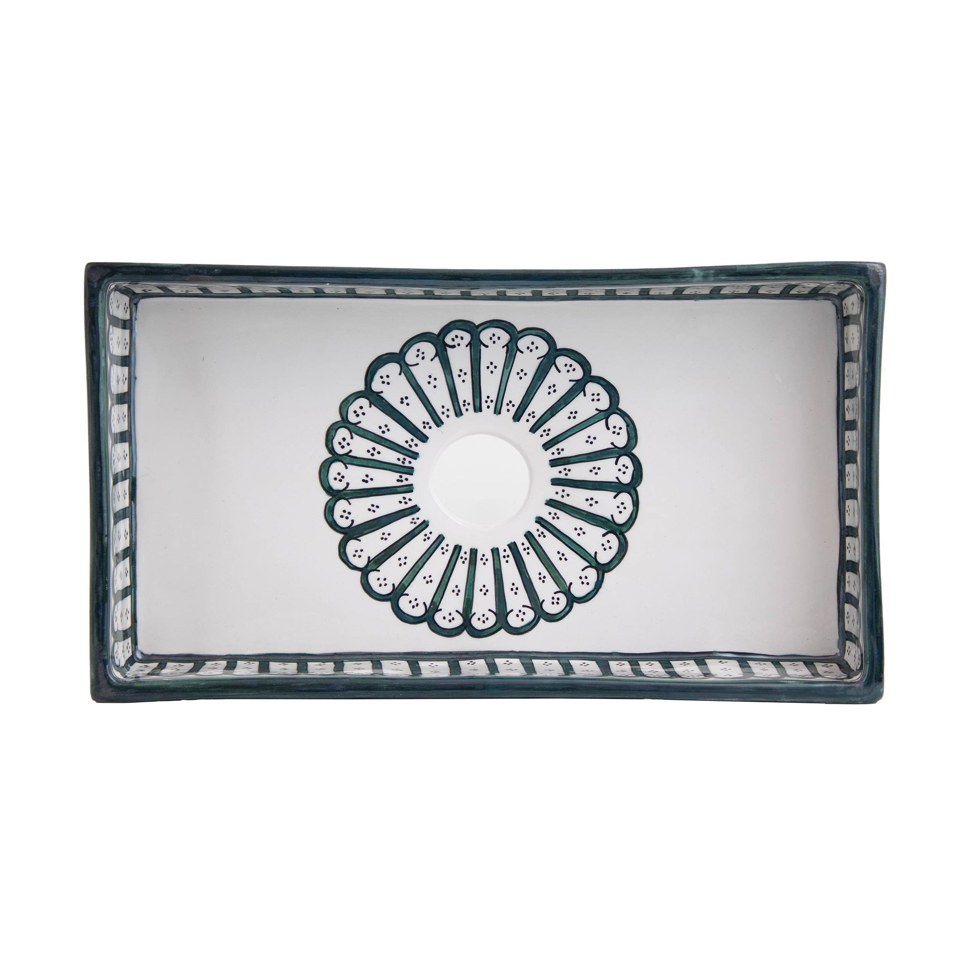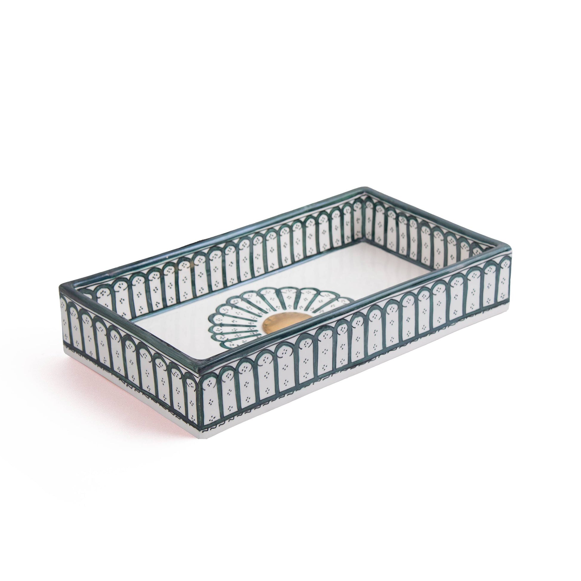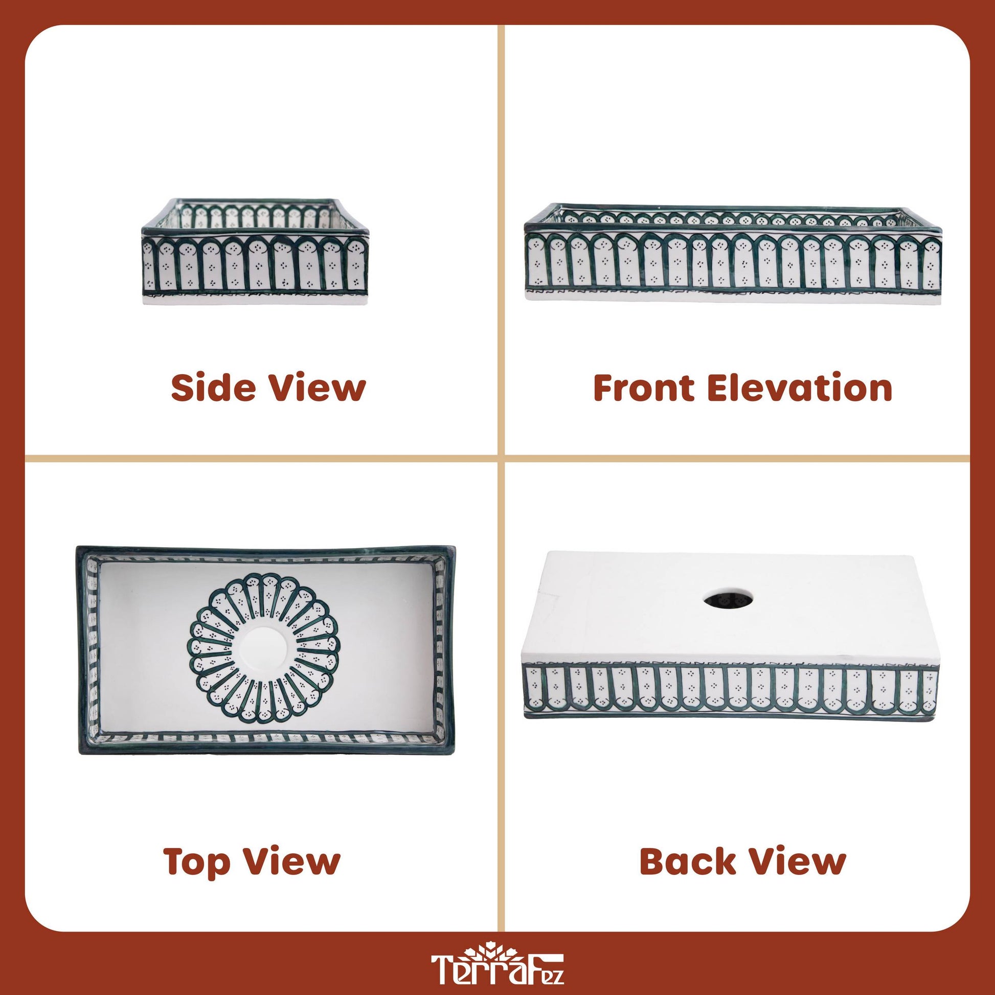 أنماط الأقواس الخضراء الغنية للغابة تخلق حدودًا أنيقة على هذا الحوض المستطيل. زخارف الأقواس المتكررة مستوحاة من الأبواب والنوافذ المغربية التقليدية، ومرسومة بعناية يدويًا على طول الحافة مع لمسة شمس مشرقة بلون البرونز. اللون الأخضر العميق يضفي إحساسًا ترابيًا وراقيًا على حمامك.