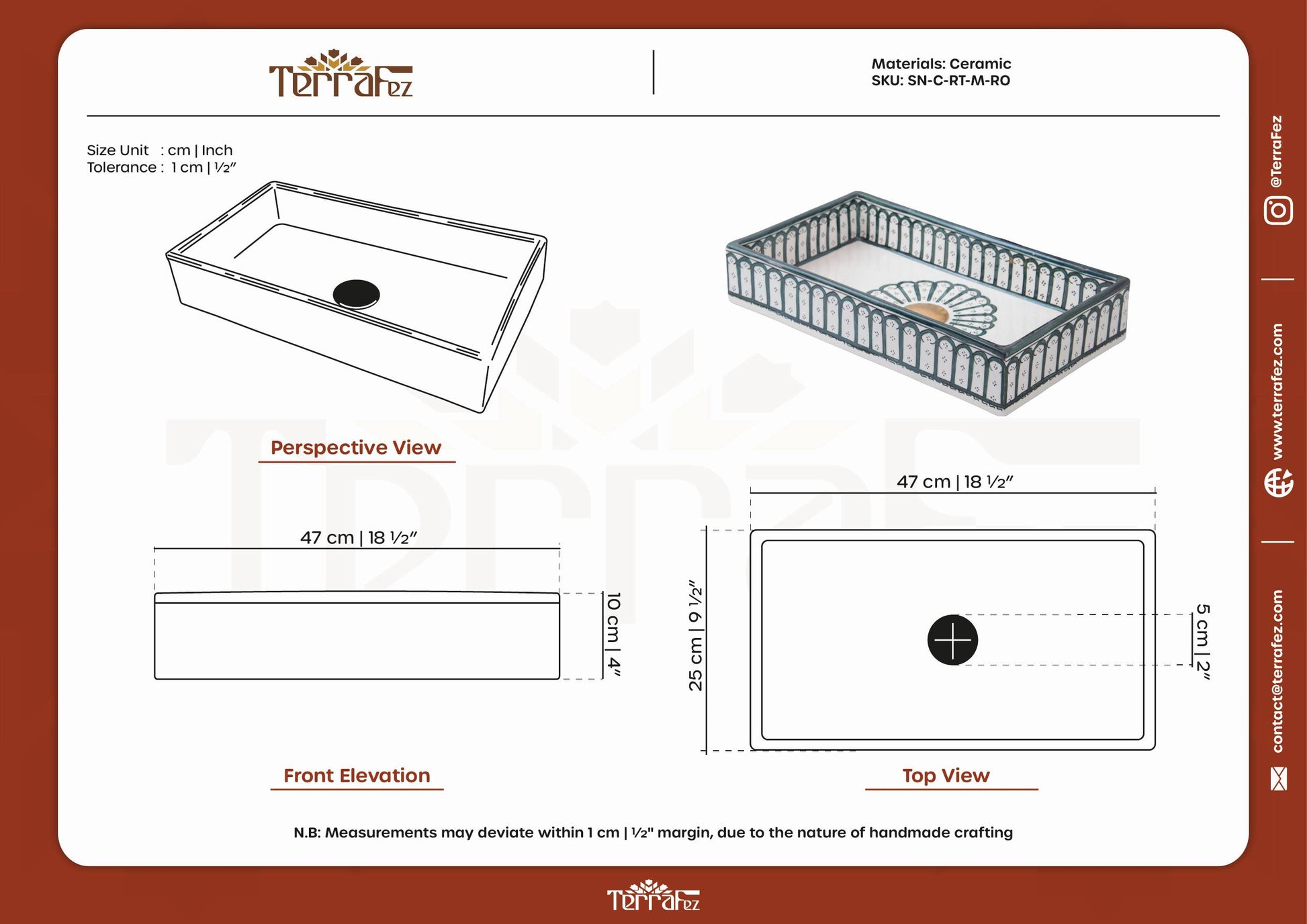 ما يجعل الصناعة اليدوية مختلفة:الأحواض المصنوعة بكميات كبيرة لها أنماط متجانسة تمامًا. مع TerraFez، الأقواس المرسومة يدويًا تظهر اختلافات عضوية في وزن الخط والمسافة، مما يخلق مظهرًا حرفيًا يحتفل بالحرفية التقليدية.