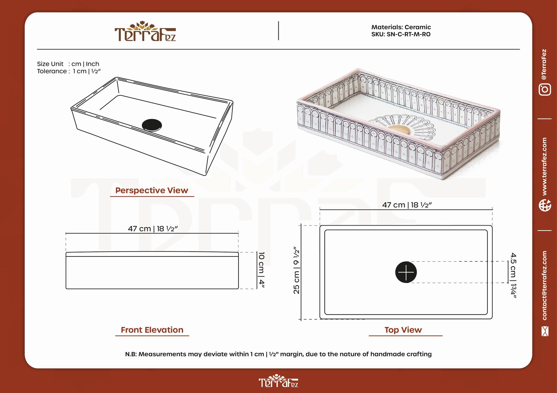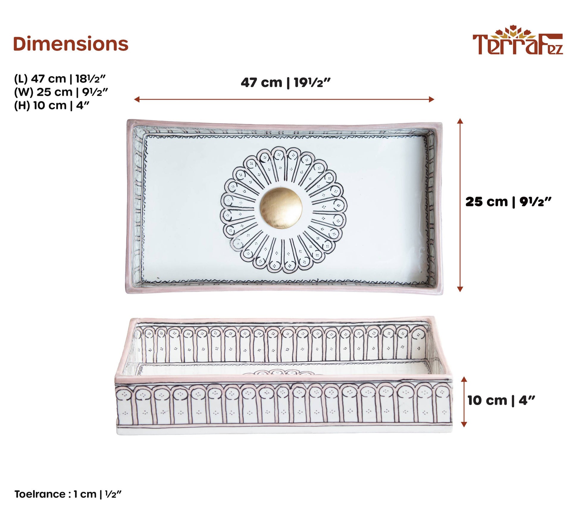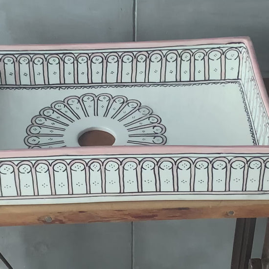 ما يجعل الصناعة اليدوية مختلفة:الأحواض المصنوعة بكميات كبيرة تفتقر إلى العمق والطابع الخاص بالسيراميك المرسوم يدويًا. مع TerraFez، كل قوس مرسوم بشكل فردي، مما يخلق اختلافات دقيقة تضيف بُعدًا وتثبت أن هذه قطعة مصنوعة يدويًا.