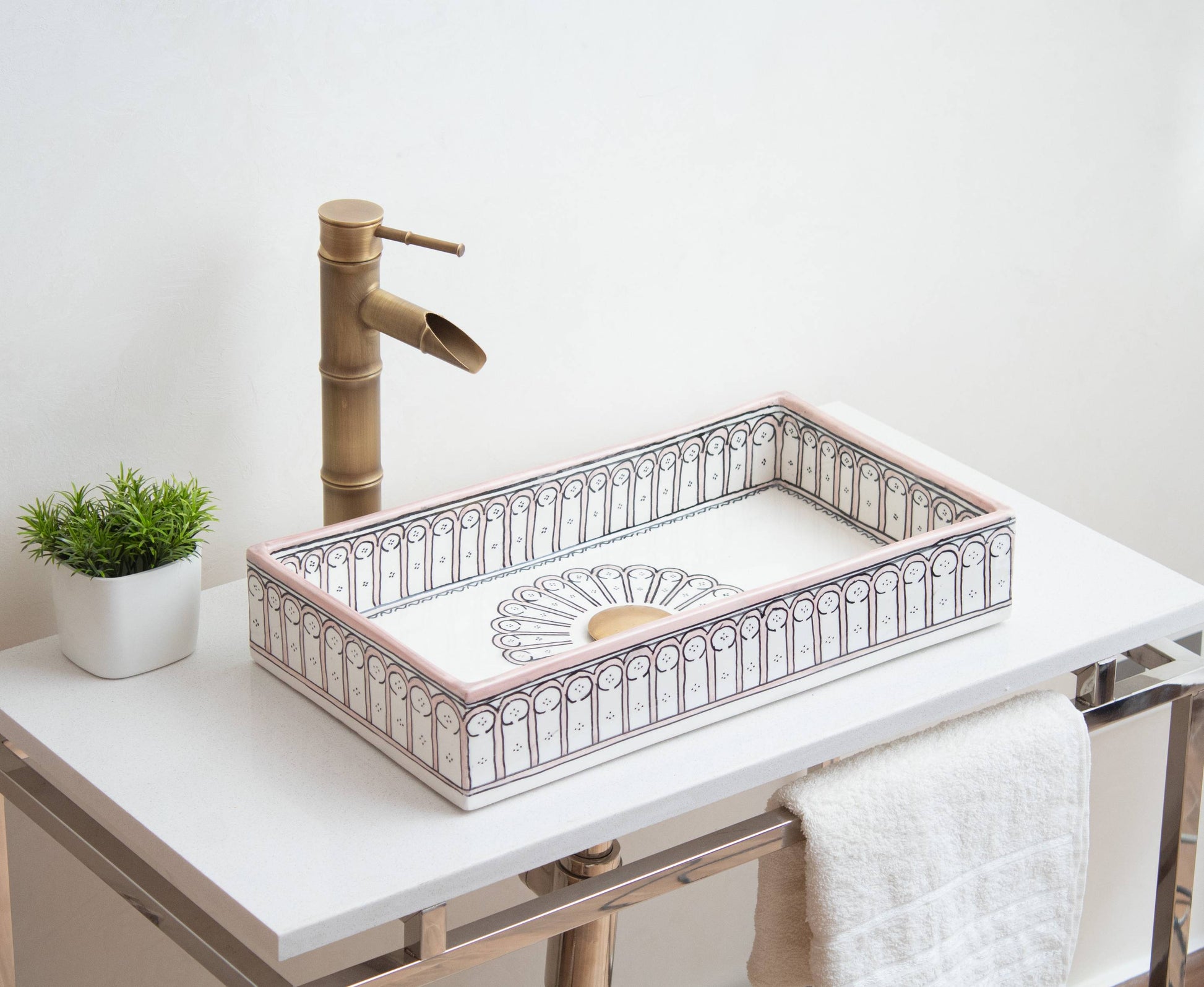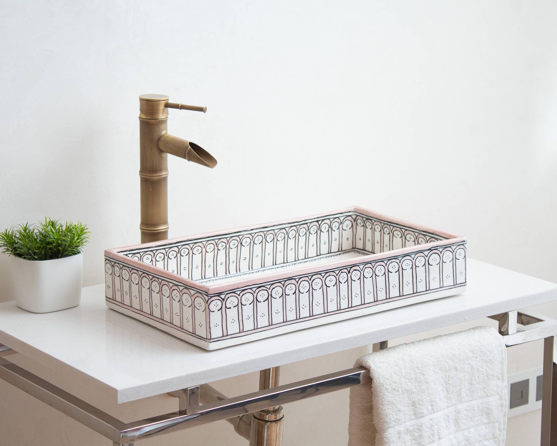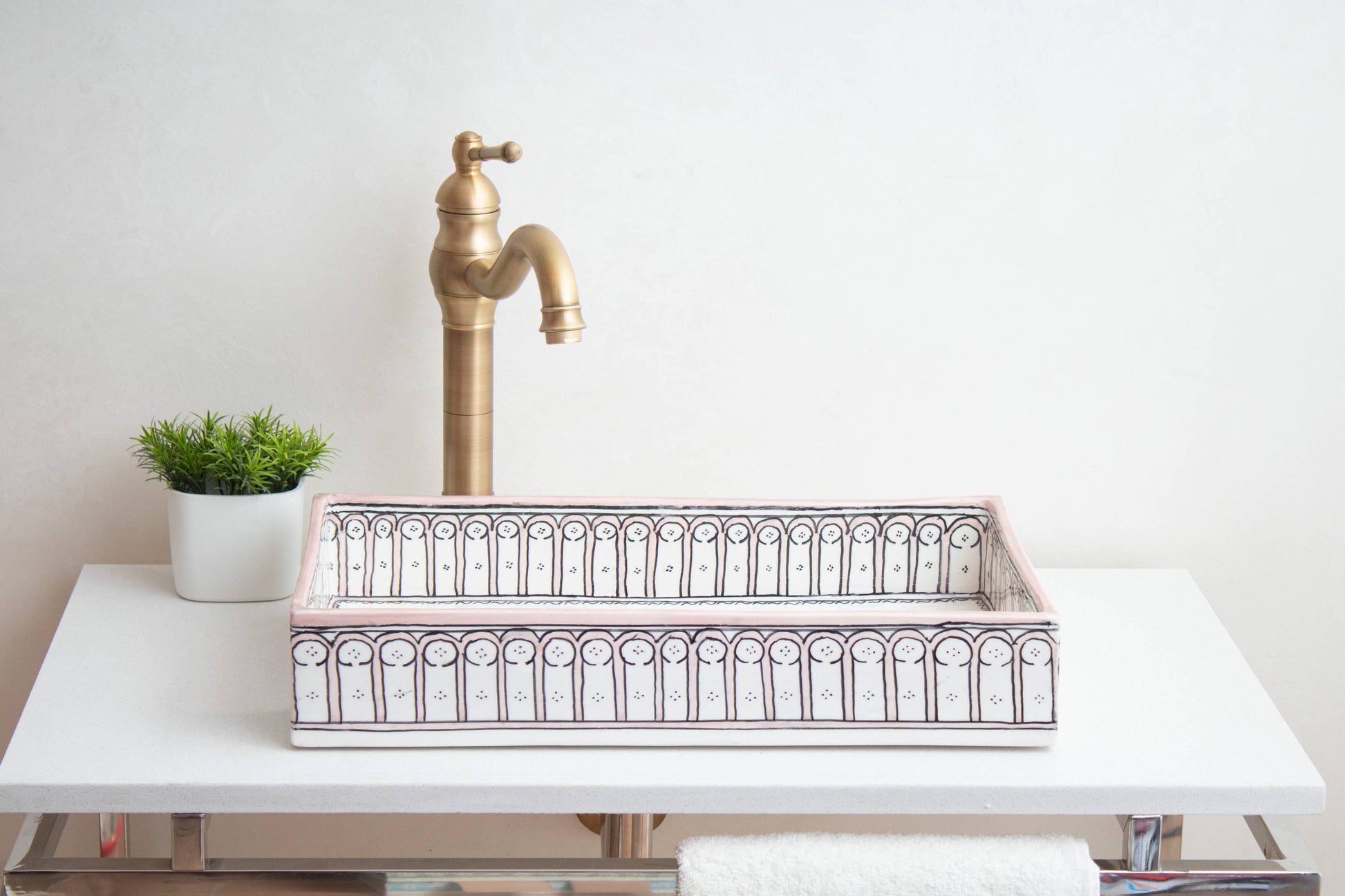 أنماط الأقواس الرمادية الأنيقة تخلق حدودًا متطورة على هذا الحوض المستطيل. زخارف الأقواس المتكررة مستوحاة من العمارة المغربية التقليدية ومرسومة بعناية يدويًا على طول الحافة. الدرجات الرمادية المحايدة تضيف اهتمامًا بصريًا مع بقائها متعددة الاستخدامات بما يكفي للعمل مع أي لوحة ألوان للحمام.