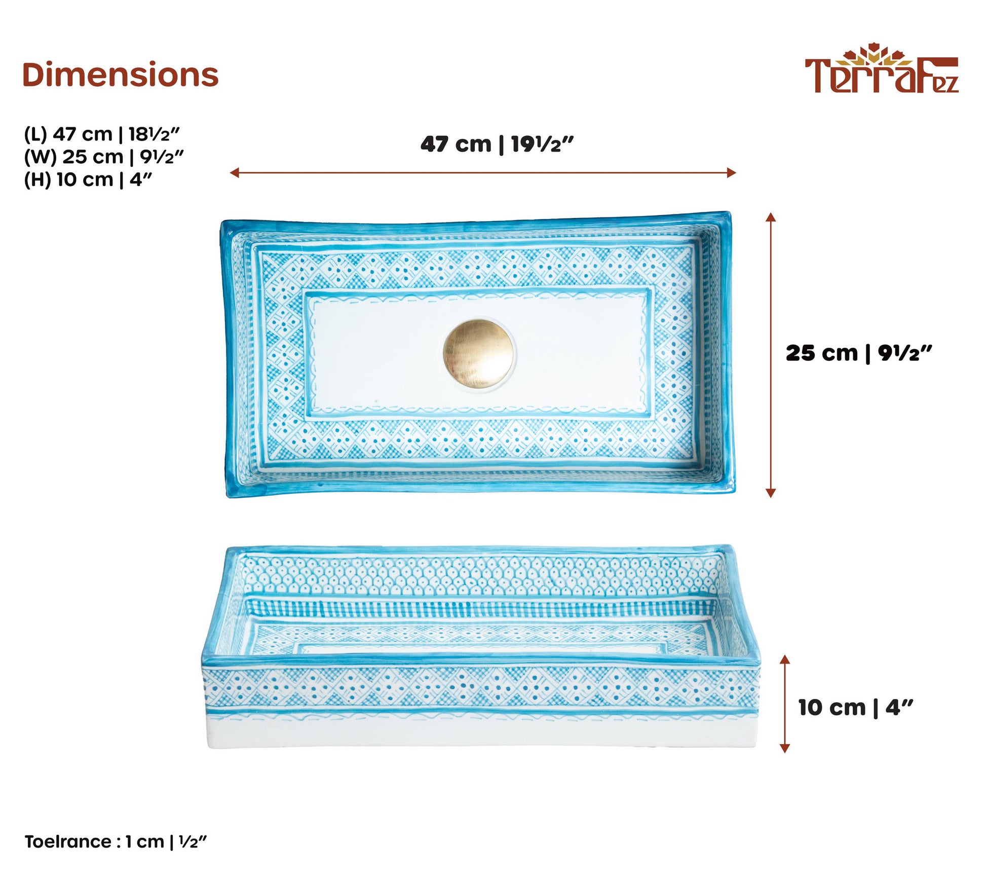 ما يجعل الصناعة اليدوية مختلفة:الأحواض المصنوعة بكميات كبيرة لها أنماط متجانسة تمامًا. مع TerraFez، الأشكال المعينة والحدود المرسومة يدويًا تظهر اختلافات طفيفة في الحجم والمحاذاة، مما يخلق مظهرًا حرفيًا يحتفل باللمسة الإنسانية.