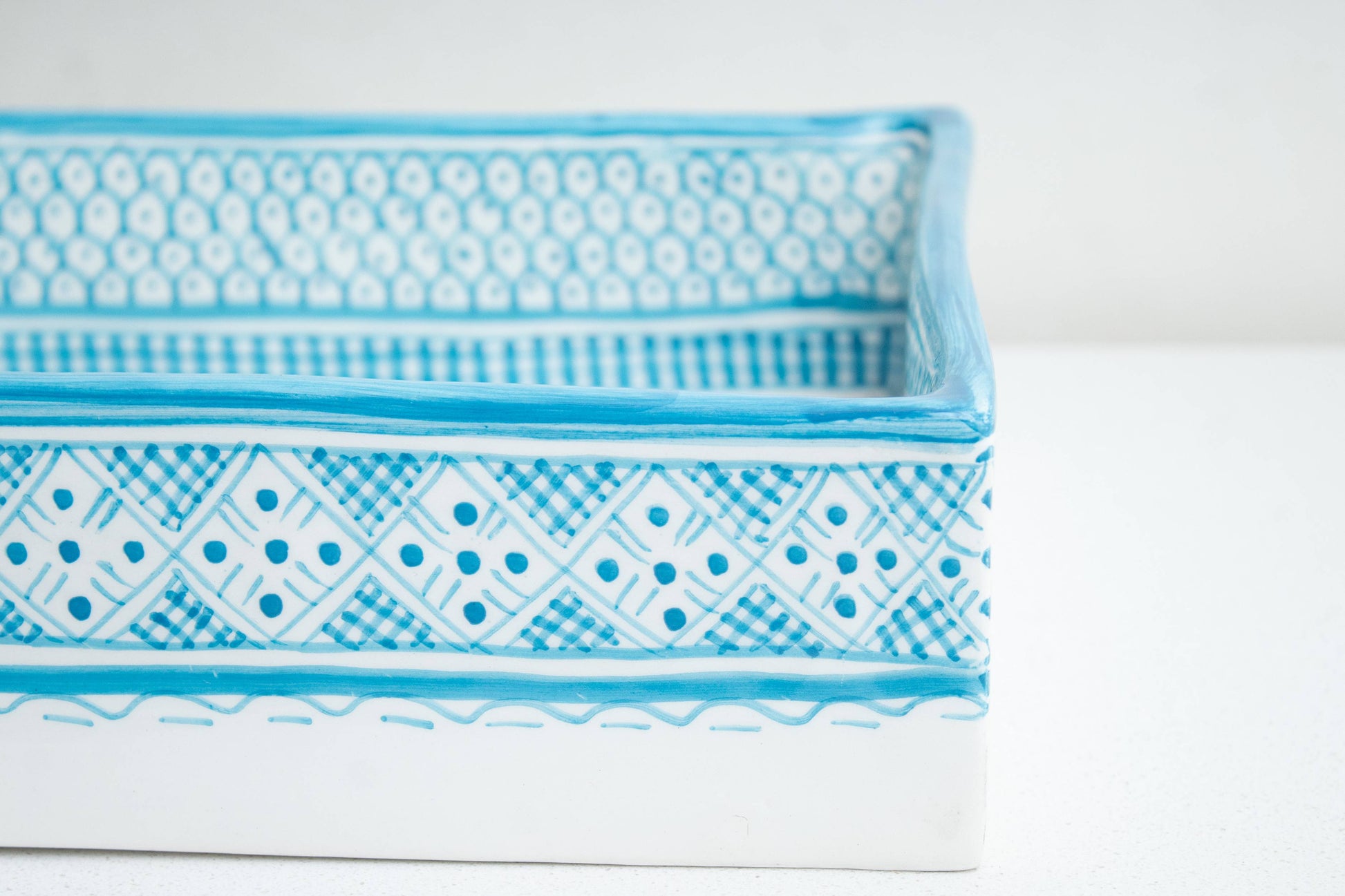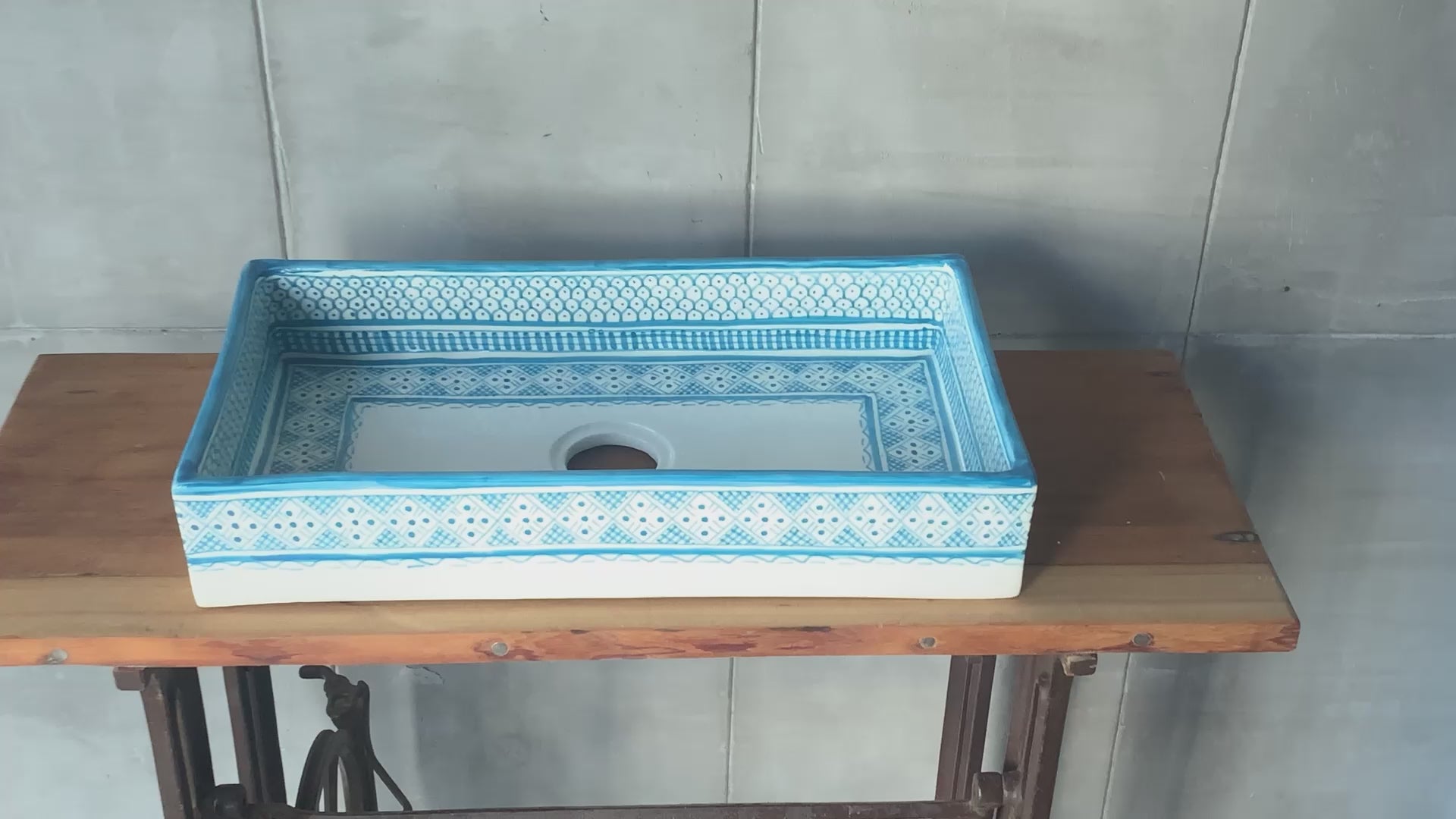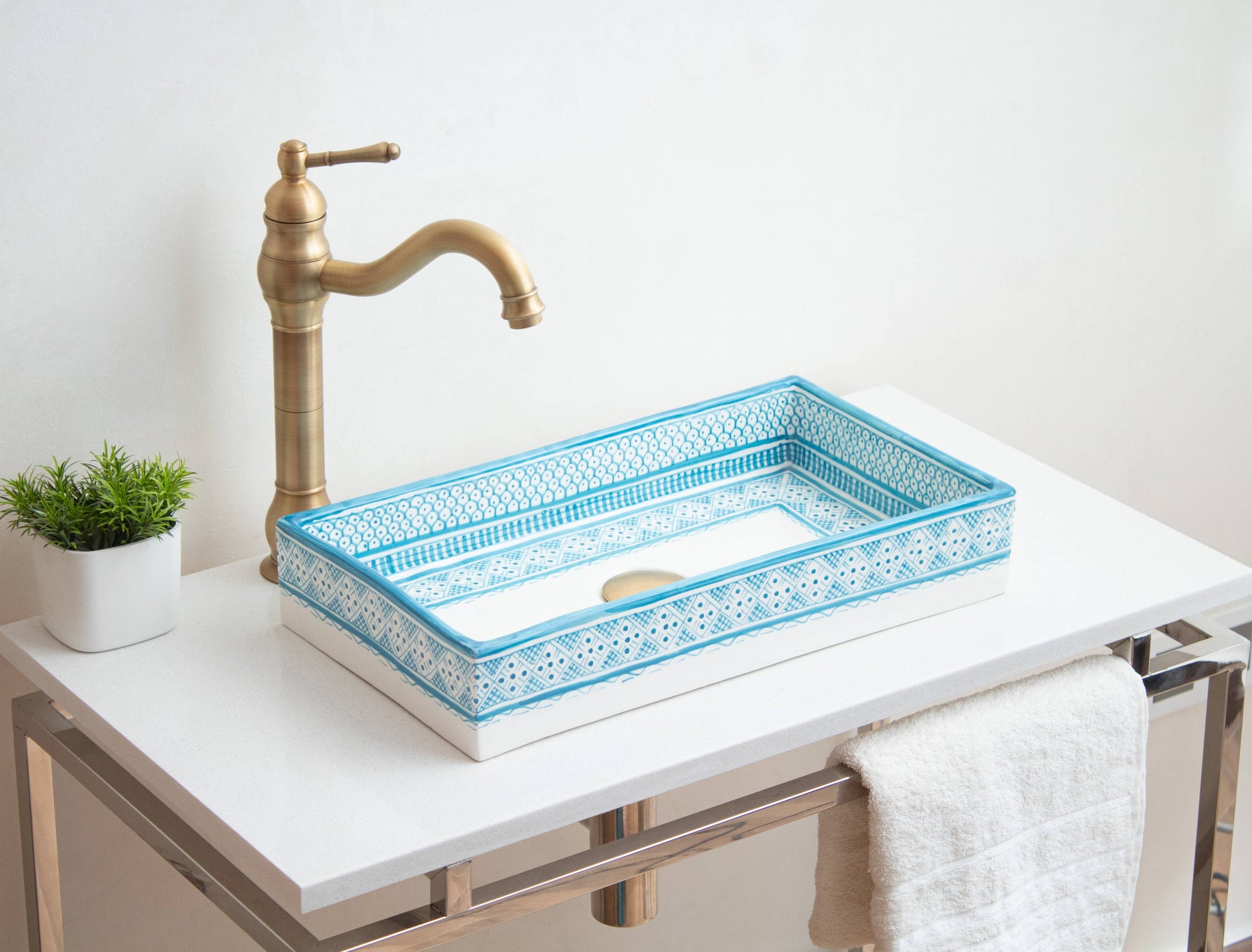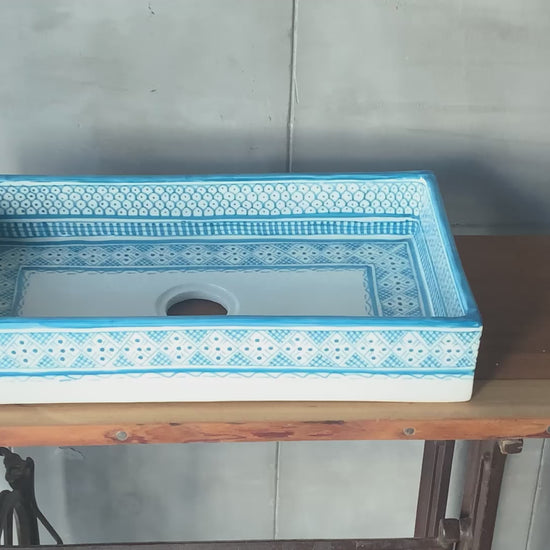 أنماط هندسية زرقاء تركوازية نابضة بالحياة تخلق حدودًا بارزة على هذا الحوض المستطيل. الحرفيون يرسمون بعناية كل شكل معين وعنصر زخرفي يدويًا، ويبنون طبقات معقدة من الأنماط. اللون التركوازي الساطع على الخلفية البيضاء يخلق مظهرًا منعشًا ونشطًا يضفي شخصية على حمامك.