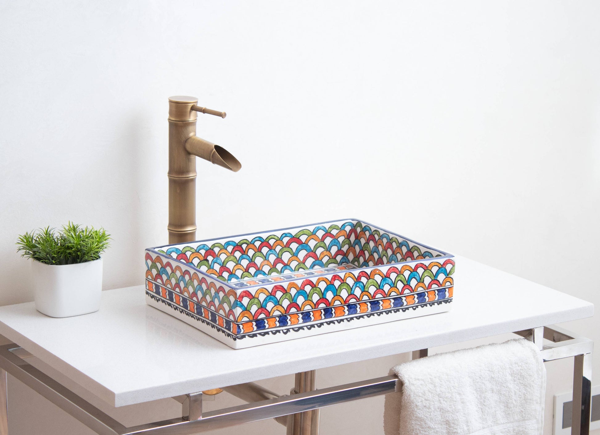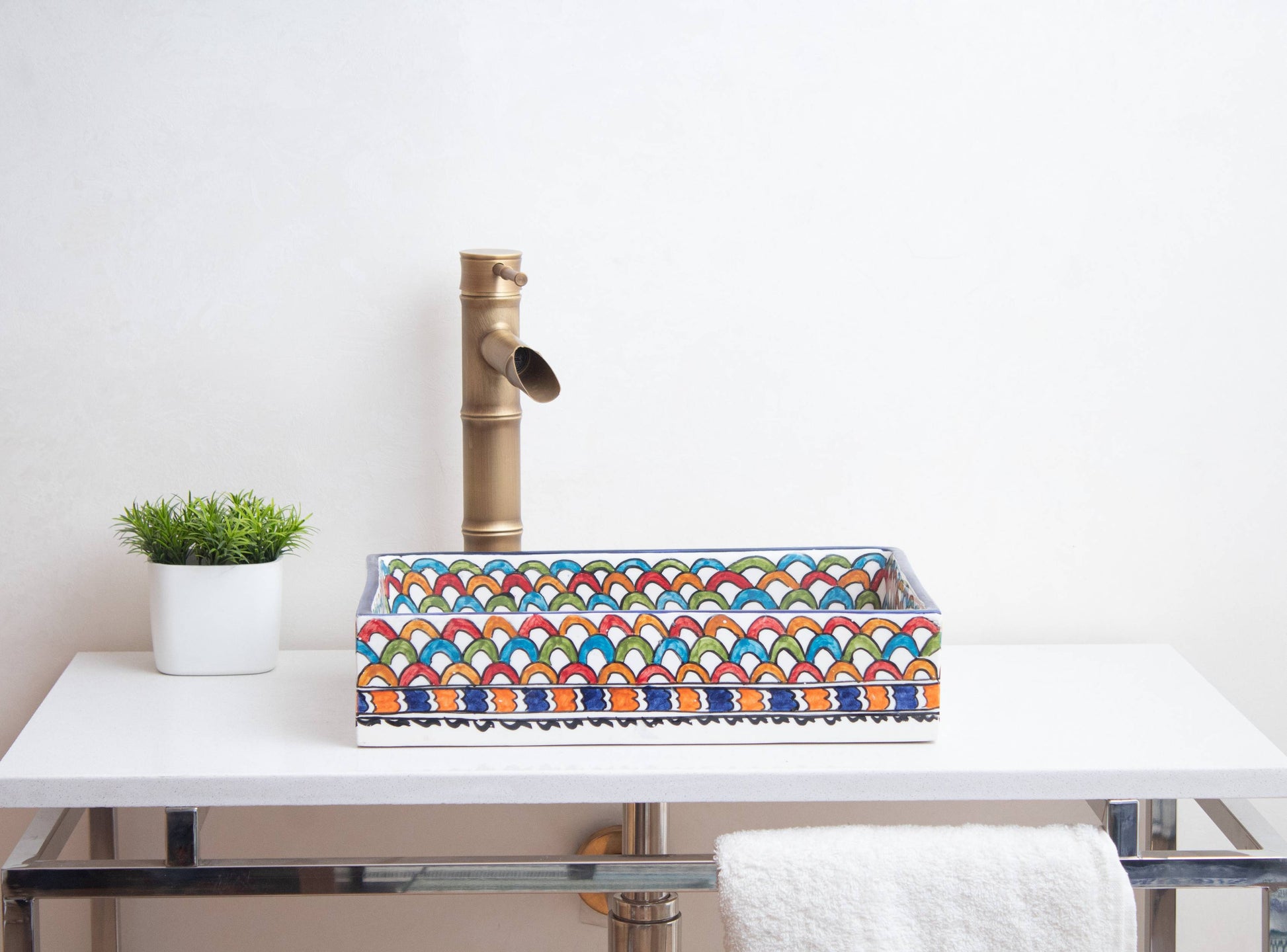 Perfect for bohemian, eclectic, or coastal-inspired powder rooms. The mini rectangular shape is both functional and artistic. Pairs beautifully with brass, gold, or chrome faucets.