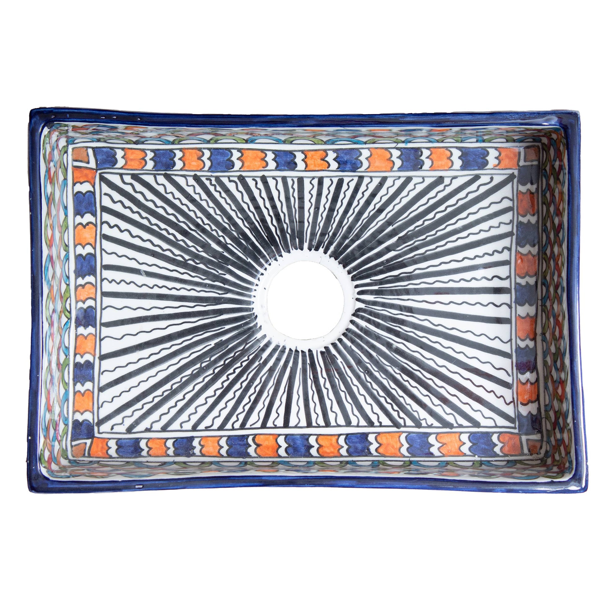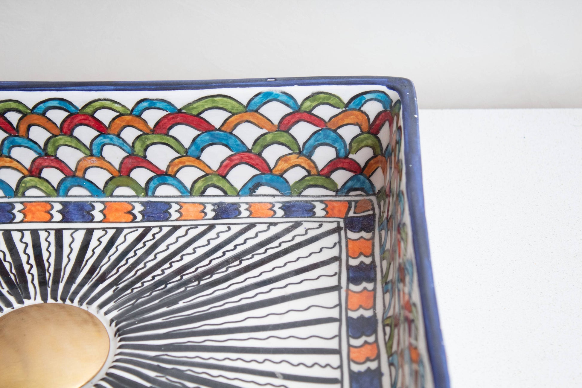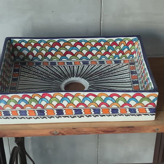 This vibrant mini rectangular sink features multicolored scalloped scale patterns in blue, orange, red, and green hand-painted along the border. The repeating fish-scale design creates a playful, energetic look with a radiating sunburst accent at the drain. Each scale is meticulously painted by hand with exceptional detail.
