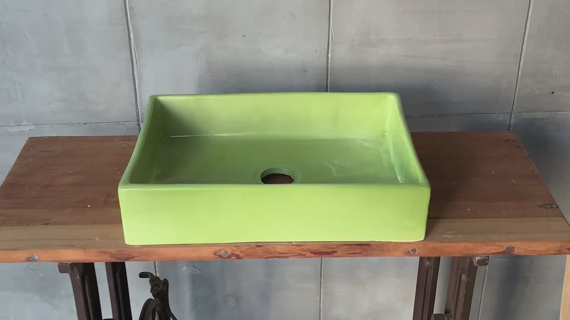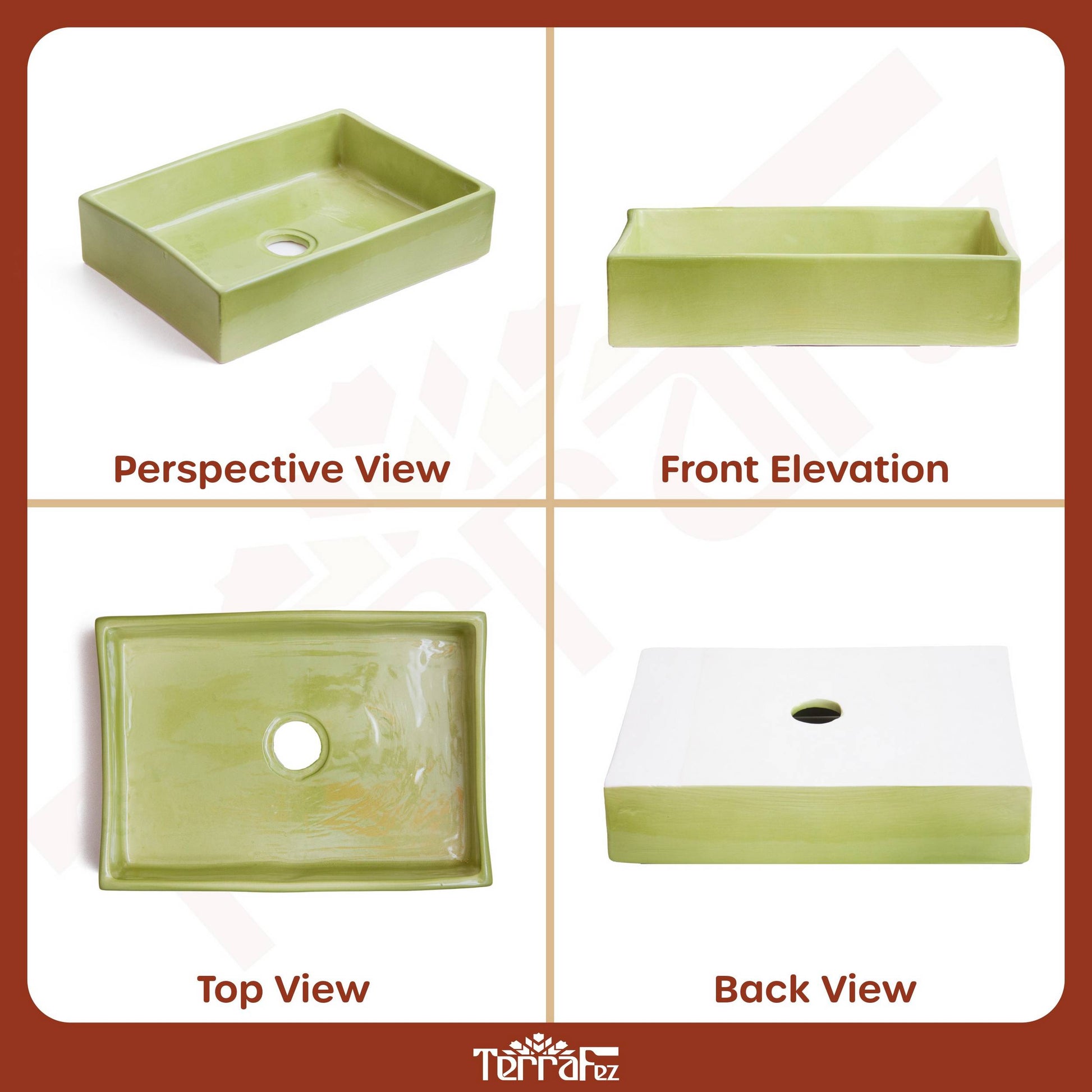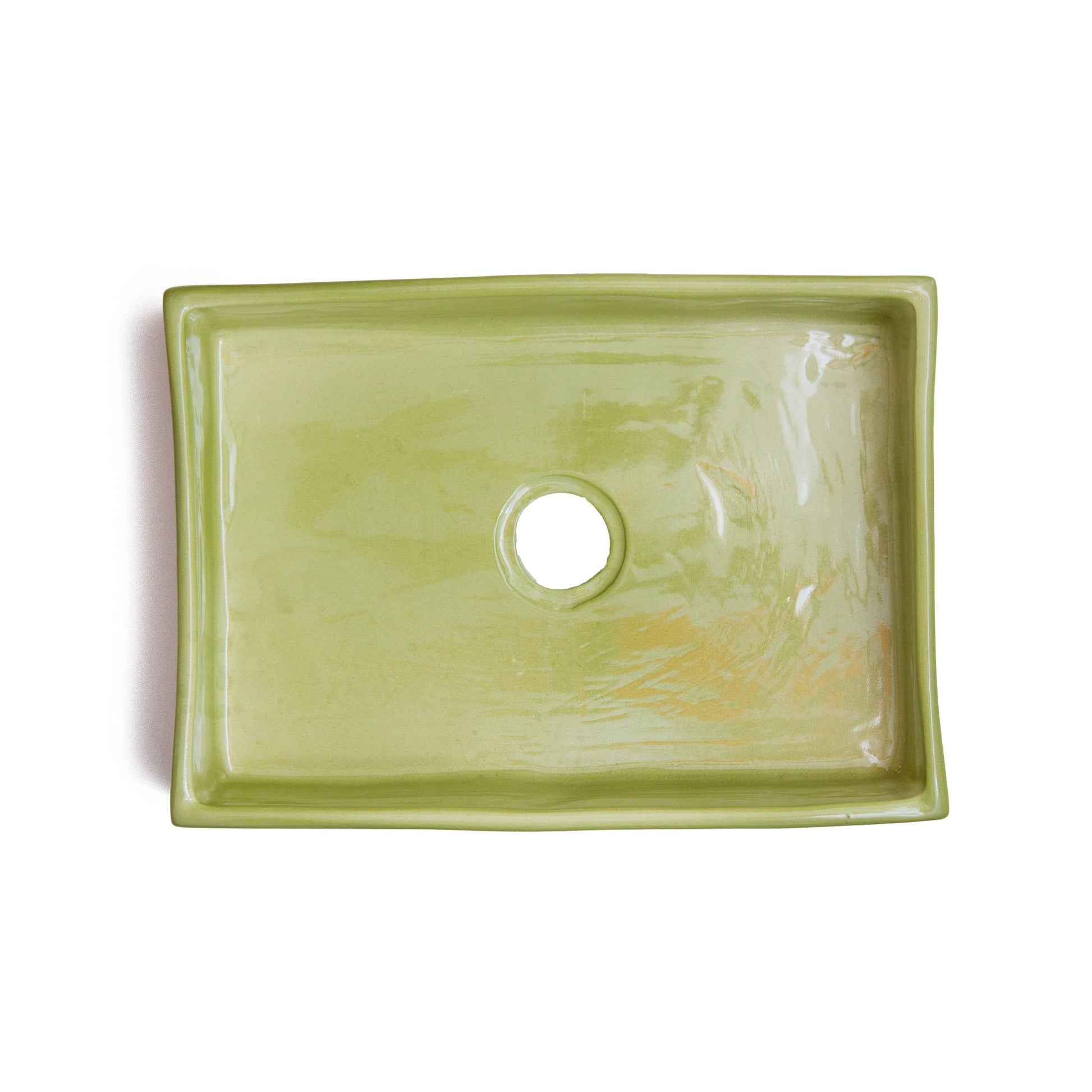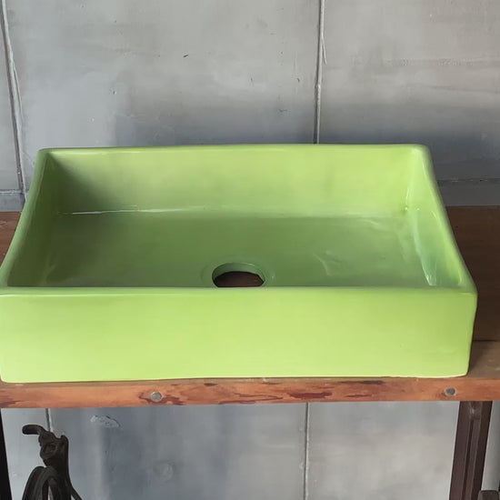This soothing mini rectangular sink features a soft sage green glaze that covers the entire interior and exterior. The muted green tones create a calming, natural feel perfect for small bathrooms. The hand-applied glaze creates subtle variations in color depth that add warmth and organic beauty.