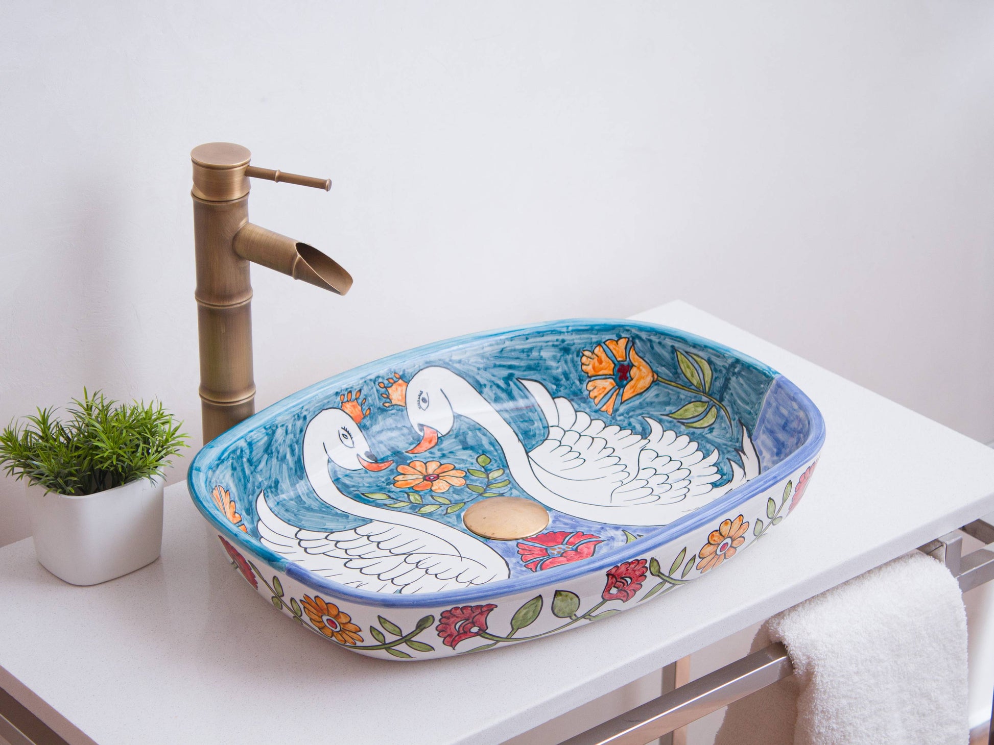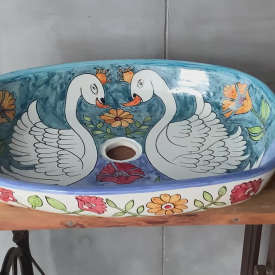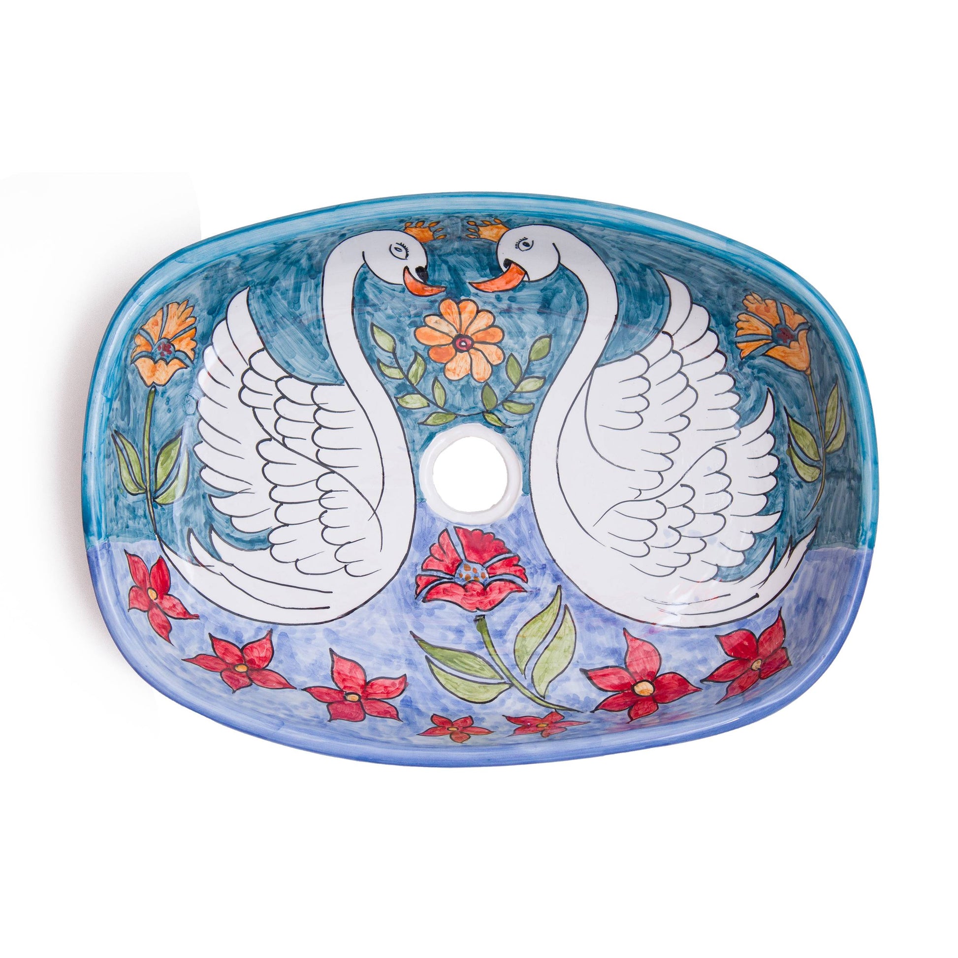This stunning oval sink features elegant white swans hand-painted on a vibrant azure blue interior, surrounded by colorful floral motifs on the exterior. The graceful swans create a romantic, storybook feel, while the rich blue glaze provides a luxurious backdrop. Each element is meticulously painted by hand with exceptional artistry.