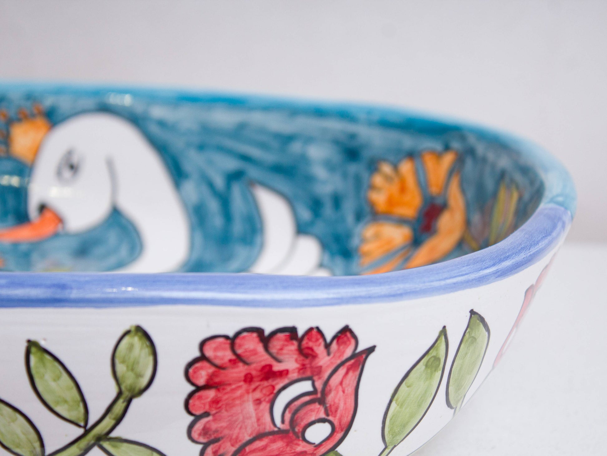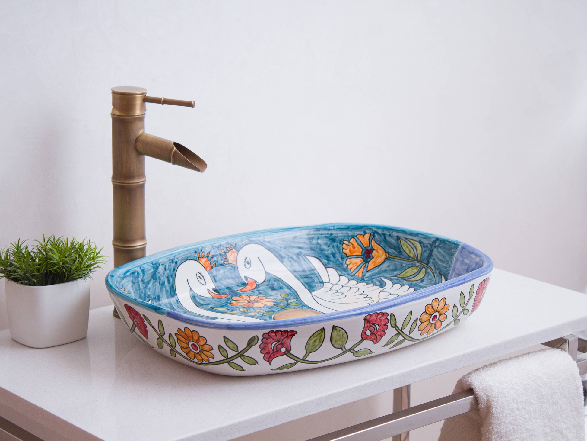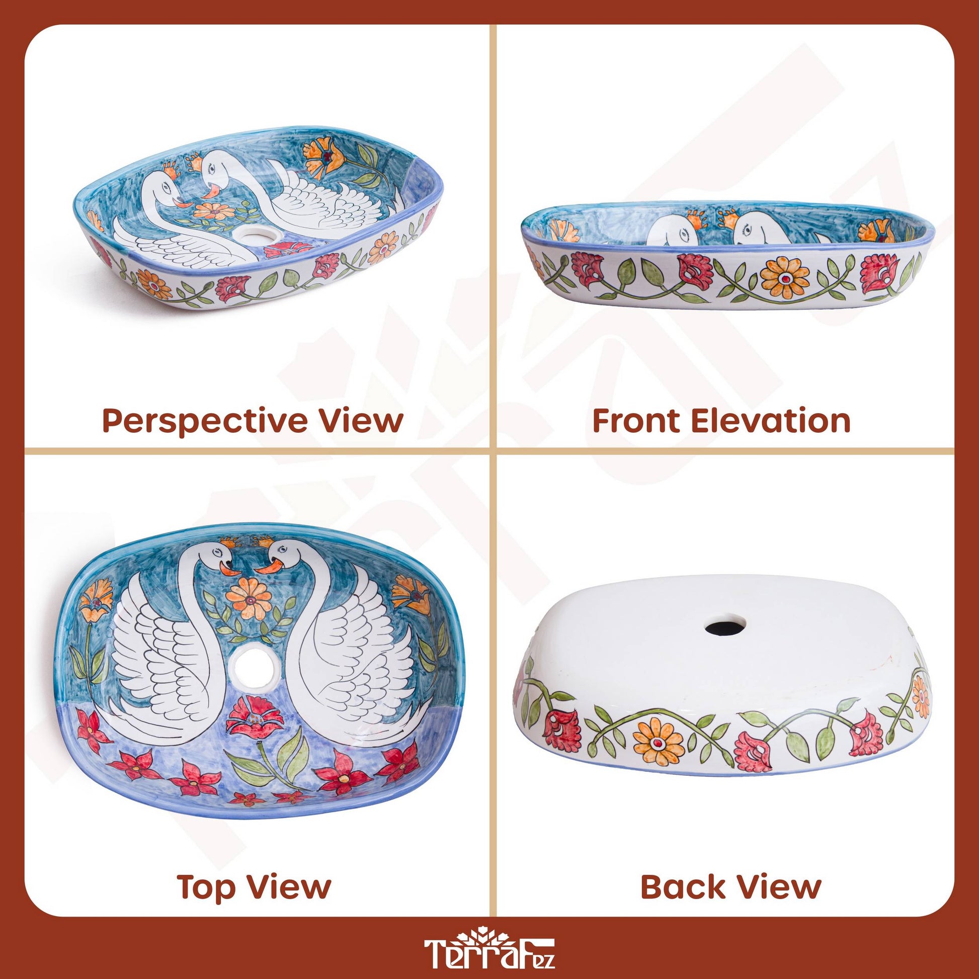 This stunning oval sink features elegant white swans hand-painted on a vibrant azure blue interior, surrounded by colorful floral motifs on the exterior. The graceful swans create a romantic, storybook feel, while the rich blue glaze provides a luxurious backdrop. Each element is meticulously painted by hand with exceptional artistry.