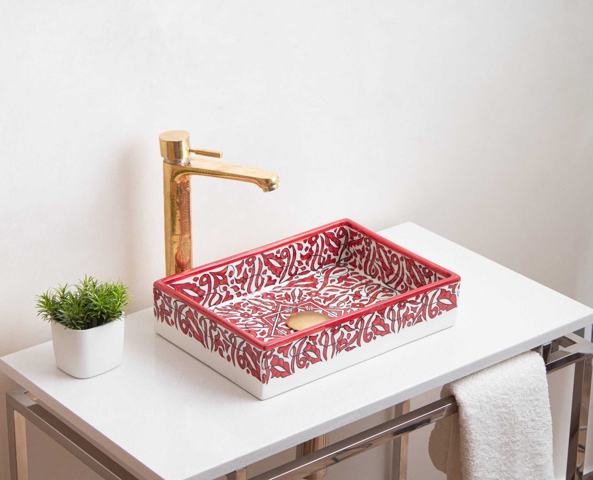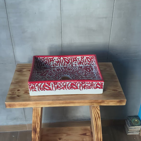 This dramatic mini rectangular sink features intricate crimson red arabesque patterns hand-painted on all sides and interior. The flowing organic designs inspired by traditional Islamic art are meticulously painted, creating a bold, luxurious look. The deep red against white creates a striking statement in small spaces.