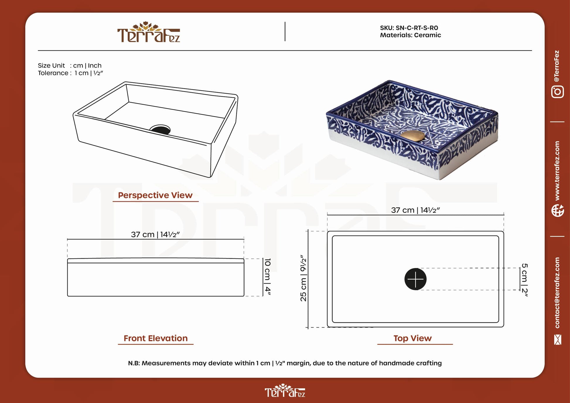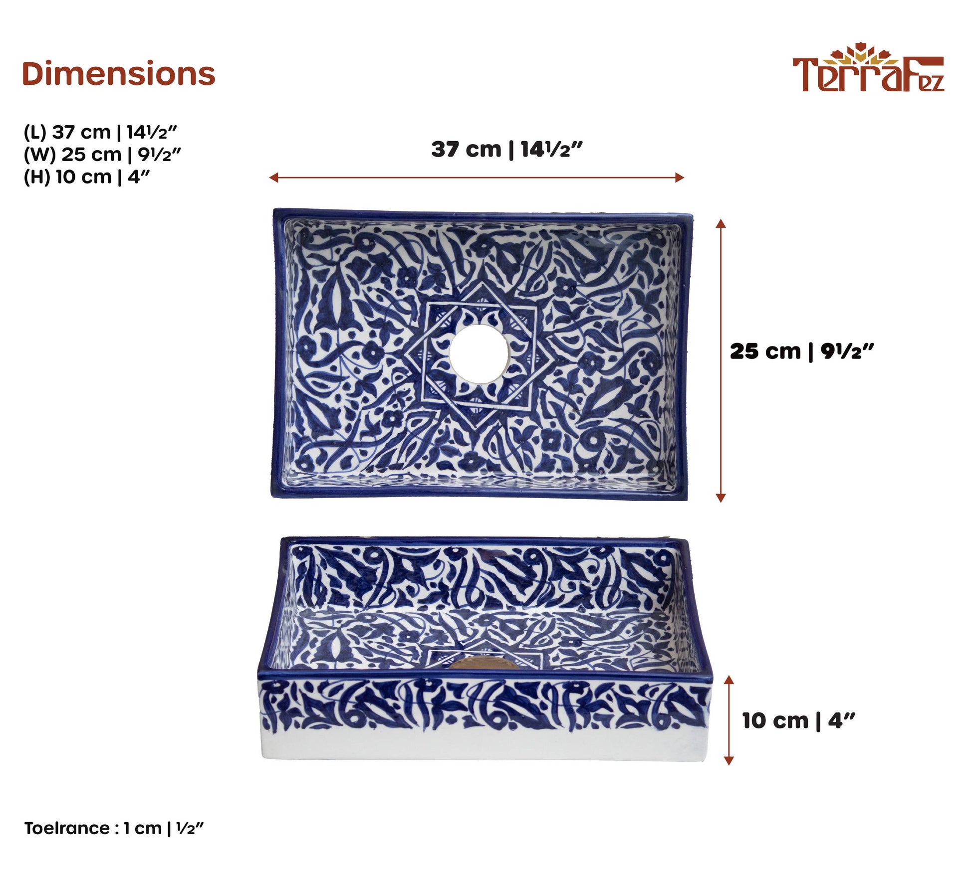 What makes handmade different:Mass-produced sinks can't achieve the complexity and beauty of hand-painted arabesques. With TerraFez, each curving line and flourish is carefully applied by skilled artisans, creating rich variations in a compact format.
