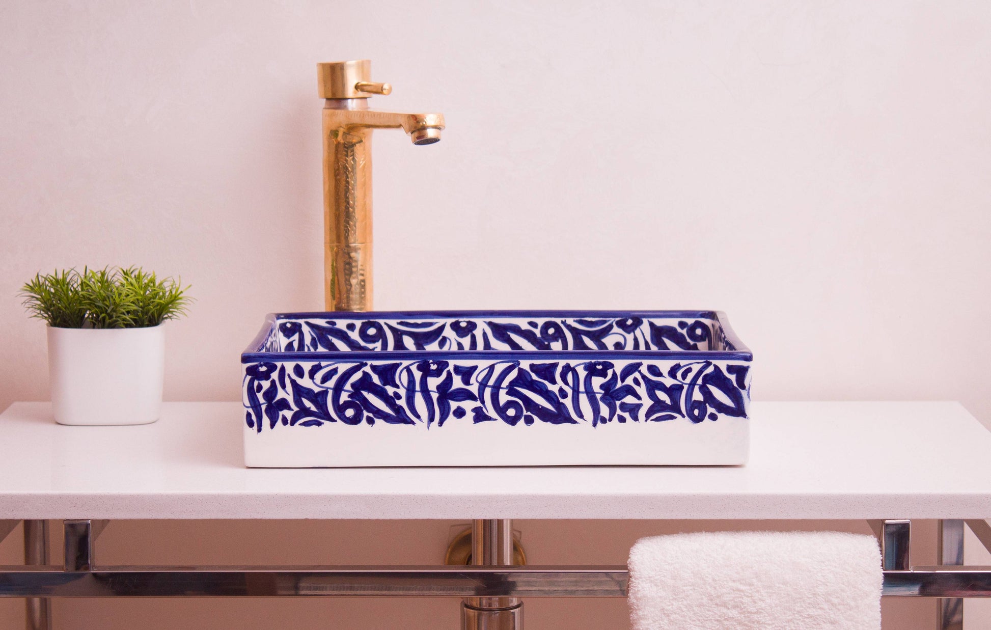 This dramatic mini rectangular sink features intricate navy blue arabesque patterns hand-painted on all sides and interior. The flowing organic designs inspired by traditional Islamic art are meticulously painted, creating a bold, luxurious look. The deep navy against white creates a striking, sophisticated statement in small spaces.