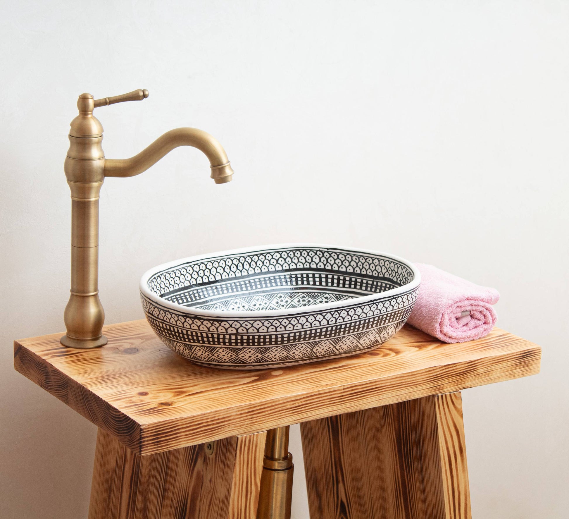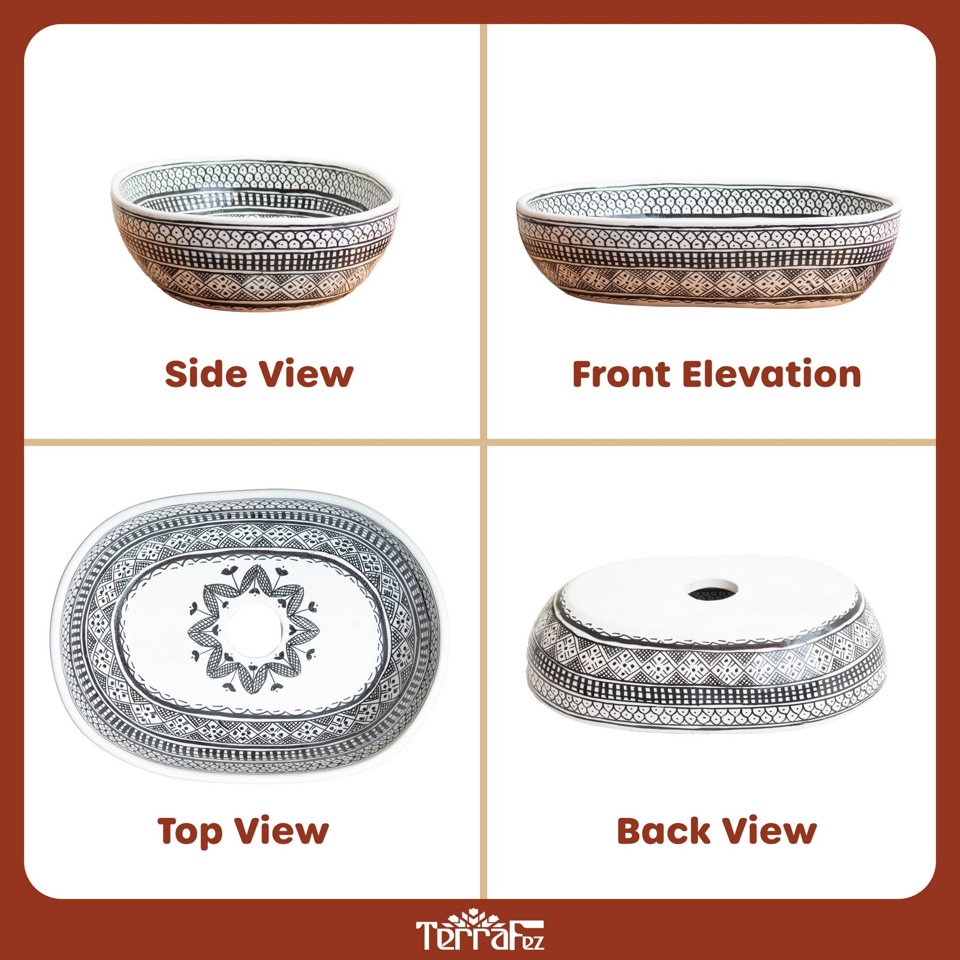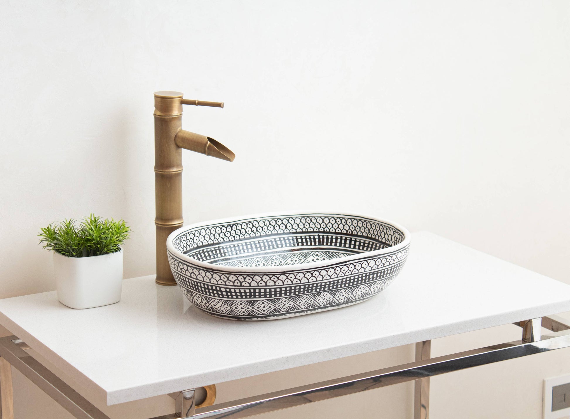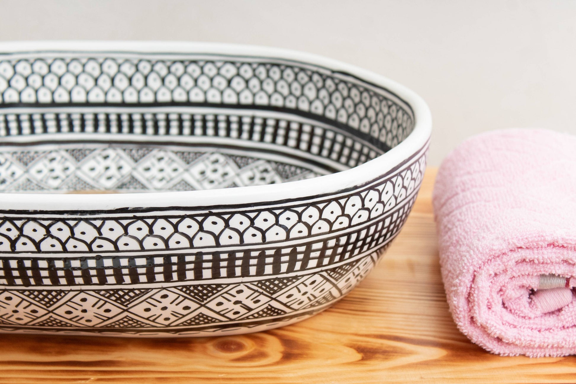 What makes handmade different:Mass-produced sinks lack the depth and precision of hand-painted geometric patterns. With TerraFez, each band and geometric element is carefully applied by hand, creating subtle variations in line weight and spacing that add character.