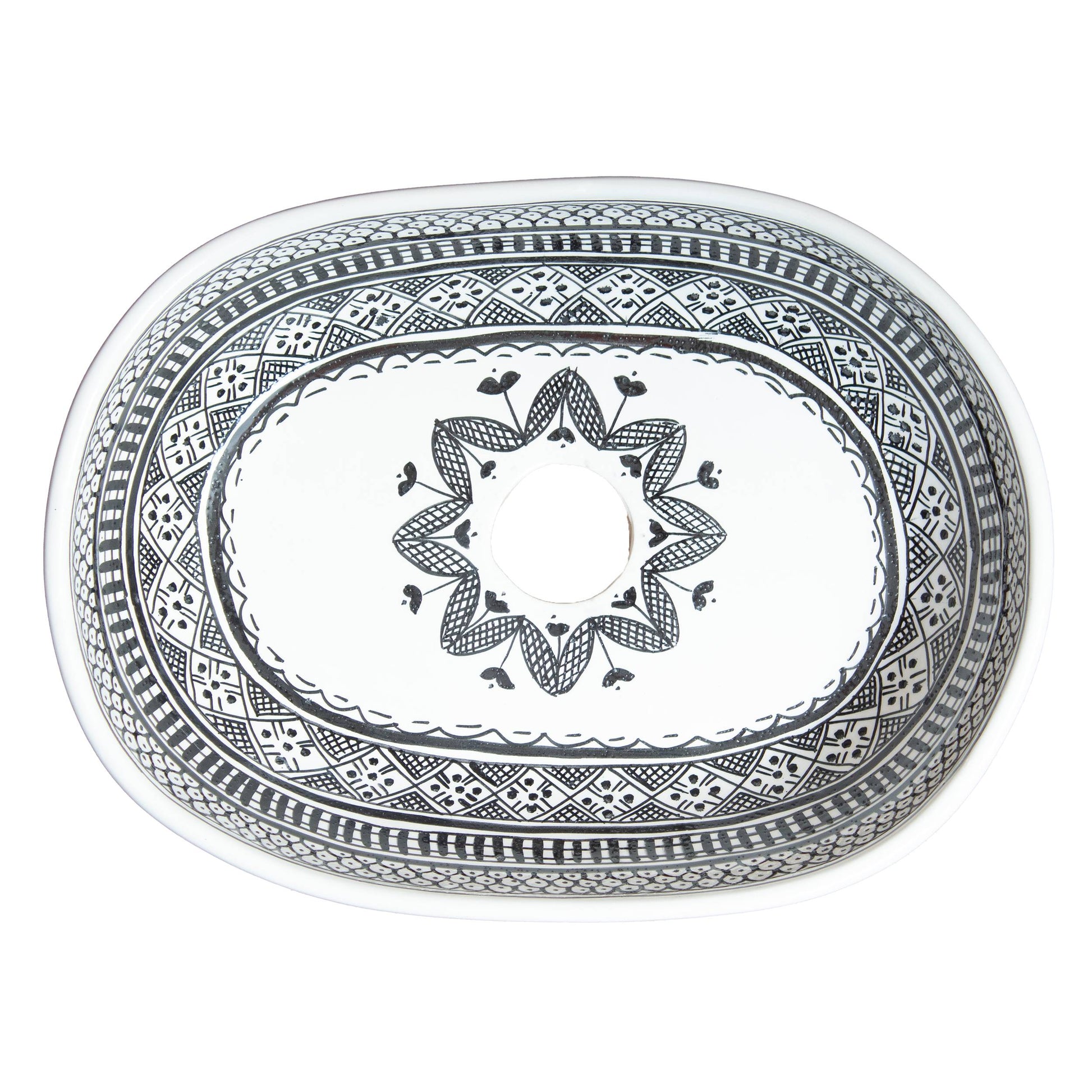 This sophisticated oval sink features intricate charcoal and black geometric band patterns hand-painted along the border. Multiple layers of lattice work, diamond shapes, and linear elements create a refined, elegant look. The neutral charcoal tones add visual interest while remaining versatile enough to work with any bathroom style.