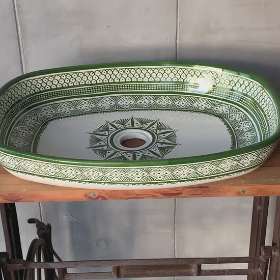This elegant oval sink features intricate emerald green geometric patterns hand-painted along the border, with a stunning starburst medallion at the center. The delicate lattice work and layered geometric designs are meticulously painted, creating a sophisticated, regal look. The rich emerald tones bring depth and luxury to your bathroom.