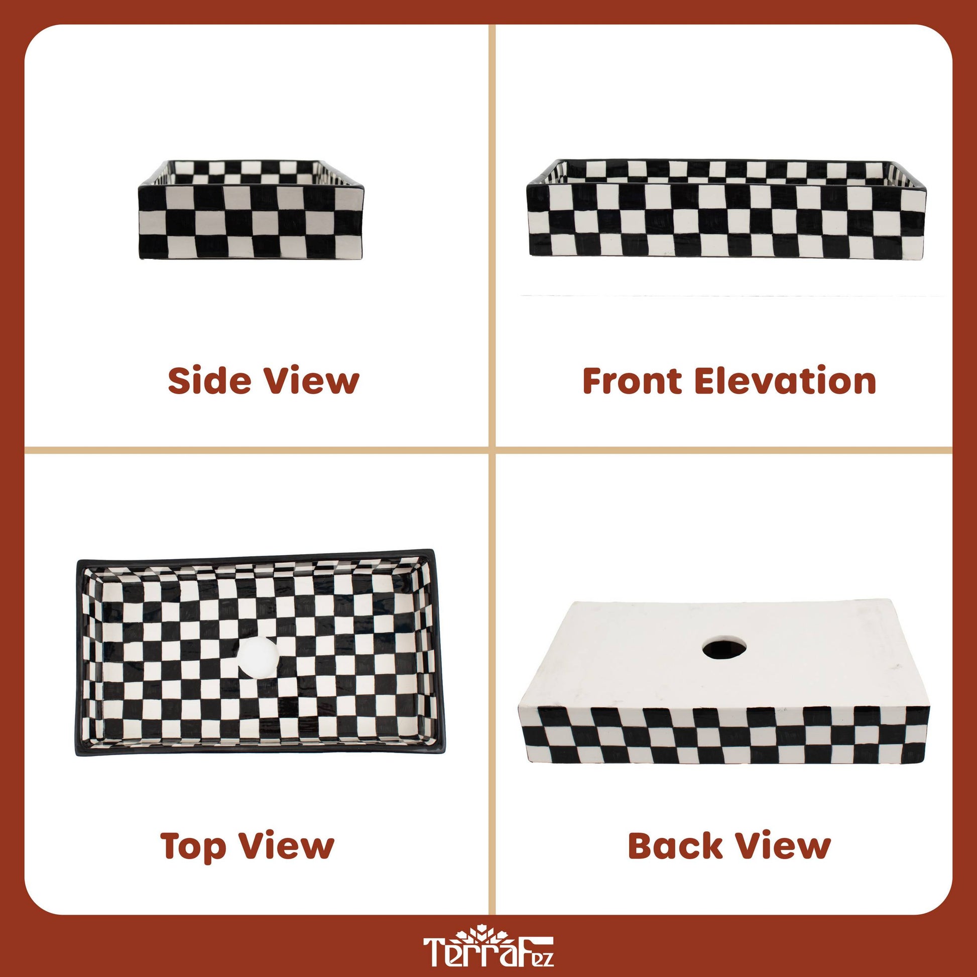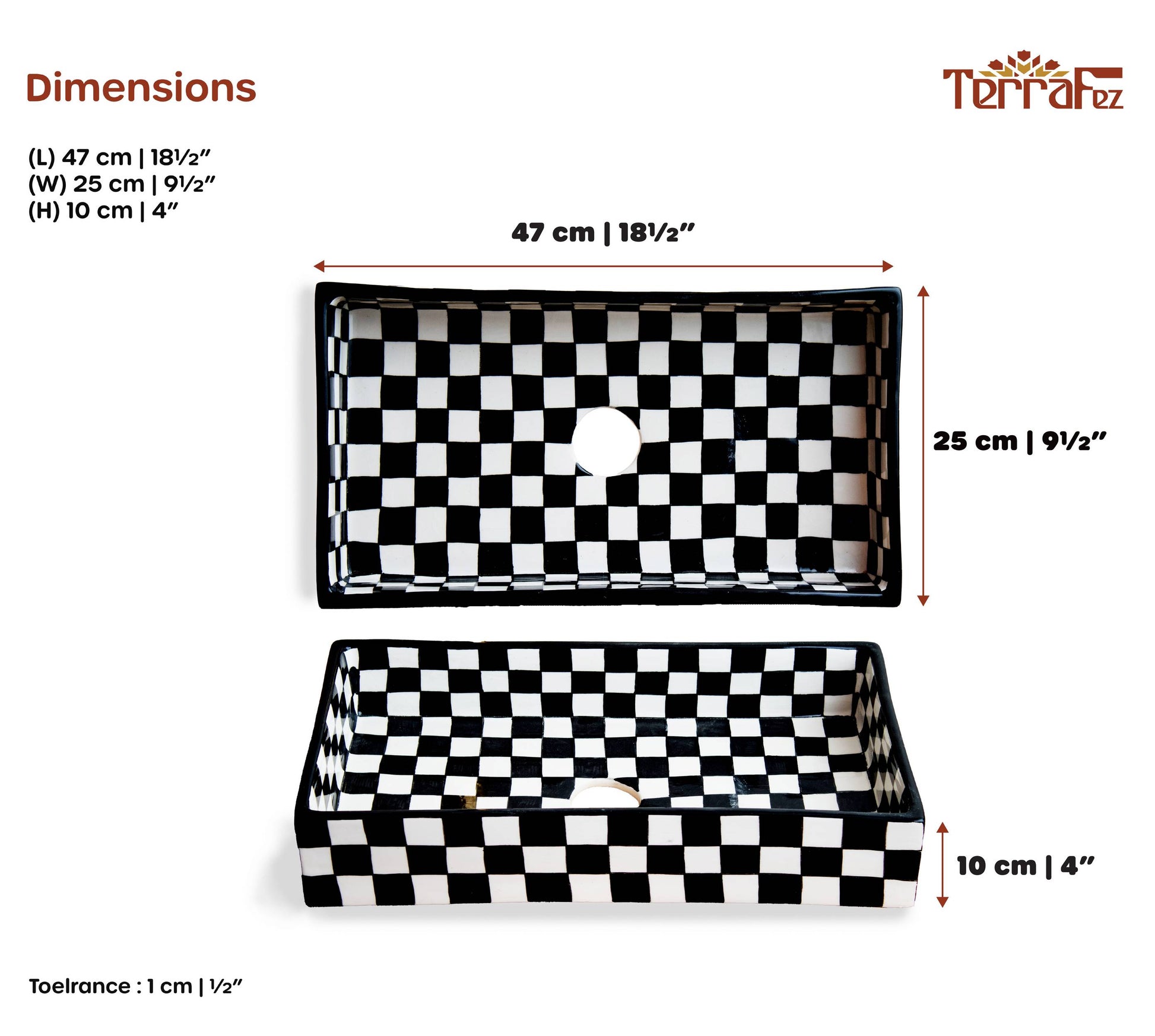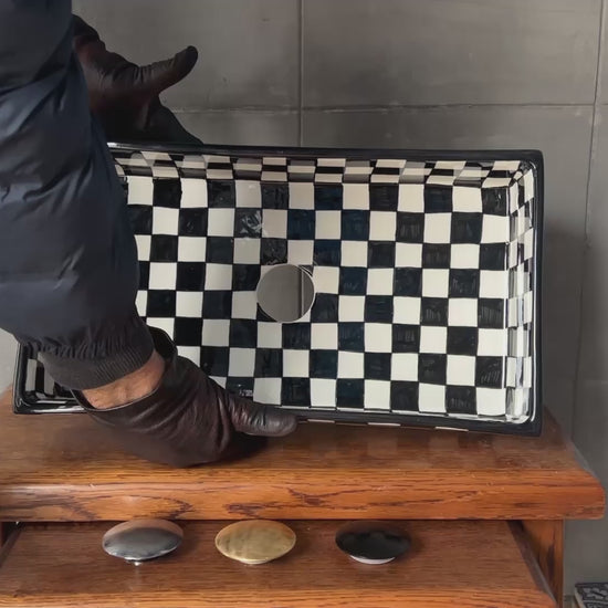 Bold black and white checkerboard patterns cover this striking rectangular sink. The artisans hand-paint each square individually, creating a playful yet sophisticated geometric design. The high-contrast pattern makes a dramatic statement perfect for modern, retro, or eclectic bathroom styles.