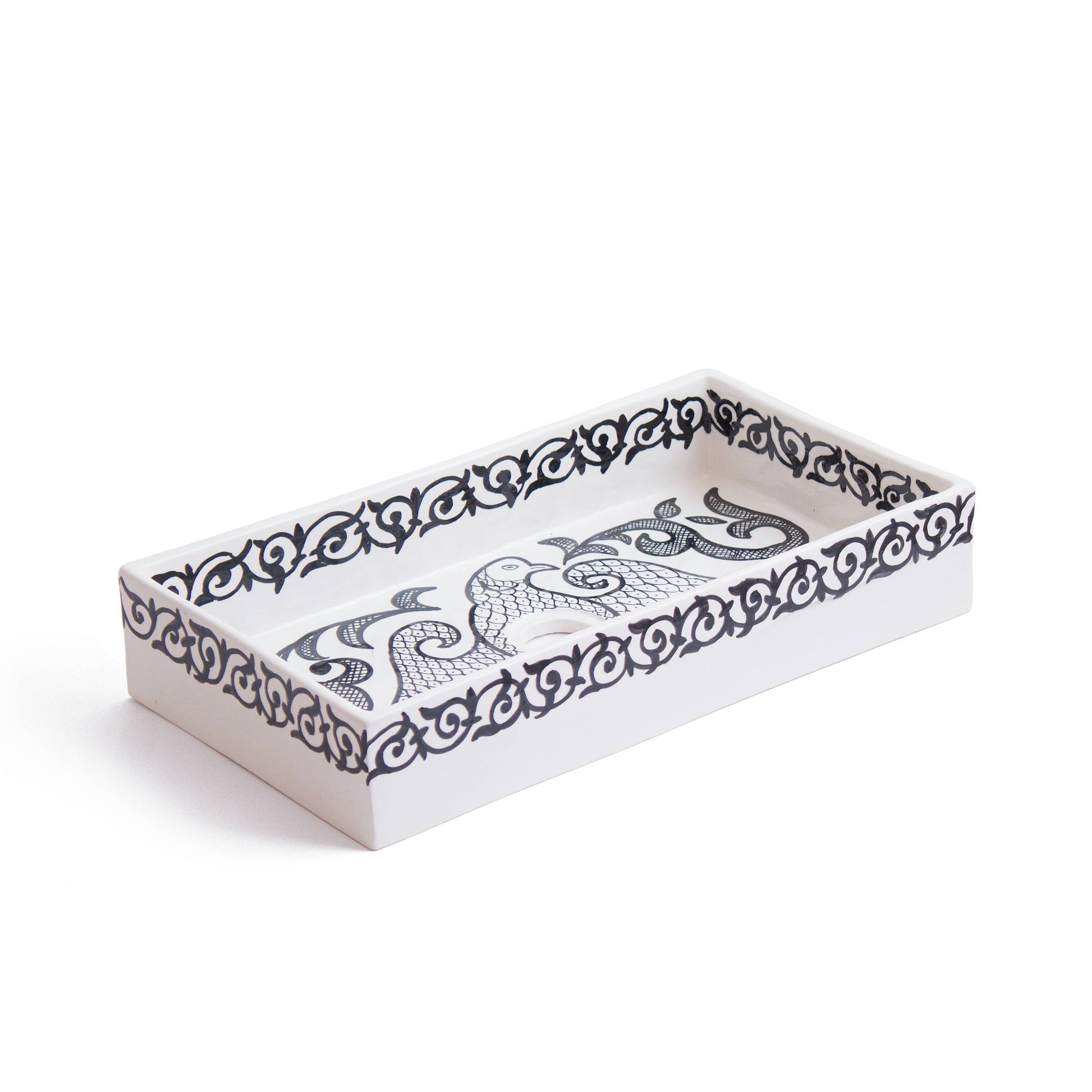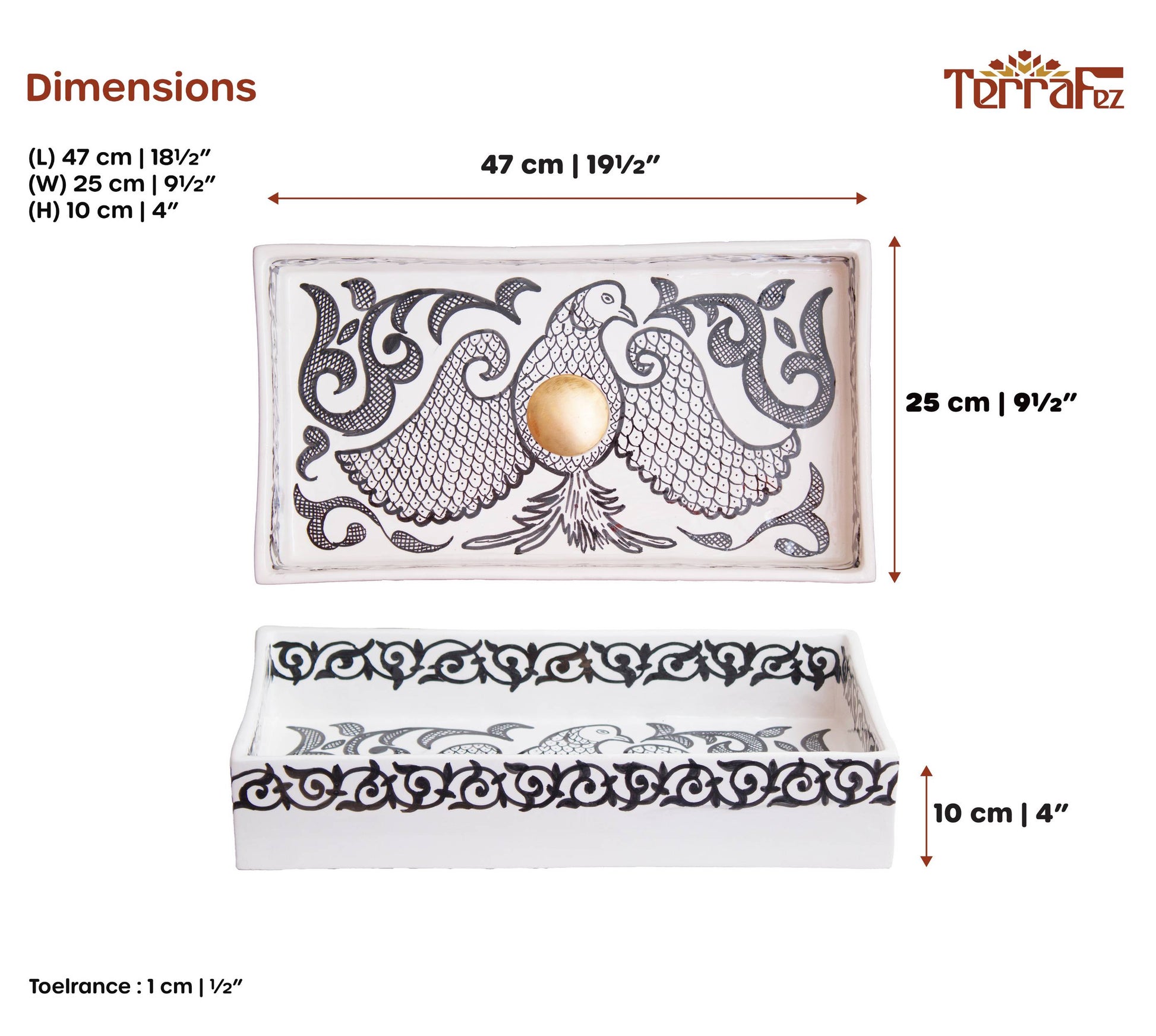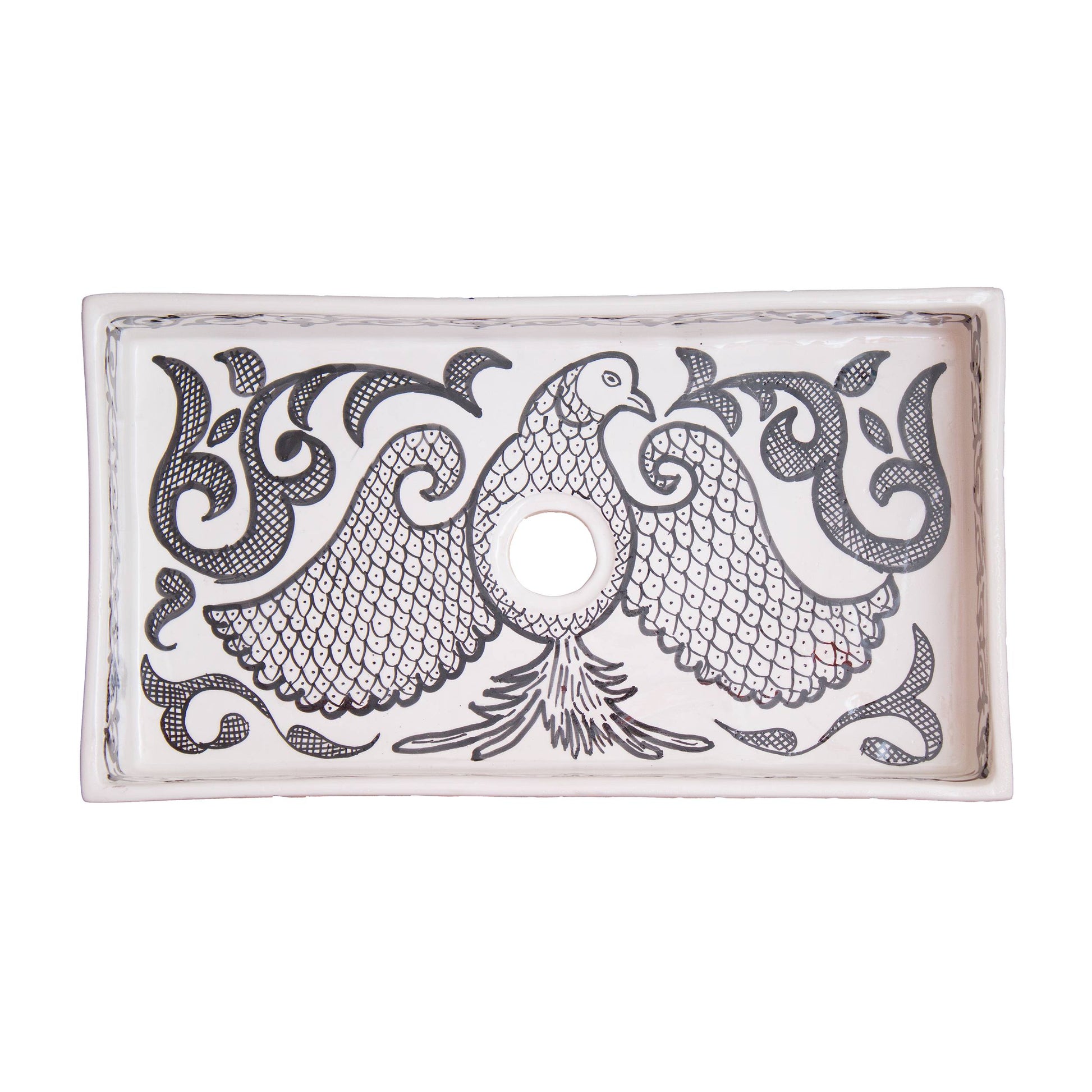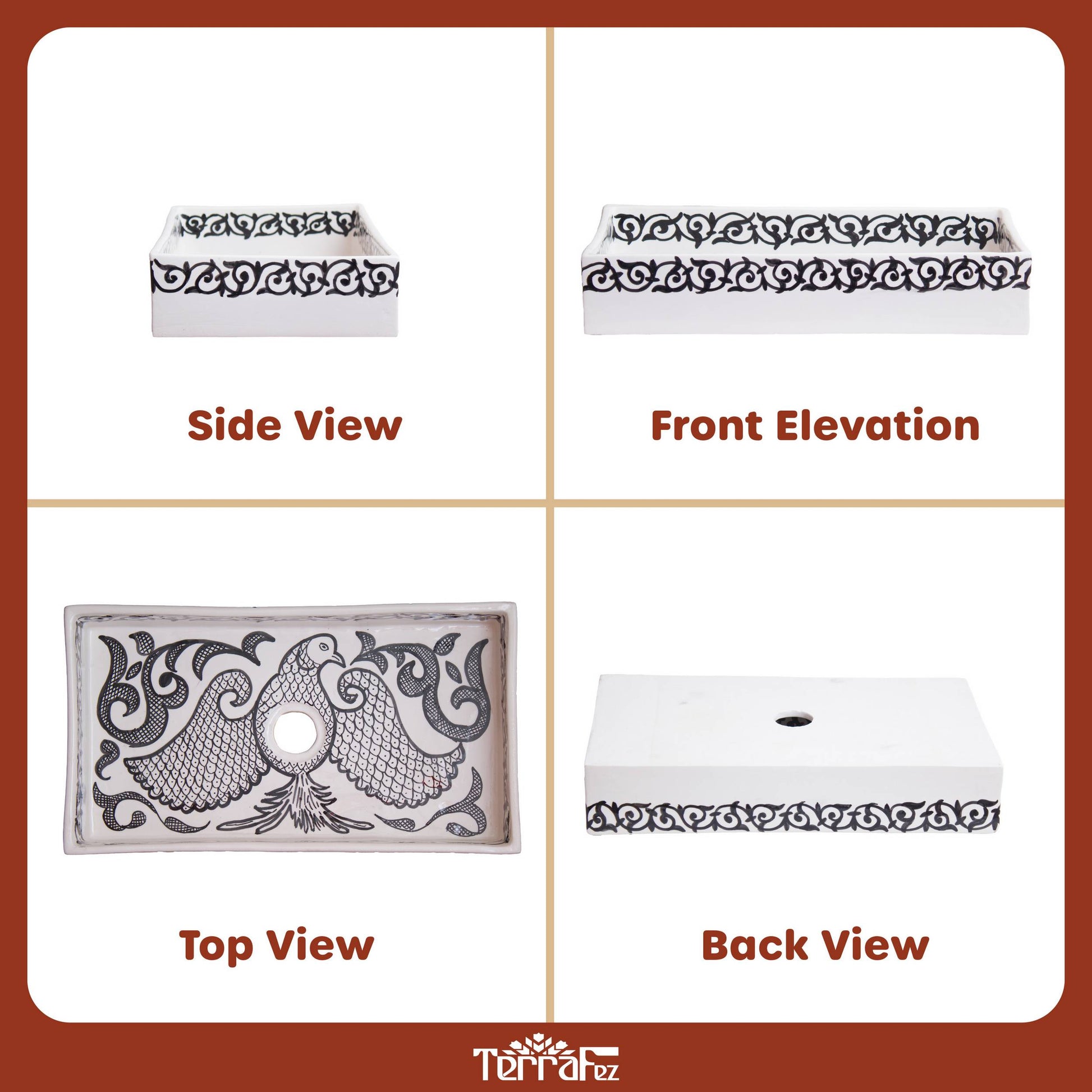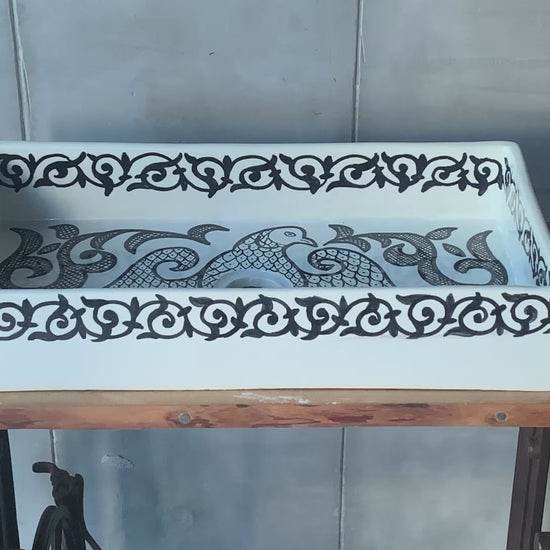 Elegant charcoal gray scroll patterns and peacock motifs create a sophisticated design on this rectangular sink. The artisans paint each decorative swirl and the central peacock by hand, creating an artistic piece that combines traditional Moroccan symbolism with timeless elegance. The gray tones are refined and versatile.