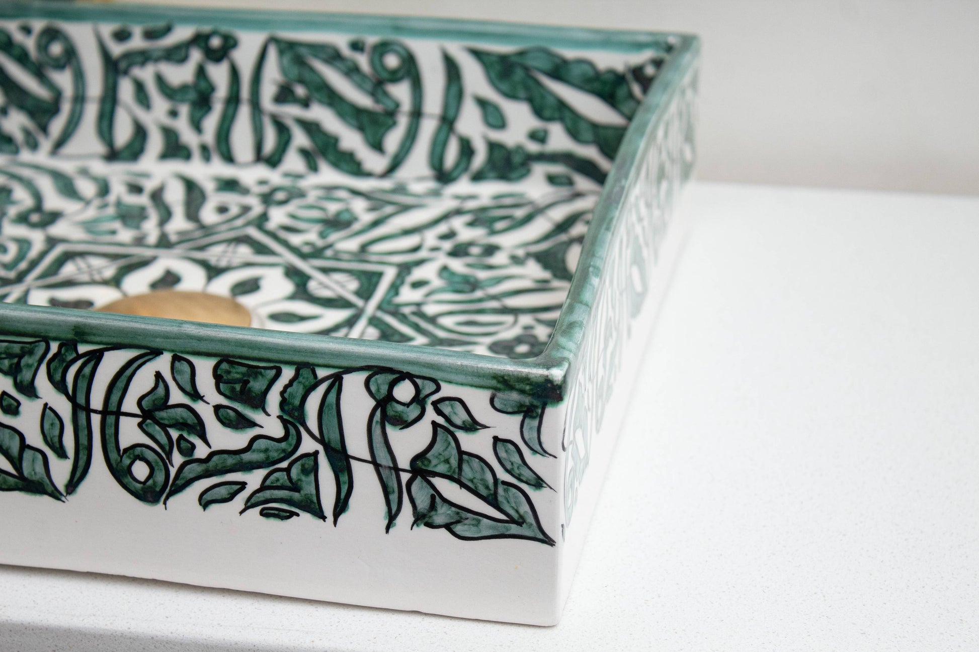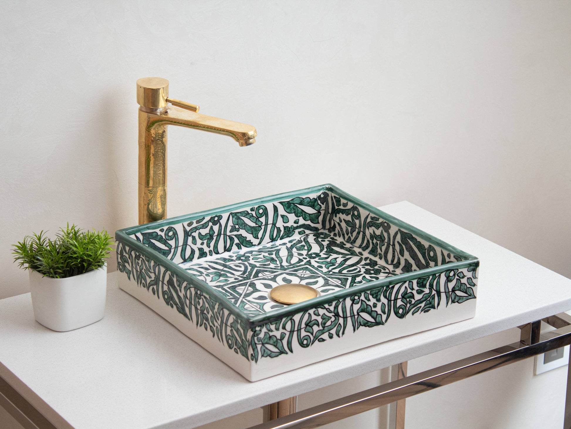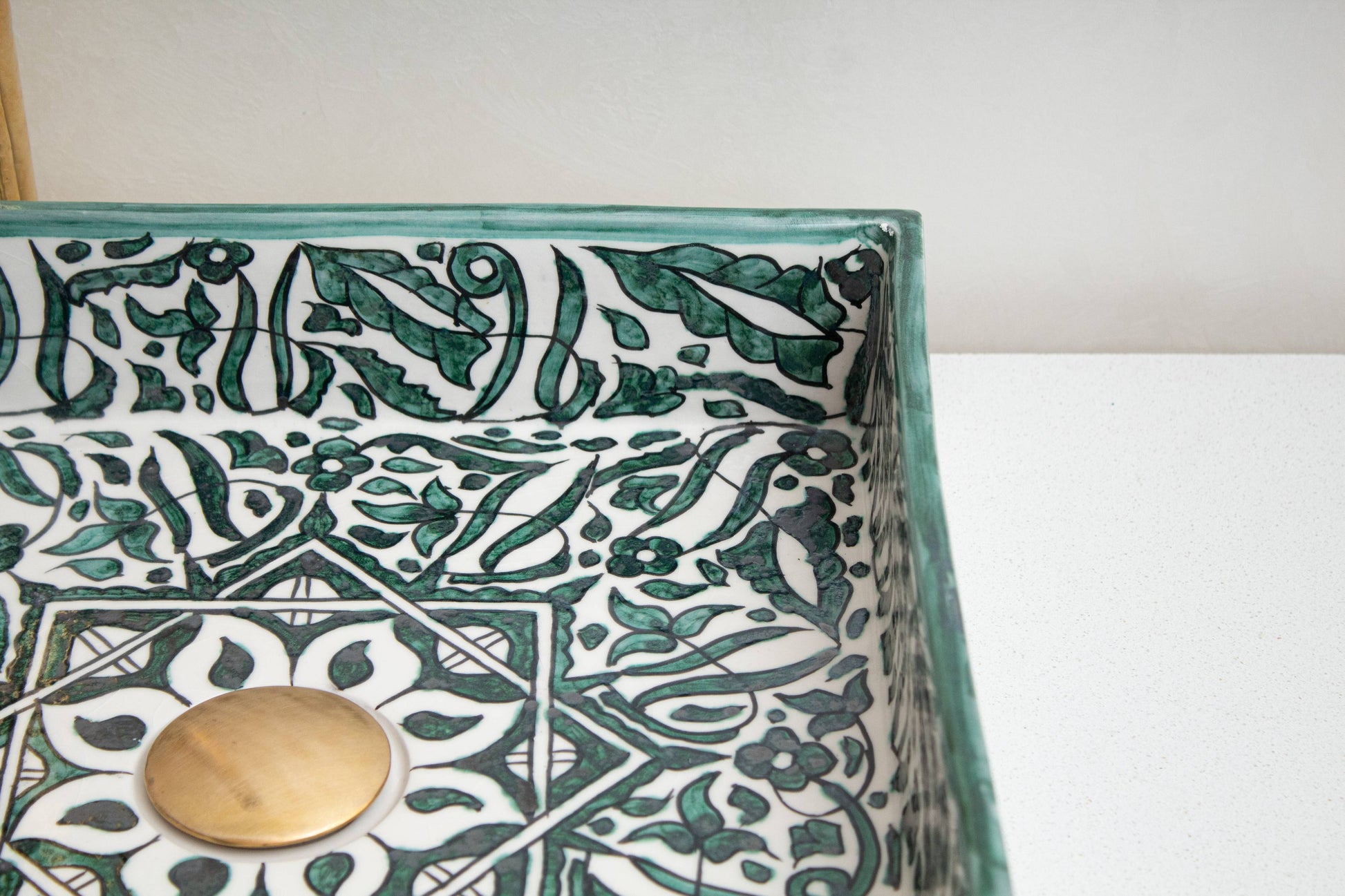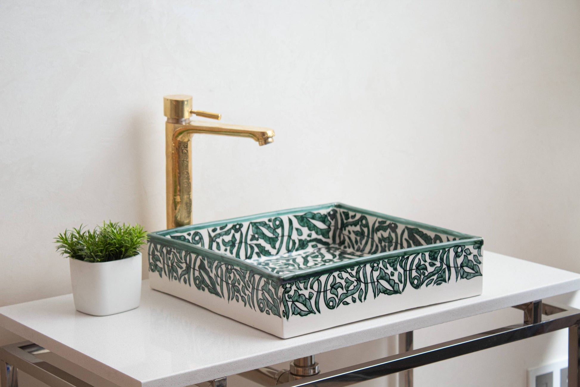 This elegant square sink features intricate forest green arabesque patterns hand-painted throughout the interior and exterior. The flowing organic designs inspired by traditional Islamic art are meticulously painted, creating a sophisticated, earthy look. The deep green tones bring natural elegance and depth to your bathroom.