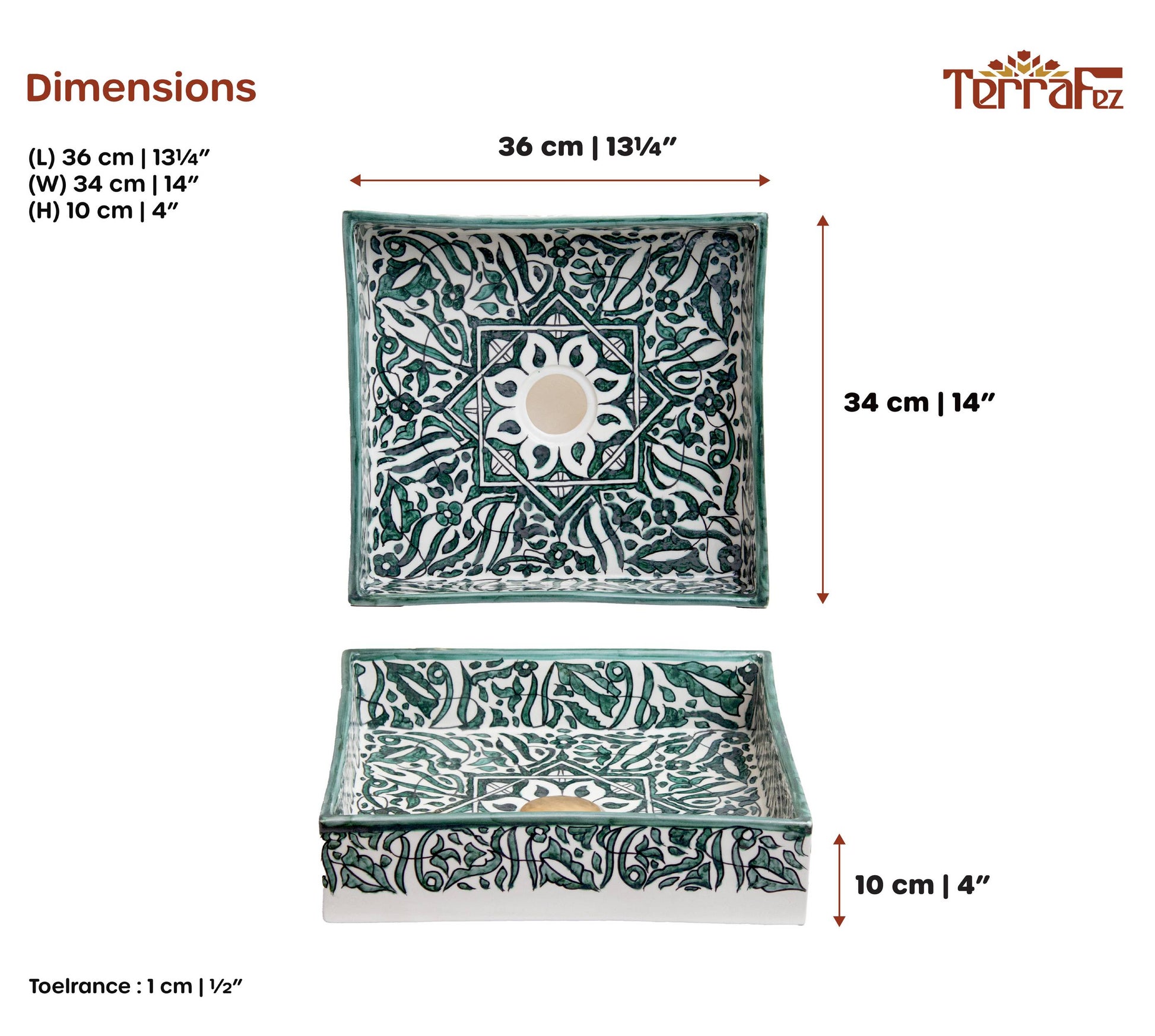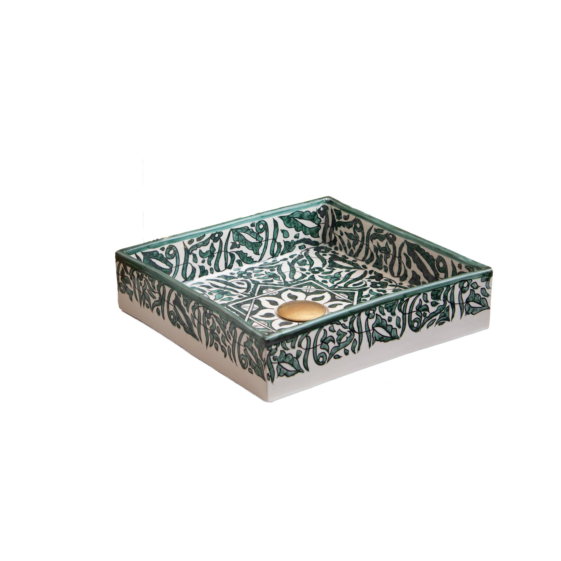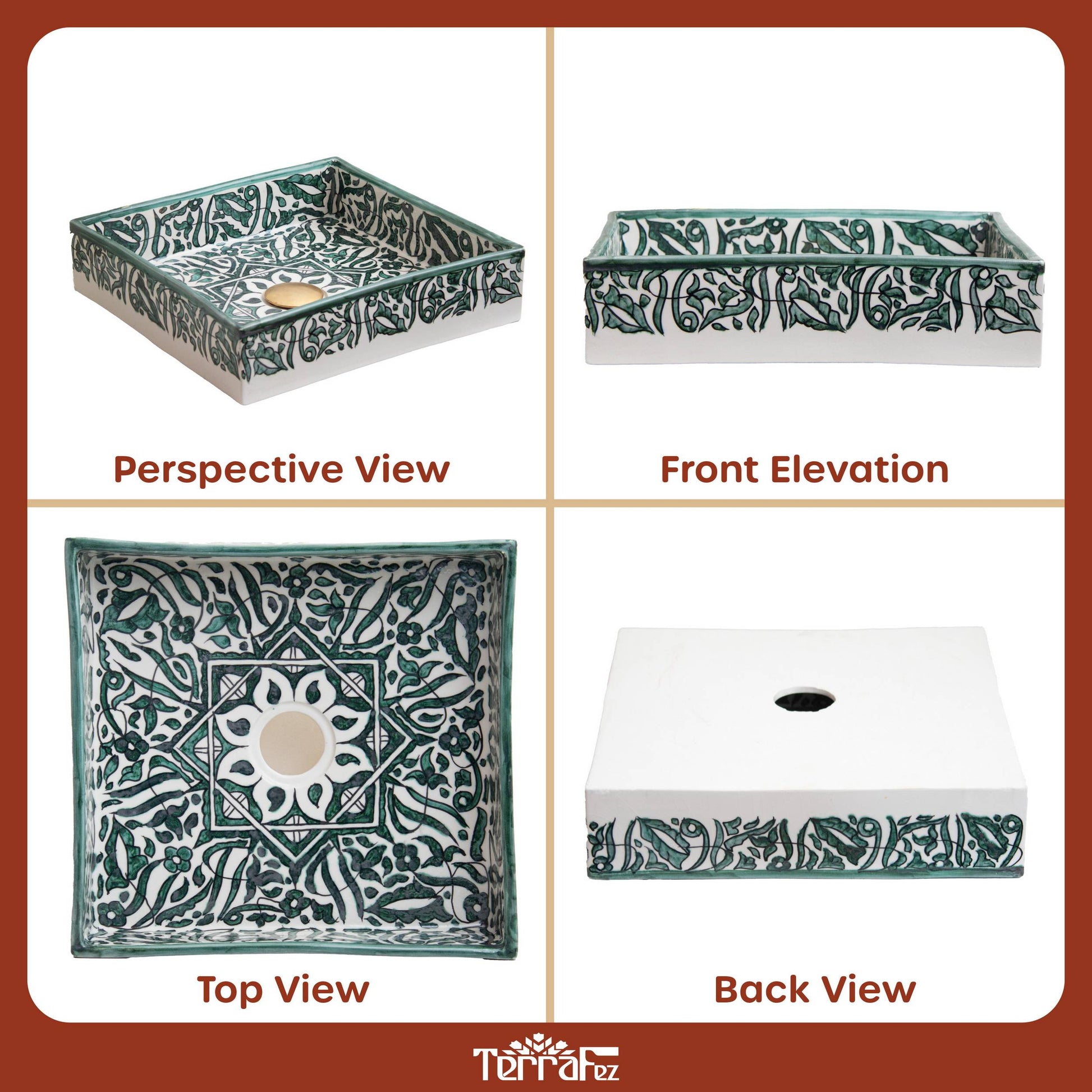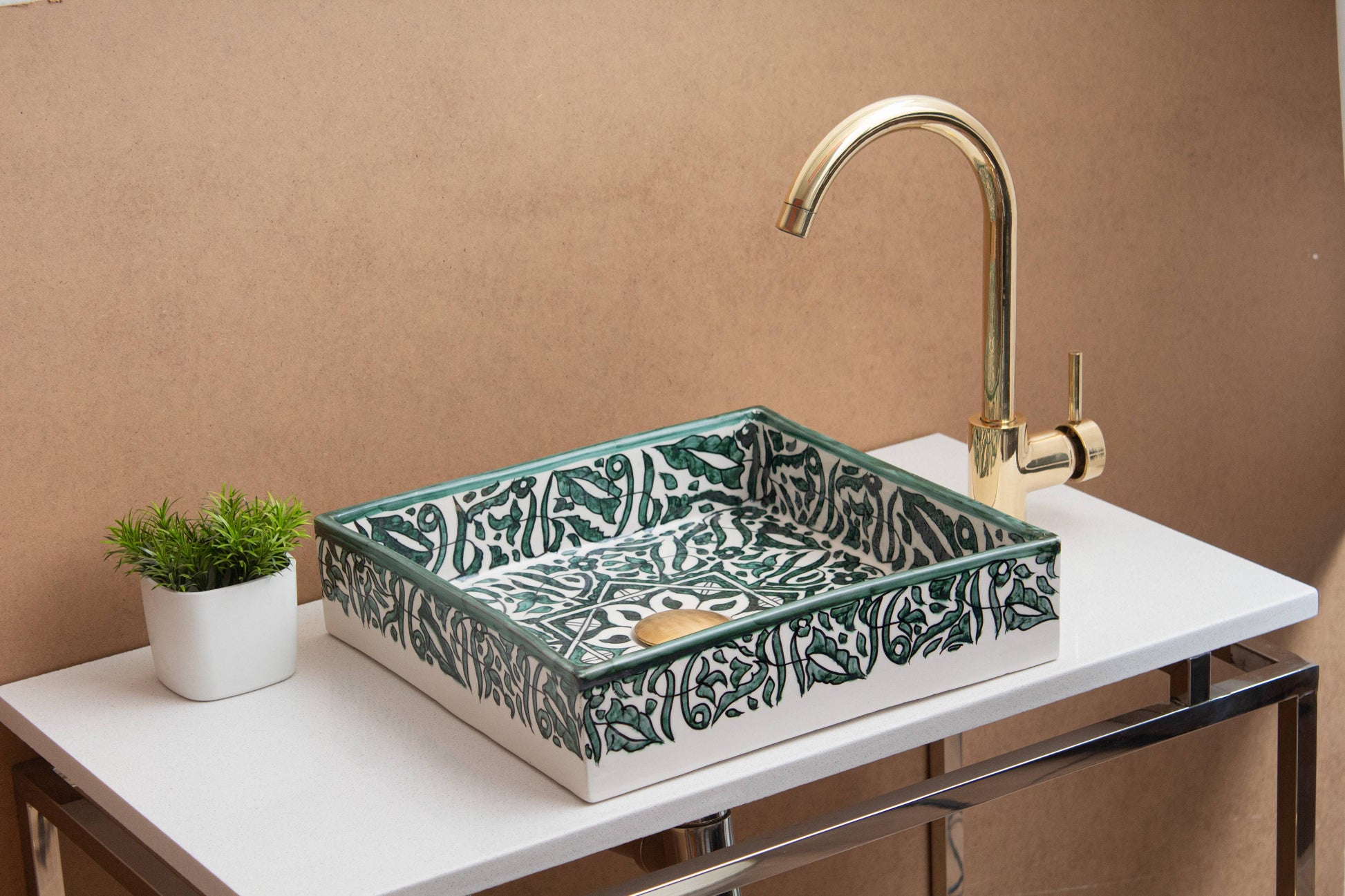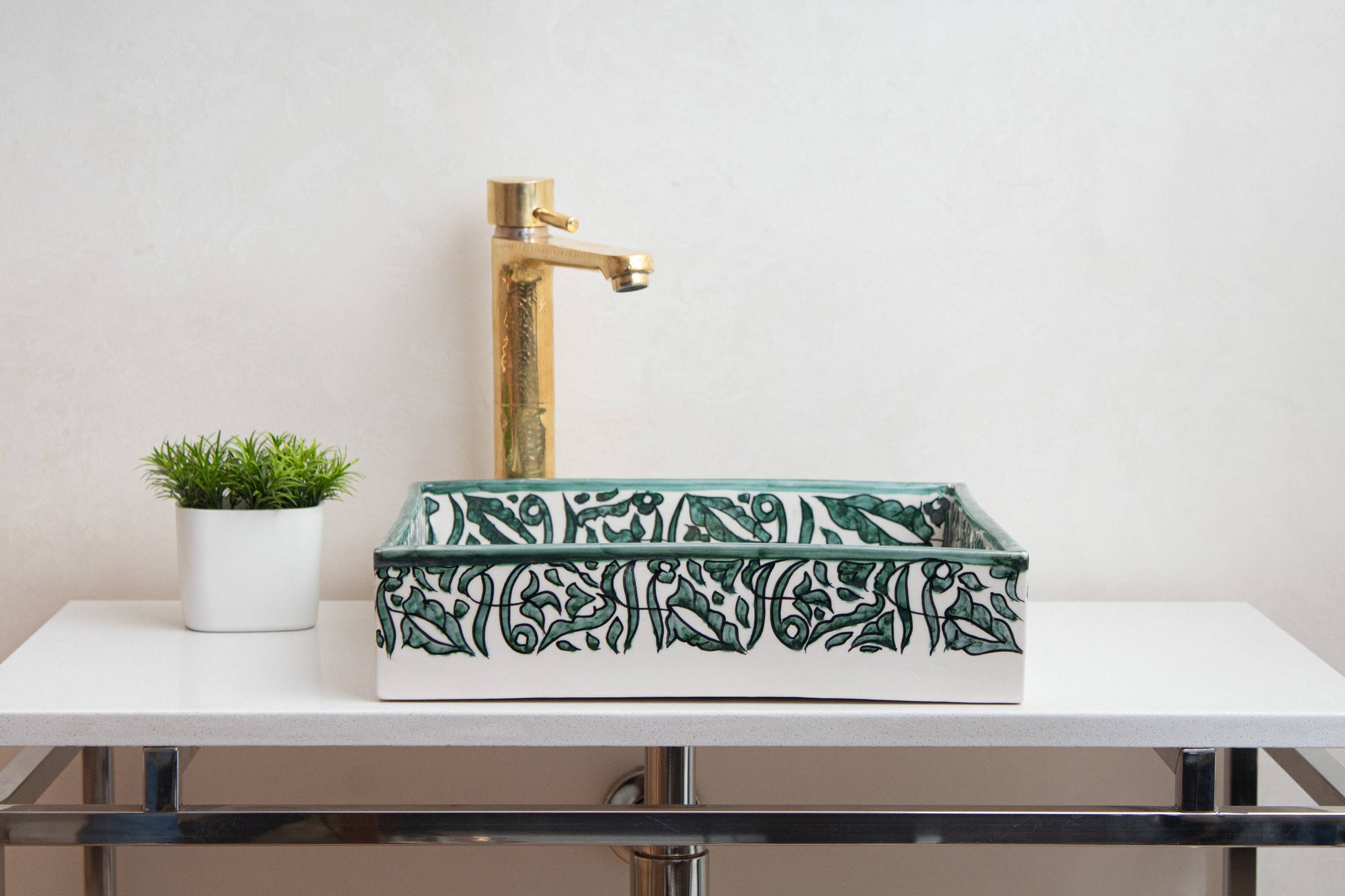 This elegant square sink features intricate forest green arabesque patterns hand-painted throughout the interior and exterior. The flowing organic designs inspired by traditional Islamic art are meticulously painted, creating a sophisticated, earthy look. The deep green tones bring natural elegance and depth to your bathroom.
