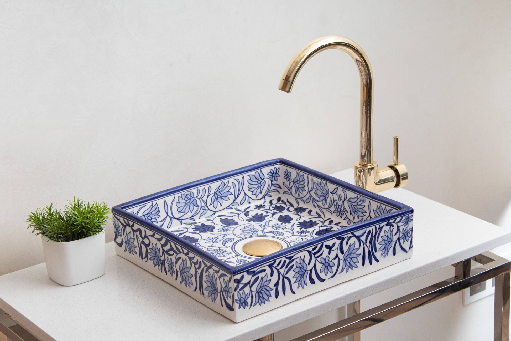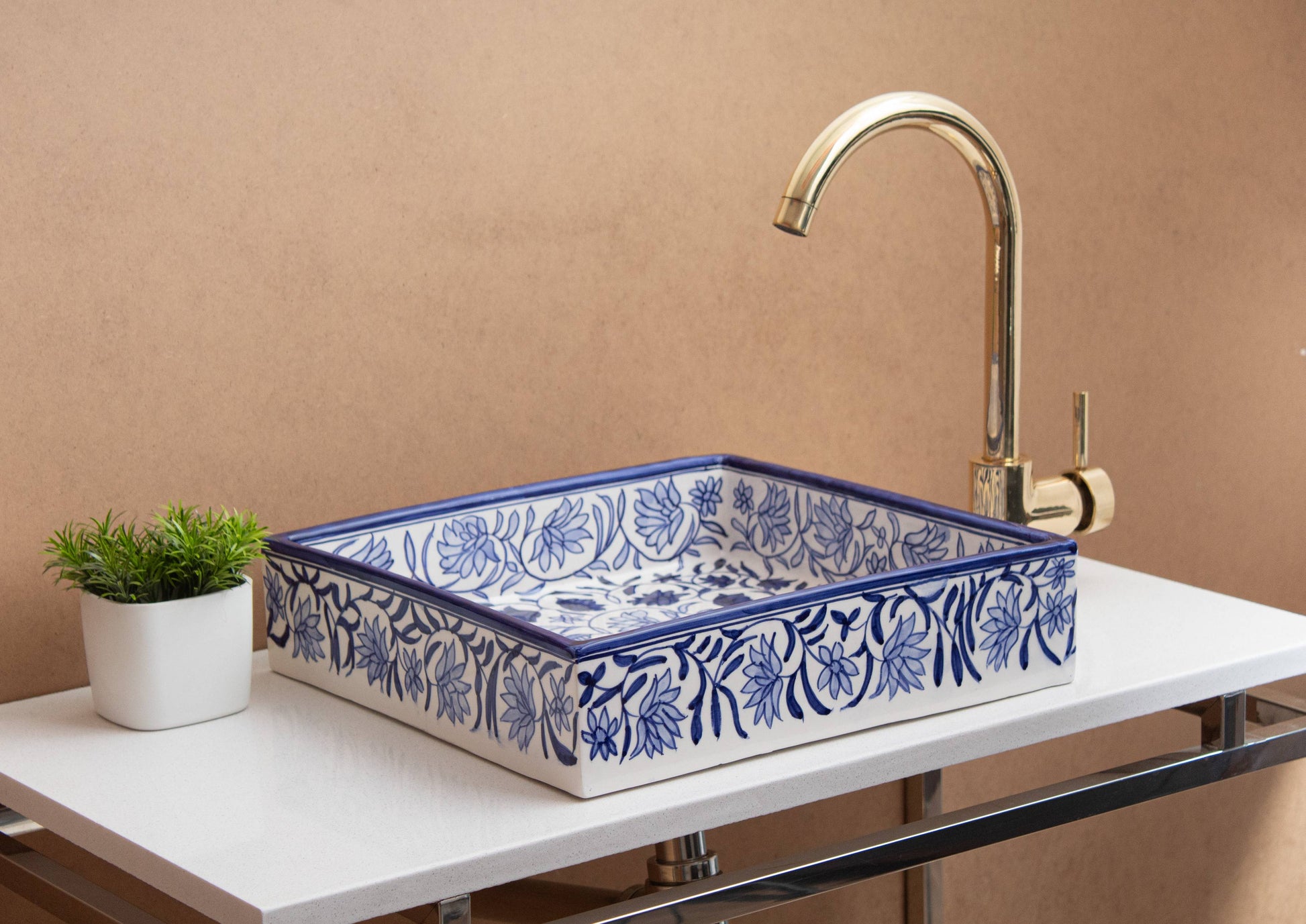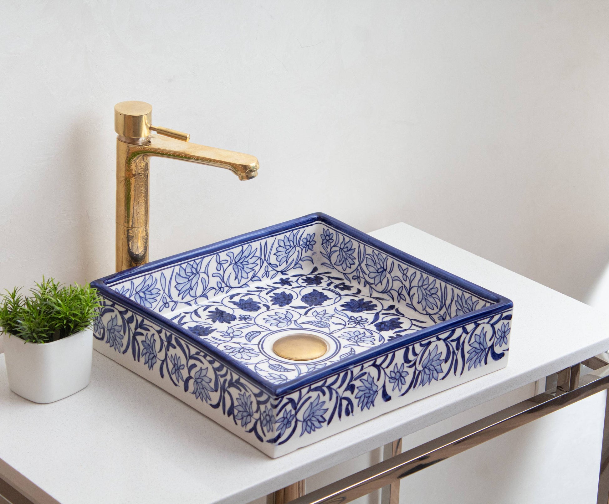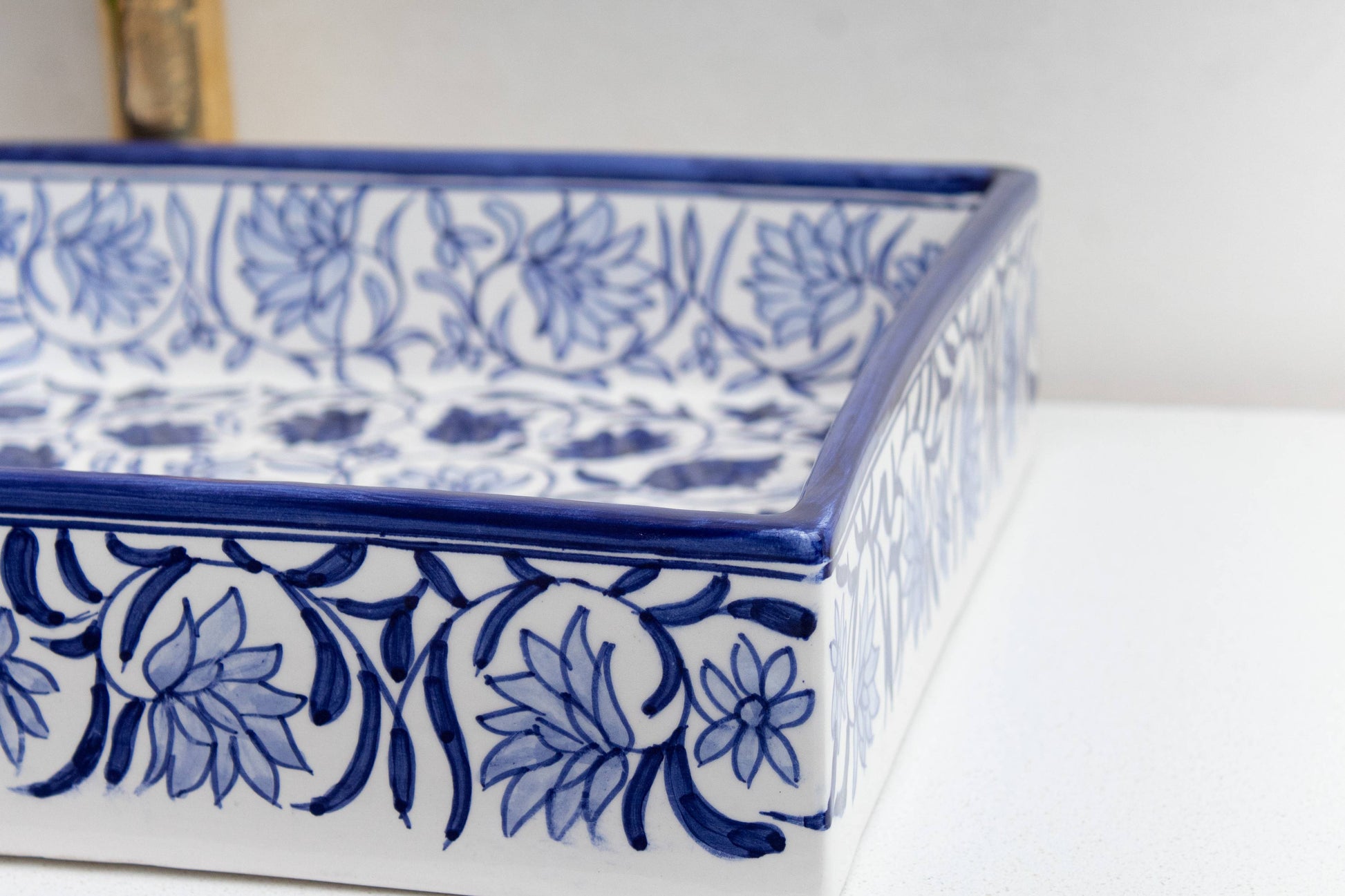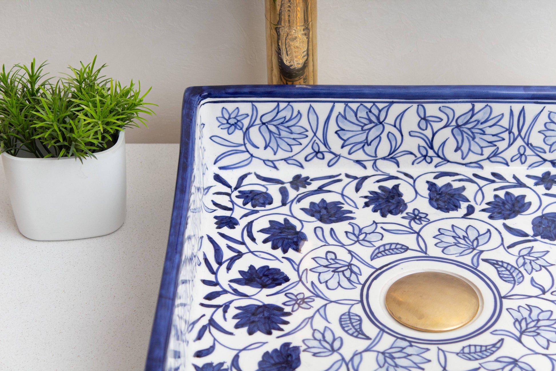 This stunning square sink features intricate cobalt blue floral arabesque patterns hand-painted throughout the interior and exterior. The flowing organic designs combine delicate flowers with traditional Islamic art motifs, creating a rich, luxurious look. Each curving line and petal is meticulously painted by hand with exceptional detail.