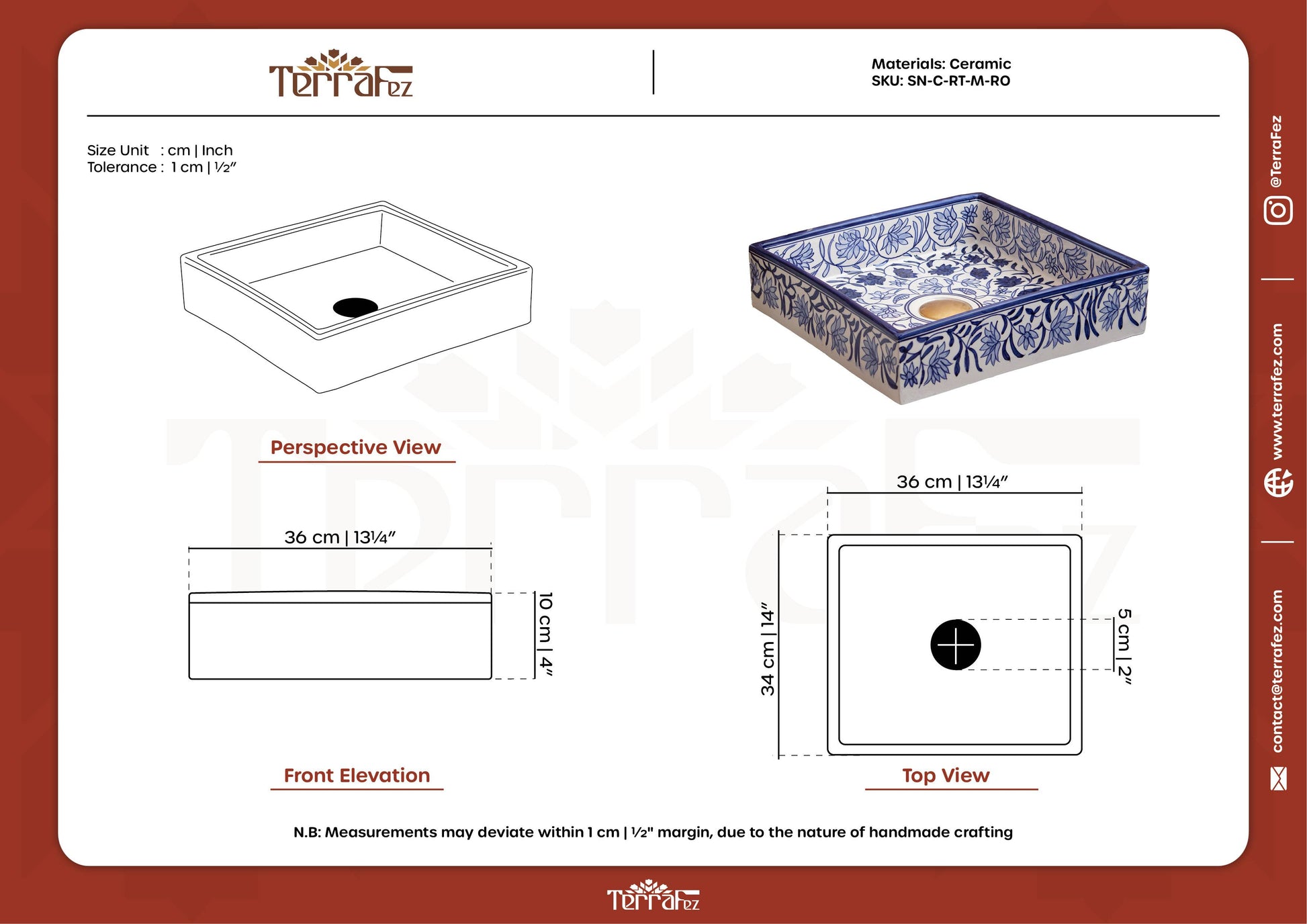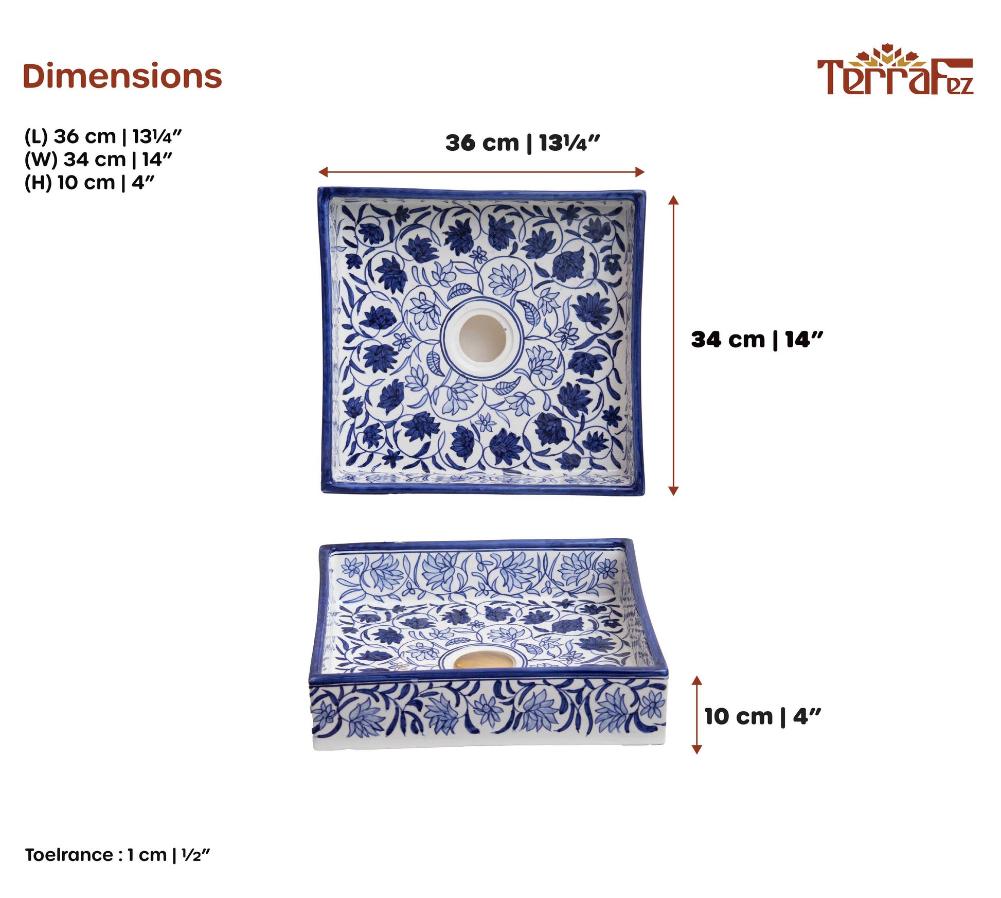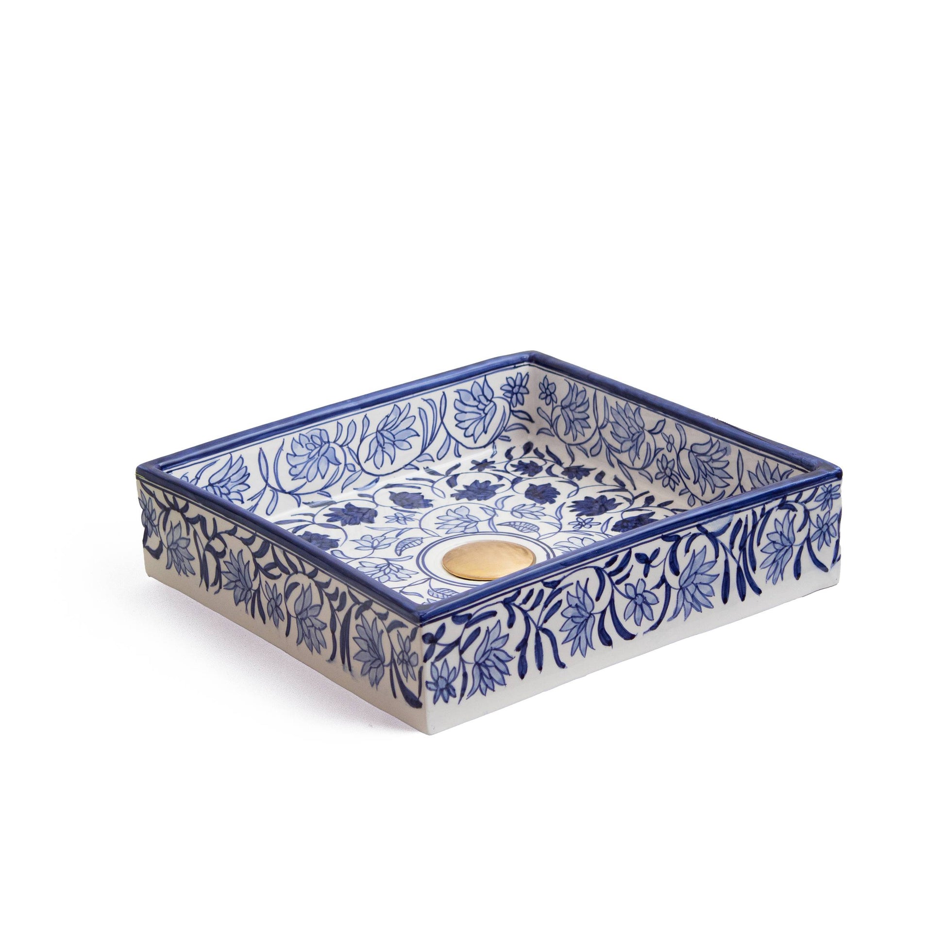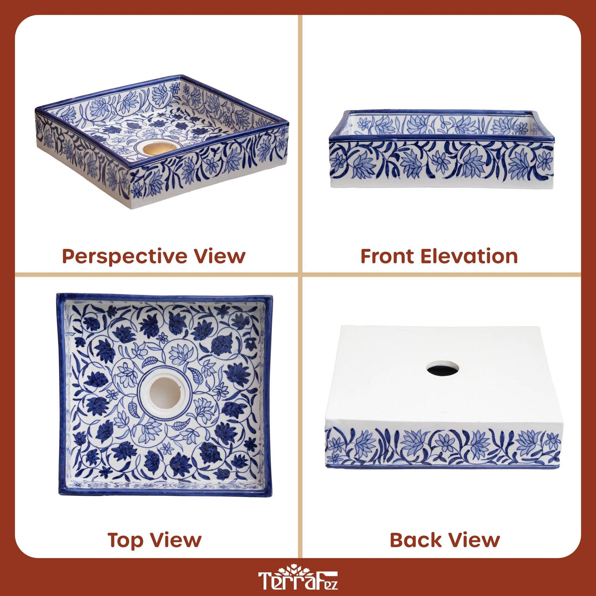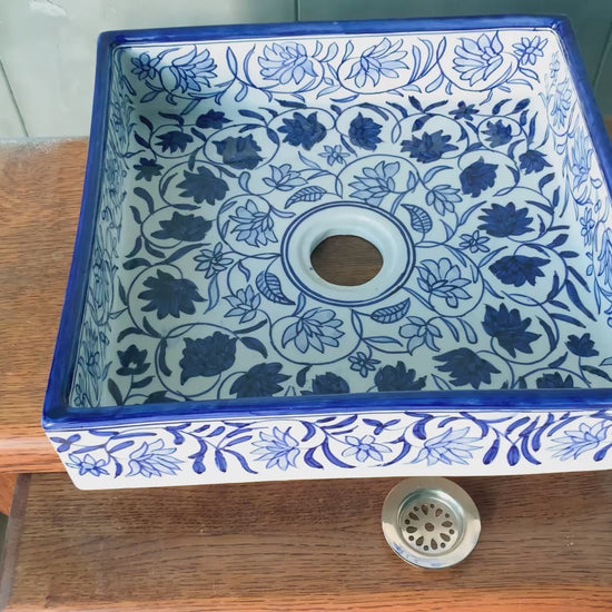 This stunning square sink features intricate cobalt blue floral arabesque patterns hand-painted throughout the interior and exterior. The flowing organic designs combine delicate flowers with traditional Islamic art motifs, creating a rich, luxurious look. Each curving line and petal is meticulously painted by hand with exceptional detail.