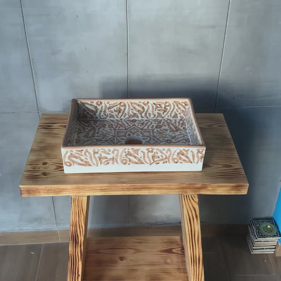 This elegant mini rectangular sink features intricate terracotta and brown arabesque patterns hand-painted on all sides and interior. The flowing organic designs inspired by traditional Islamic art are meticulously painted, creating a warm, earthy look. The terracotta tones bring natural warmth to small bathroom spaces.