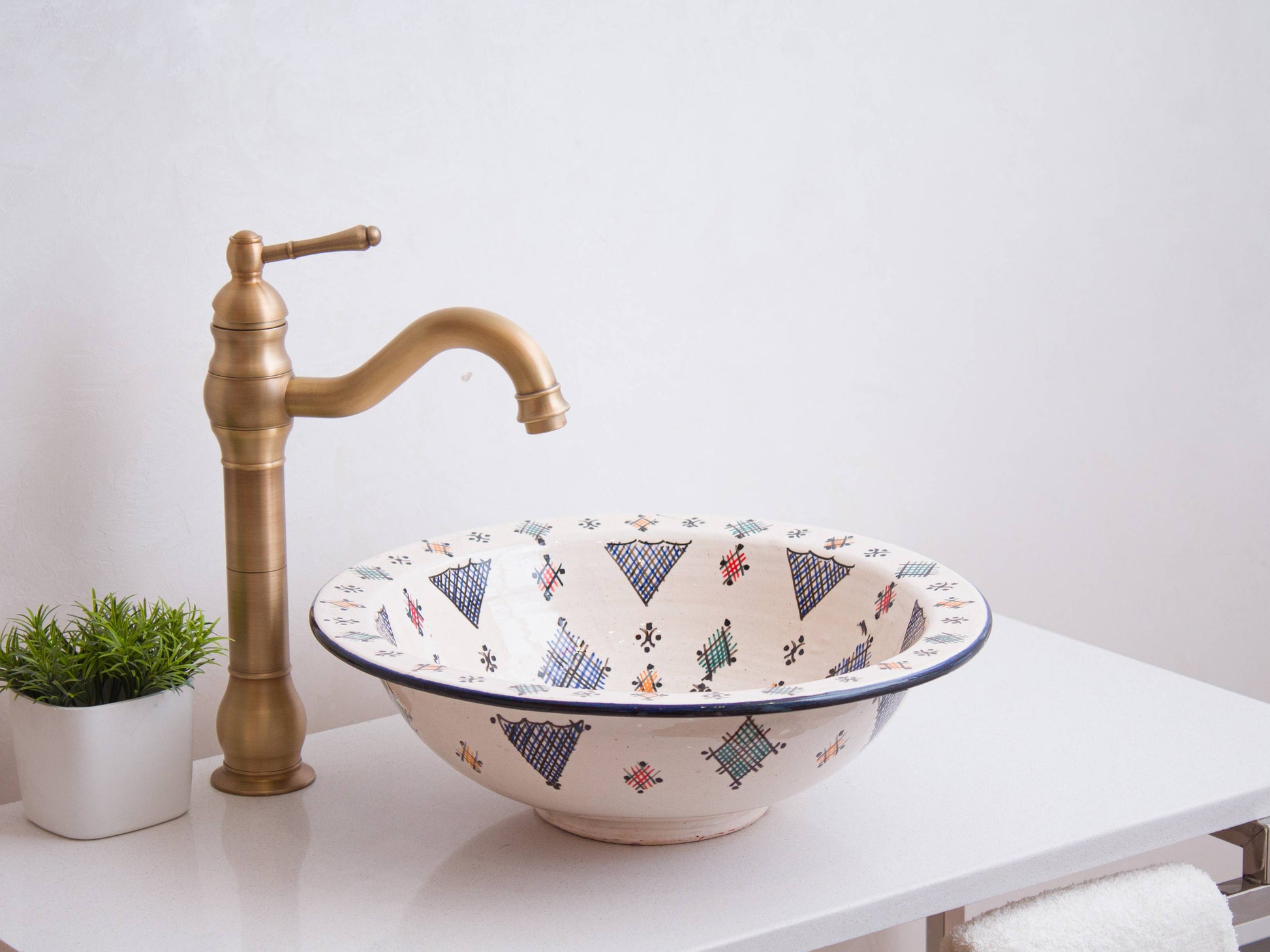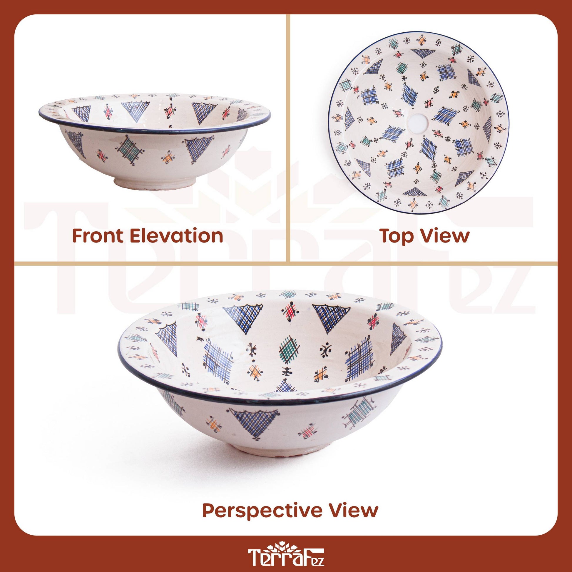 Blue and yellow weave patterns cover the sink, inspired by Moroccan texture. The artisans paint each shape by hand with fine brushes, so you'll see small differences that make yours different from anyone else's. The blue against white color really pops and gives your bathroom something special to look at.