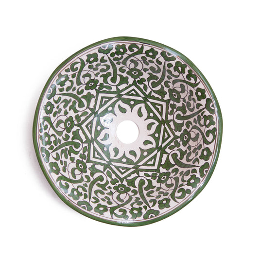 • perspective view of handcrafted square ceramic basin featuring green and white geometric pattern with radial design
