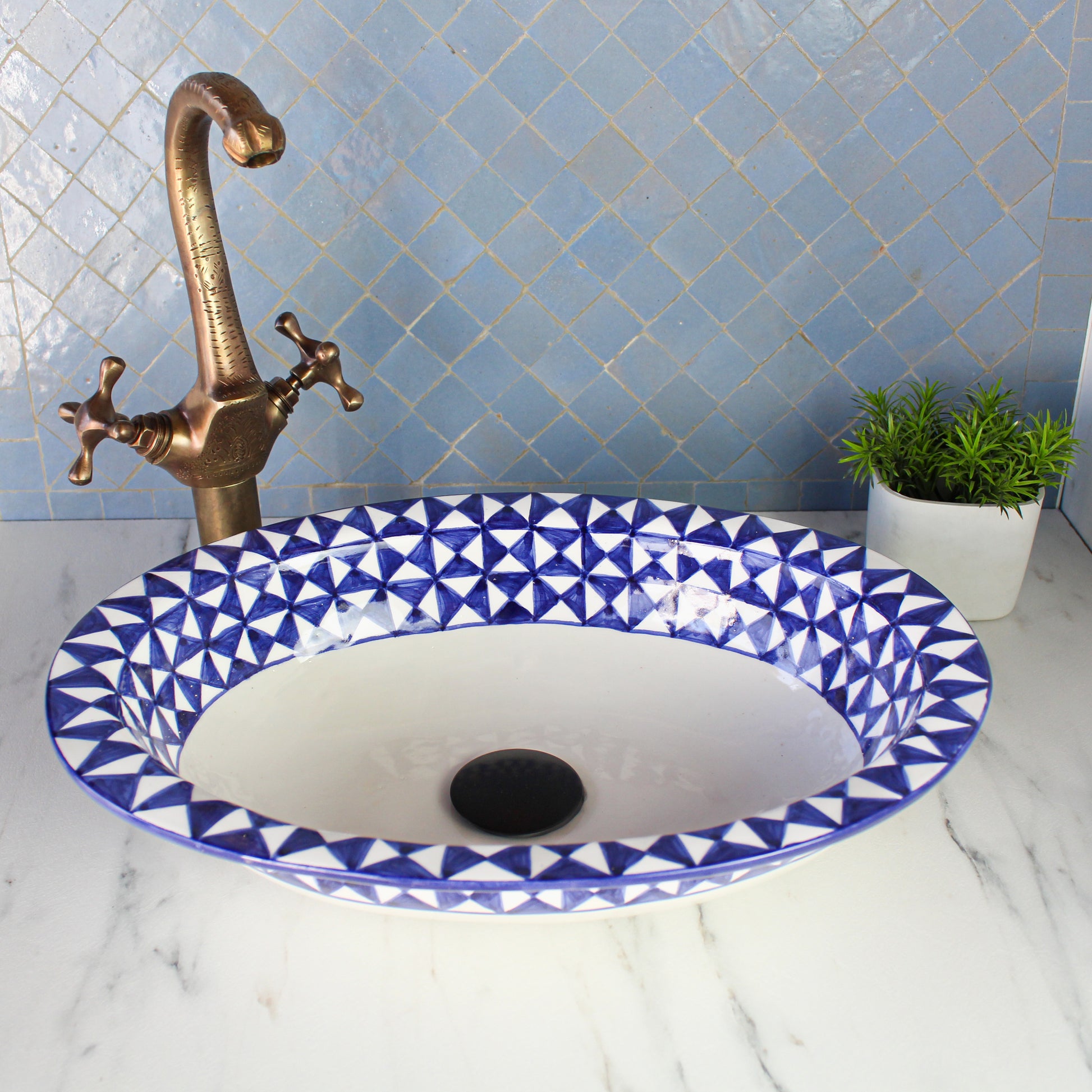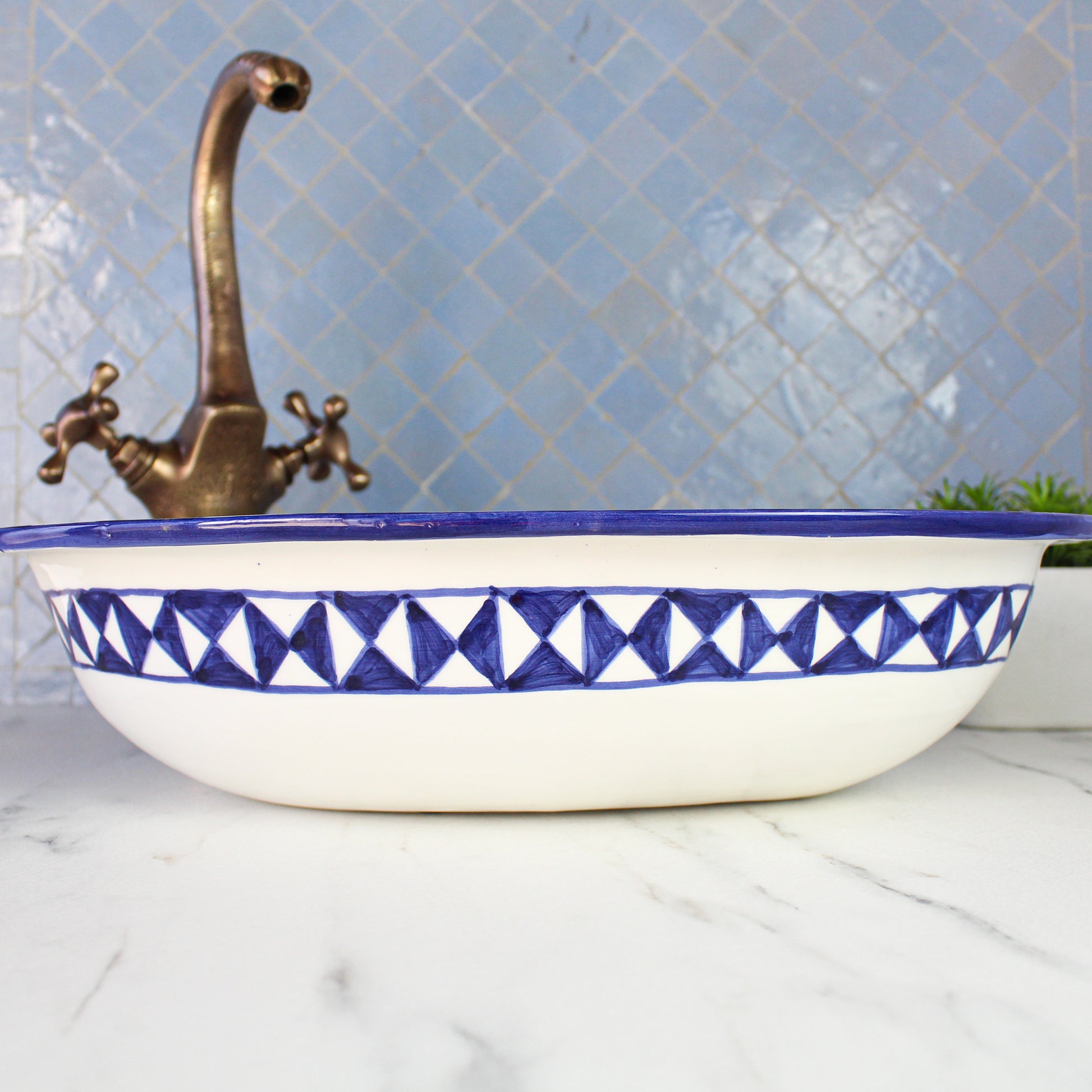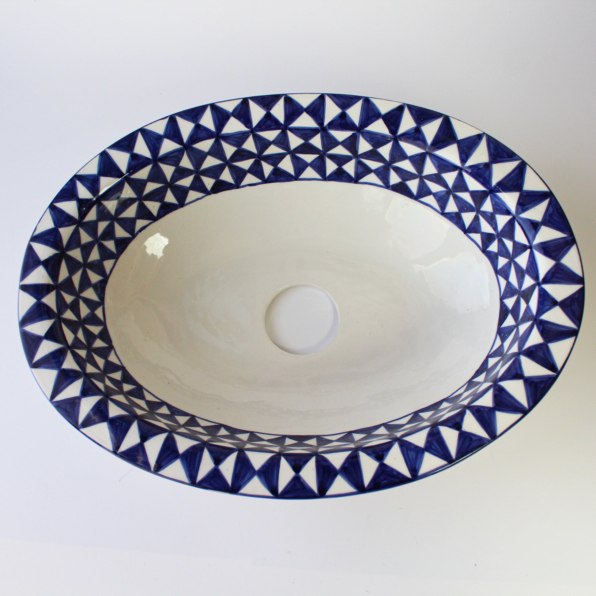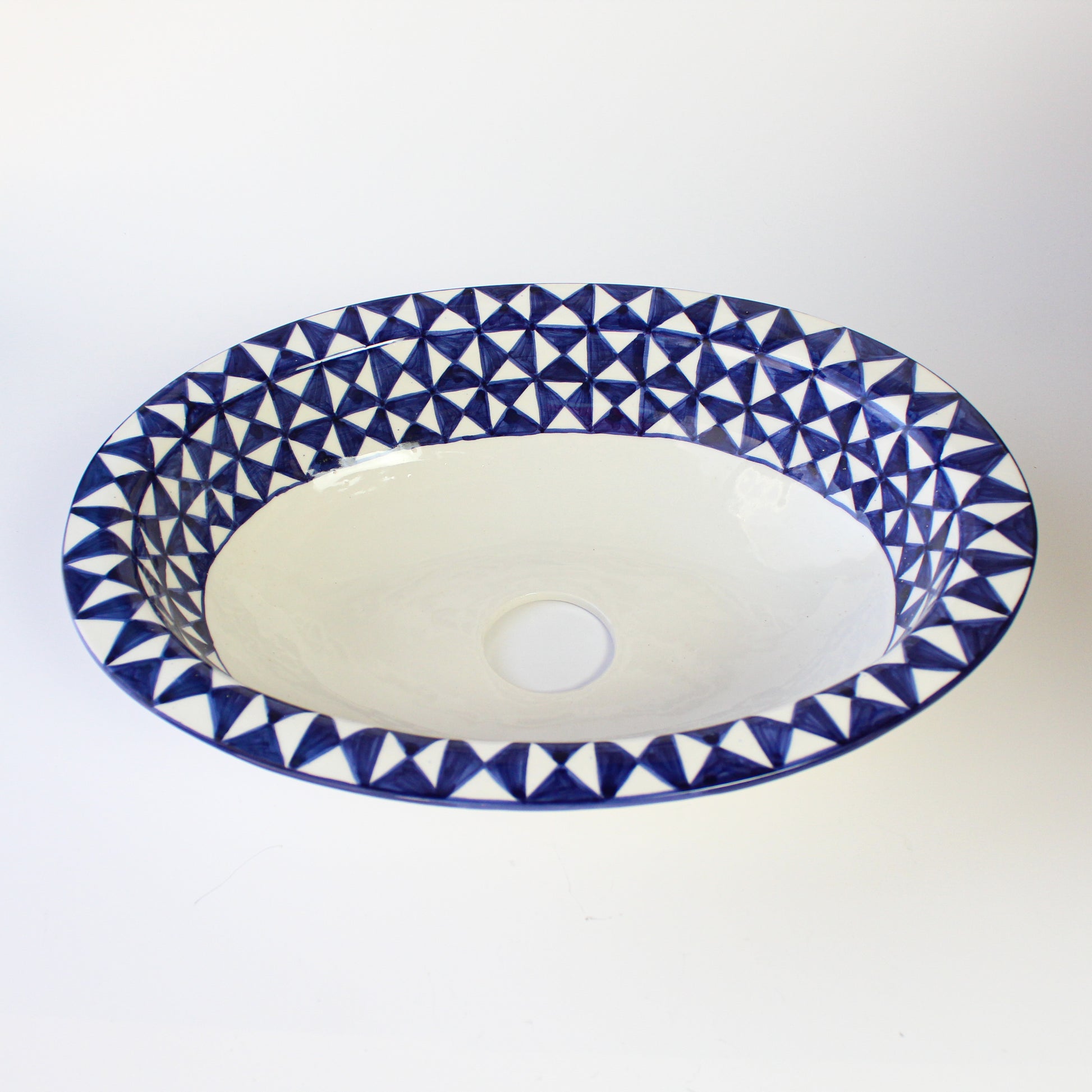 Lavabo a vasca ovale in ceramica con design a bordo piatto. Modelliamo ogni pezzo a mano nel nostro laboratorio, poi dipingiamo i motivi caleidoscopio individualmente usando forme geometriche blu.