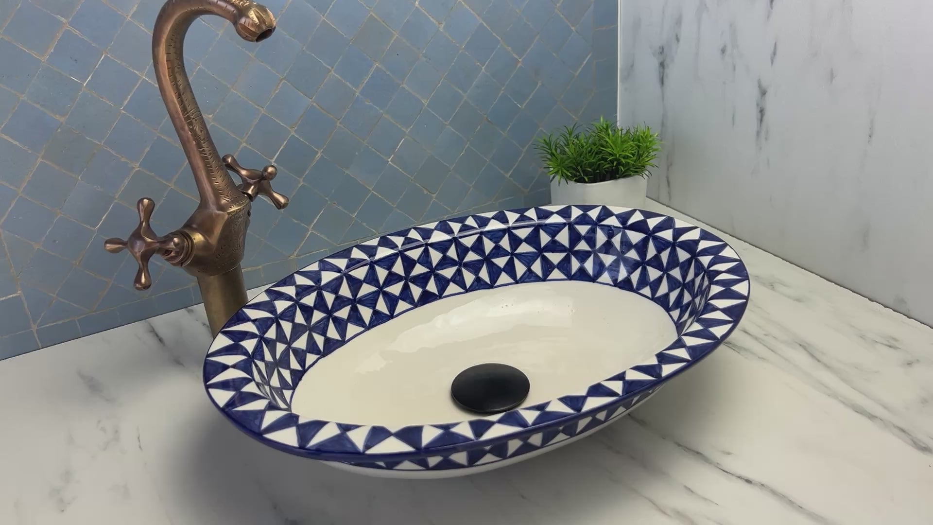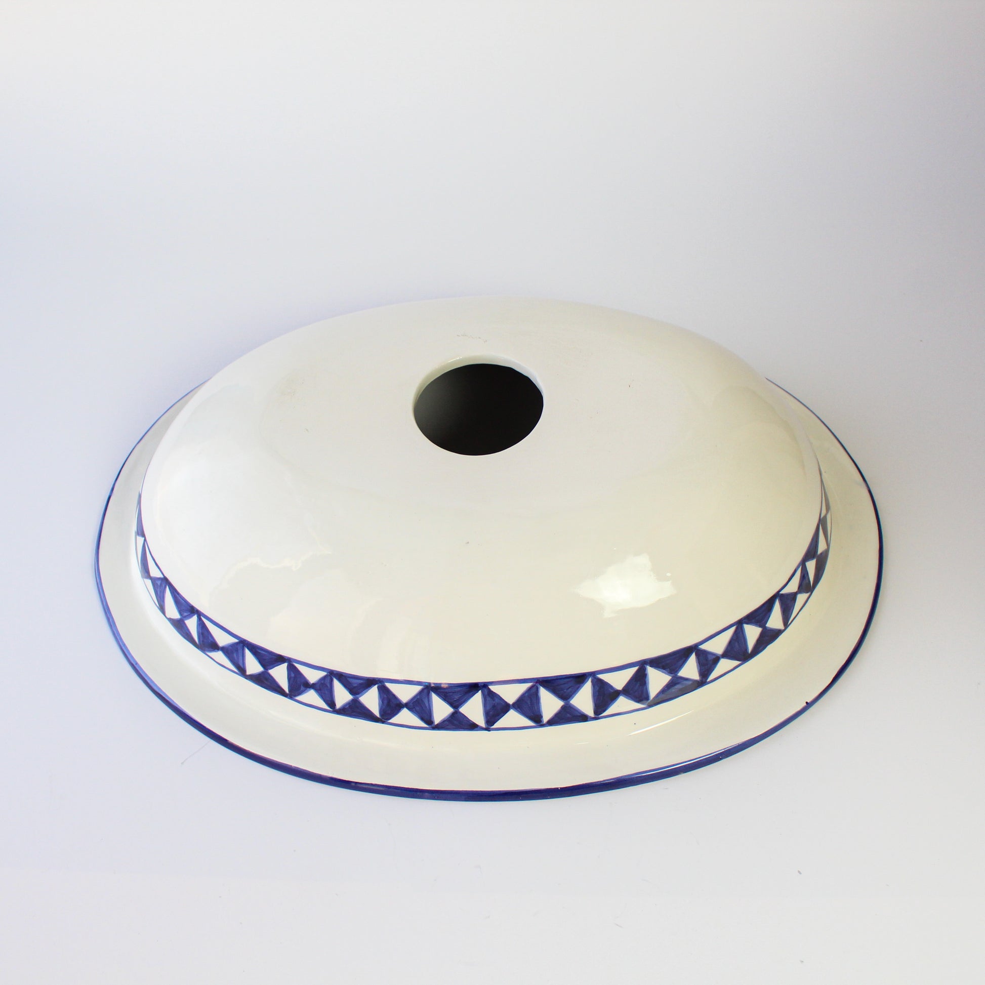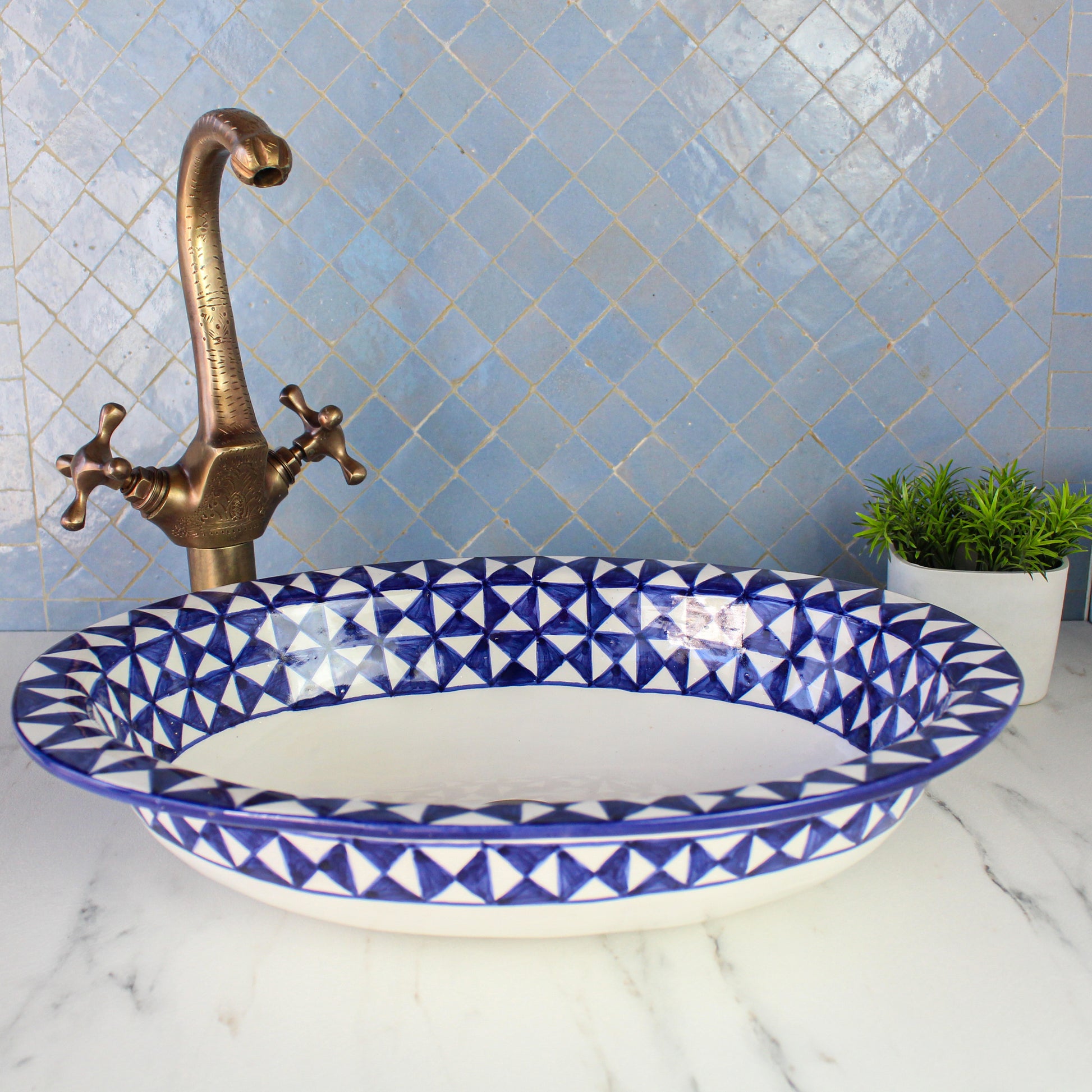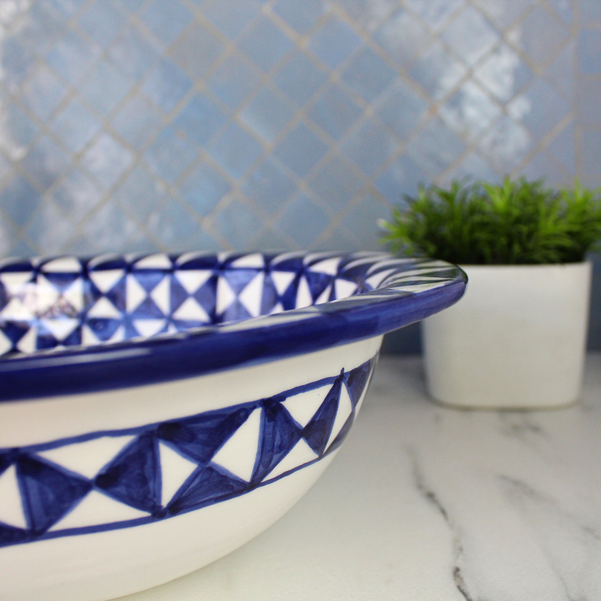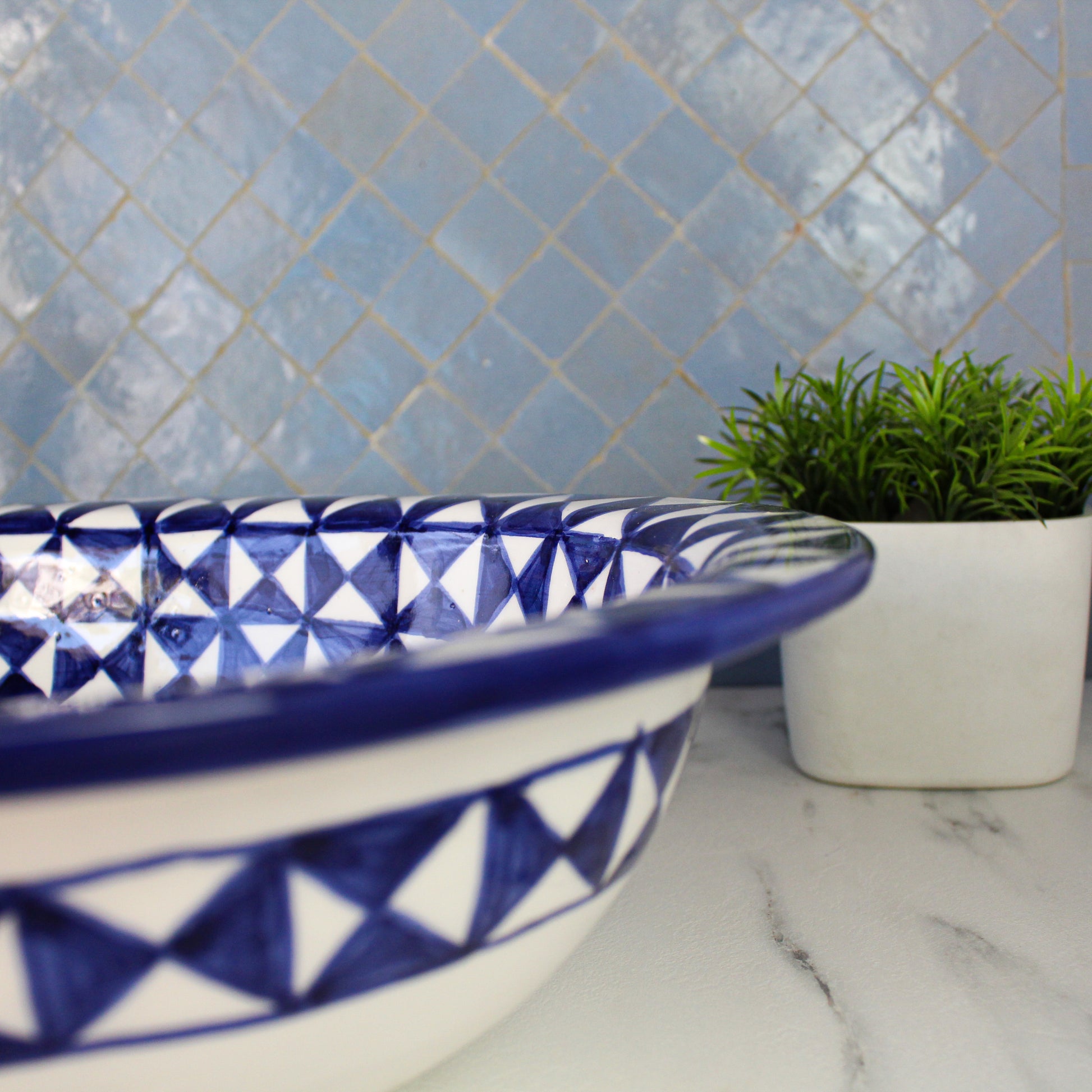 Lavabo a vasca ovale in ceramica con design a bordo piatto. Modelliamo ogni pezzo a mano nel nostro laboratorio, poi dipingiamo i motivi caleidoscopio individualmente usando forme geometriche blu.
