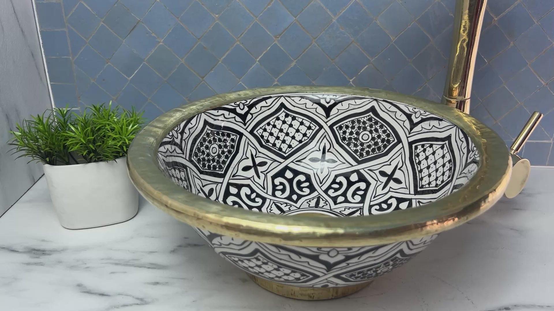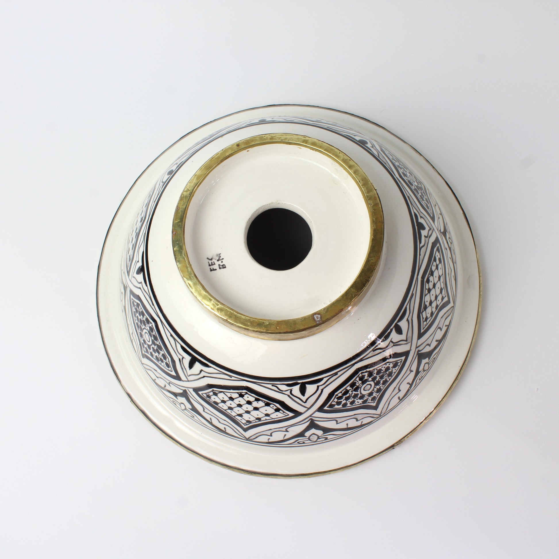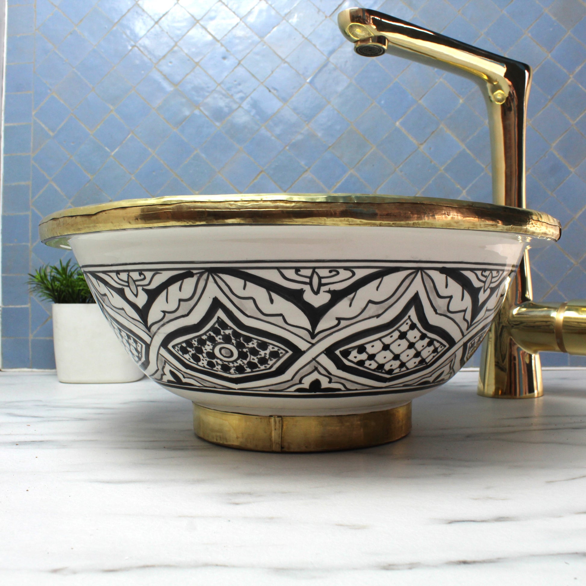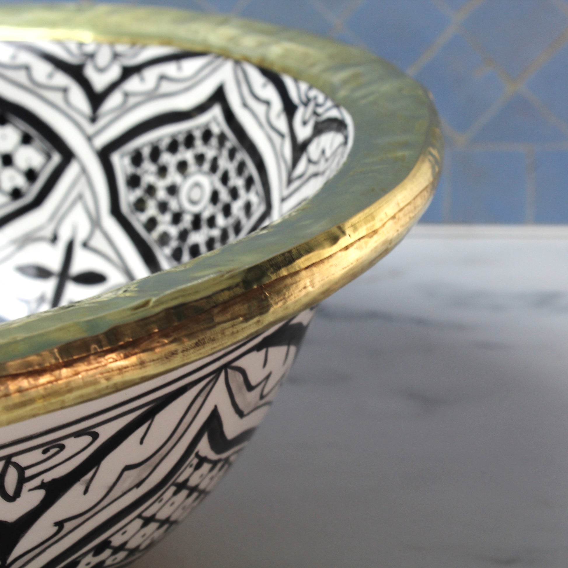 Lavabo a vasca rotondo in ceramica con bordo piatto in ottone e motivi mandala. Dipingiamo ogni scaglia individualmente a mano nel nostro laboratorio, poi fissiamo il bordo in ottone per un aspetto finito.