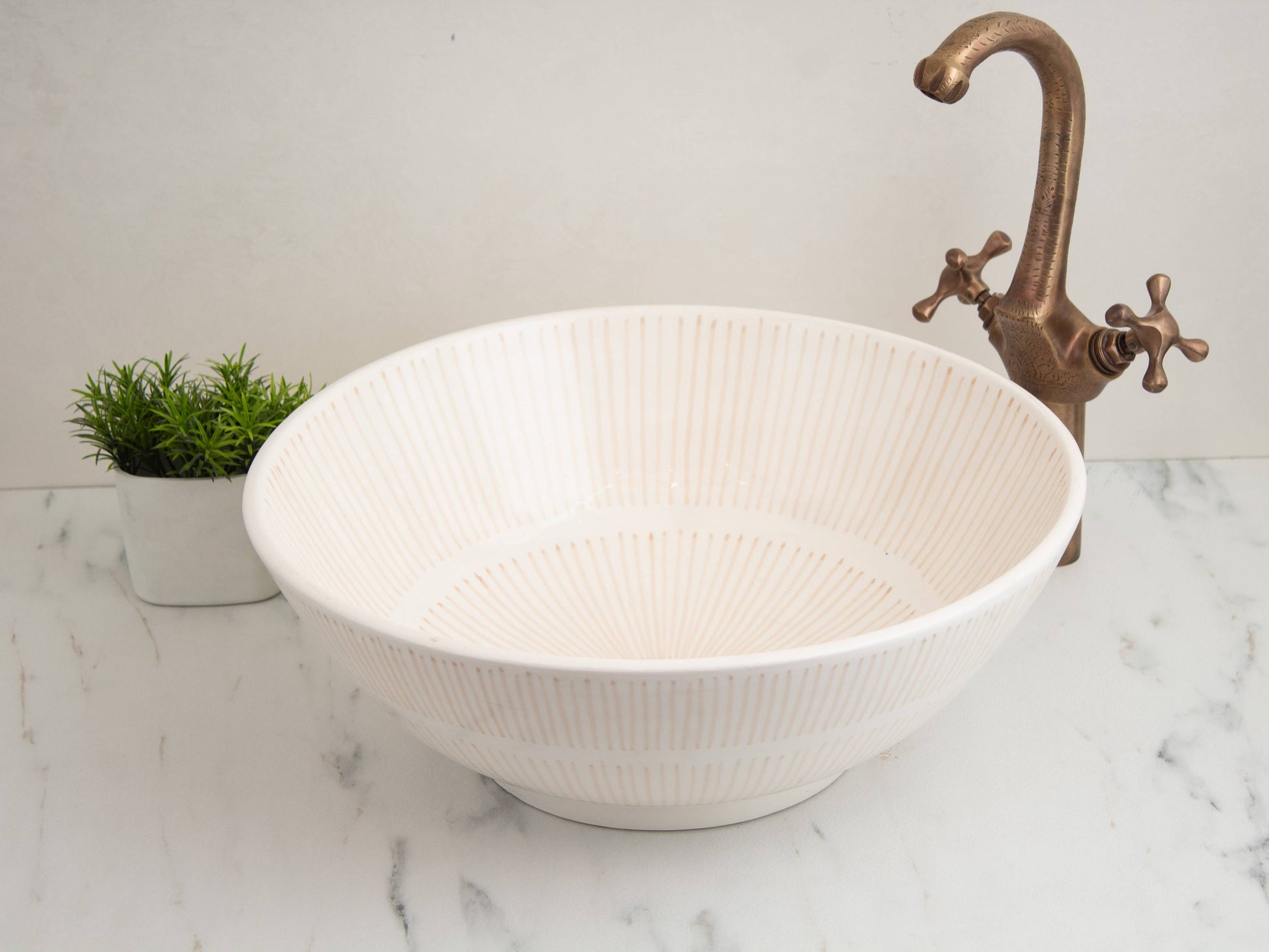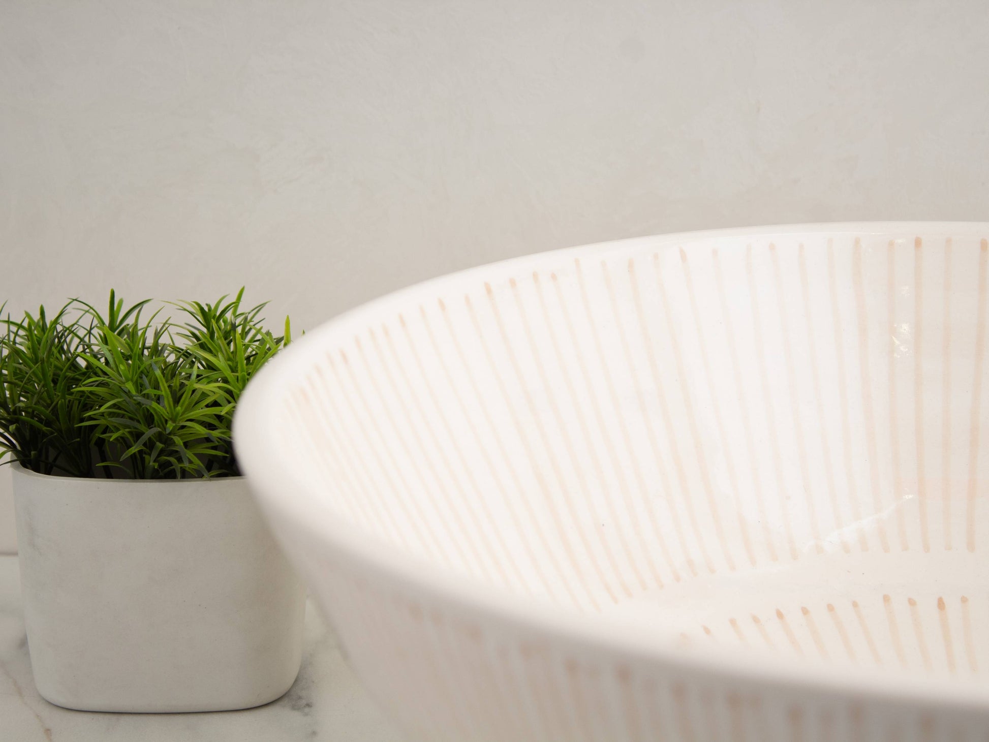 Una sottile texture verticale crea un look minimalista e sofisticato su questo lavandino color crema. Le dolci creste catturano magnificamente la luce, aggiungendo profondità senza sovraccaricare lo spazio. Questo pezzo dimostra che il fatto a mano non deve significare impegnativo – a volte il design d'impatto è il più semplice.