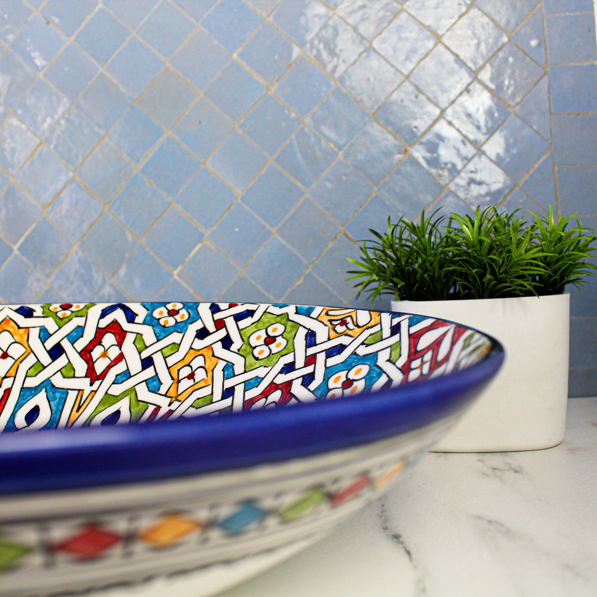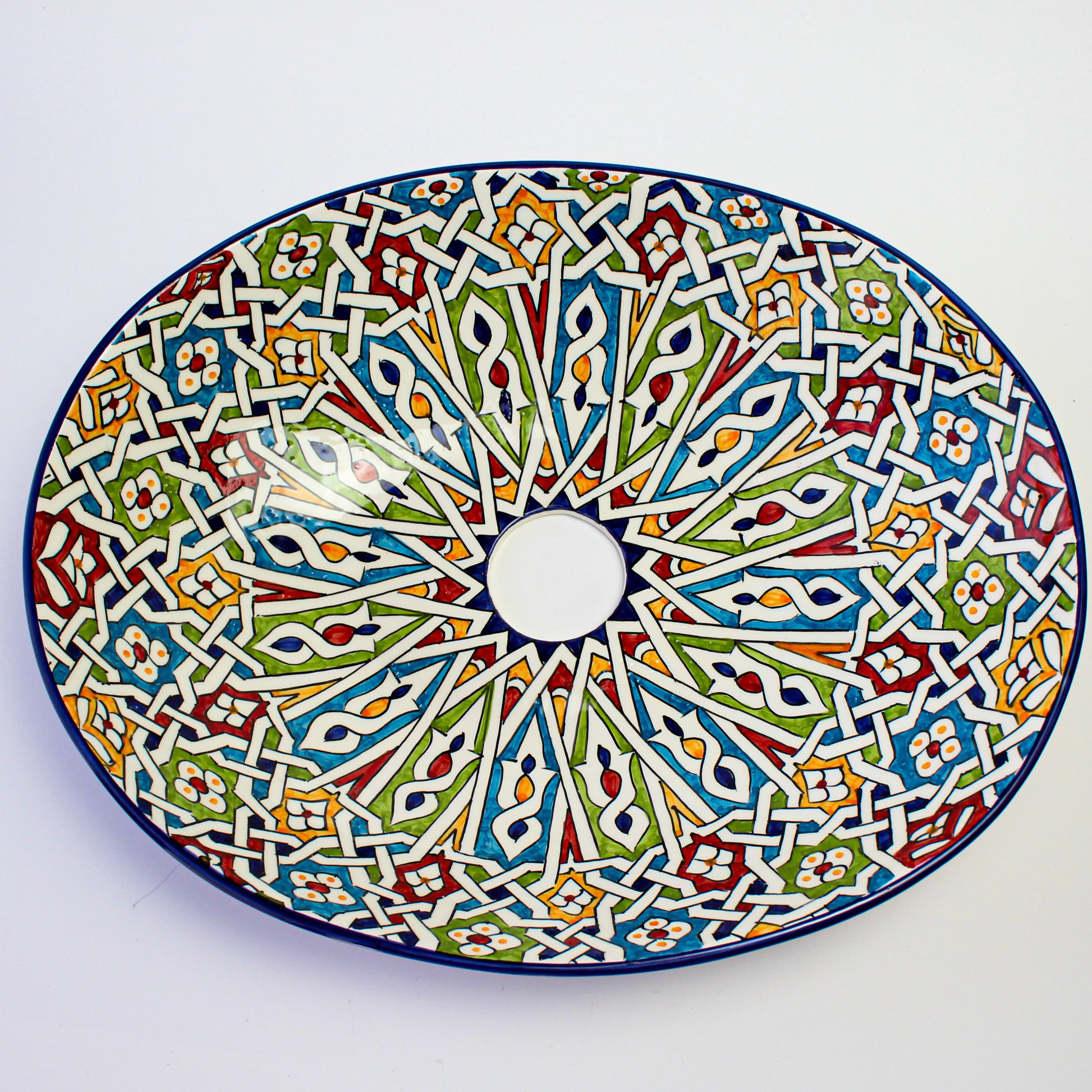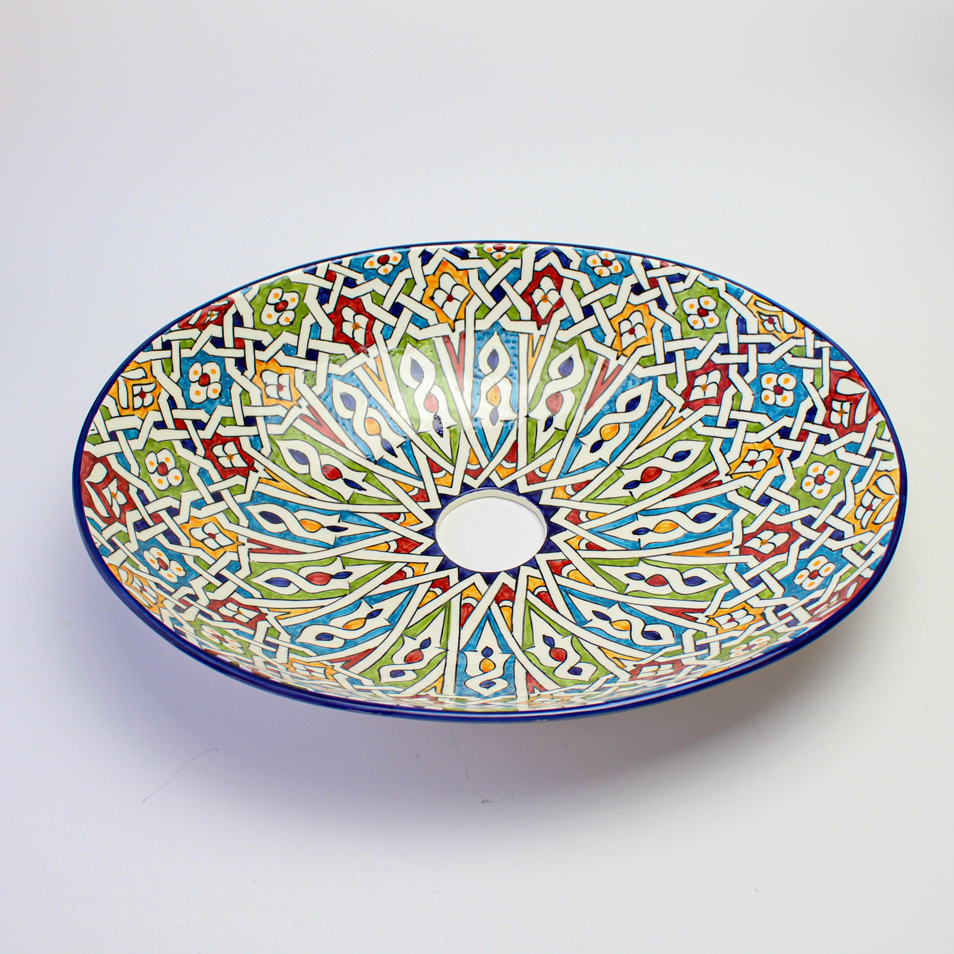 Lavabo a vasca ovale in ceramica a forma di guscio di tartaruga. Modelliamo ogni pezzo a mano nel nostro laboratorio, poi dipingiamo i motivi geometrici individualmente con diverse combinazioni di colori.