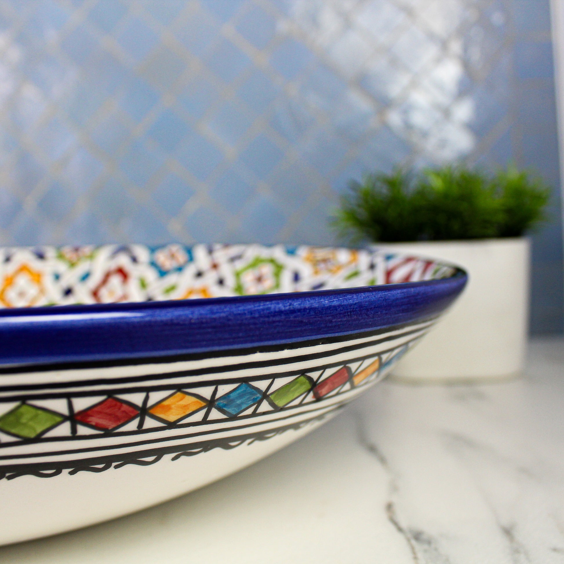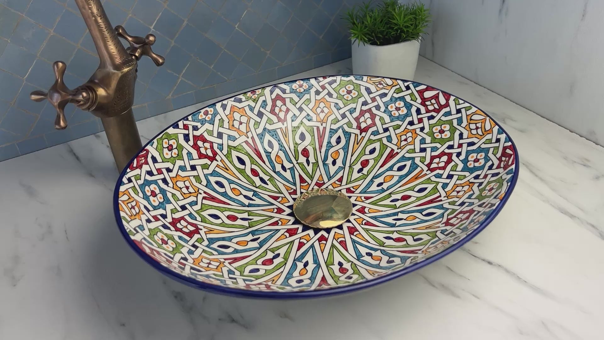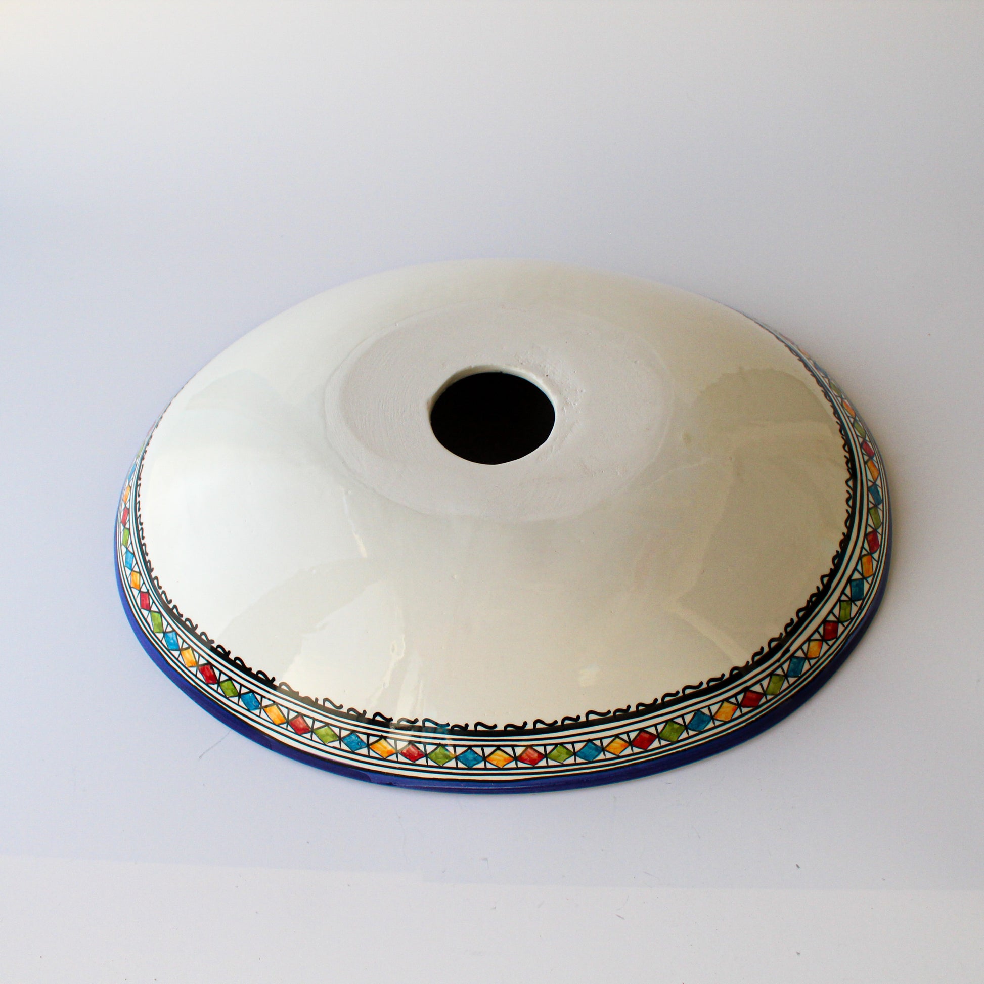 Lavabo a vasca ovale in ceramica a forma di guscio di tartaruga. Modelliamo ogni pezzo a mano nel nostro laboratorio, poi dipingiamo i motivi geometrici individualmente con diverse combinazioni di colori.