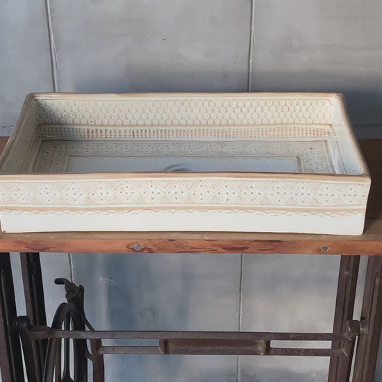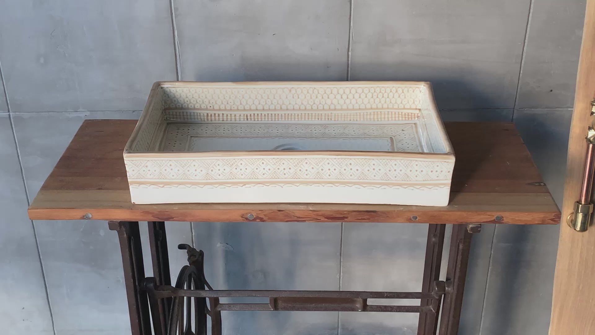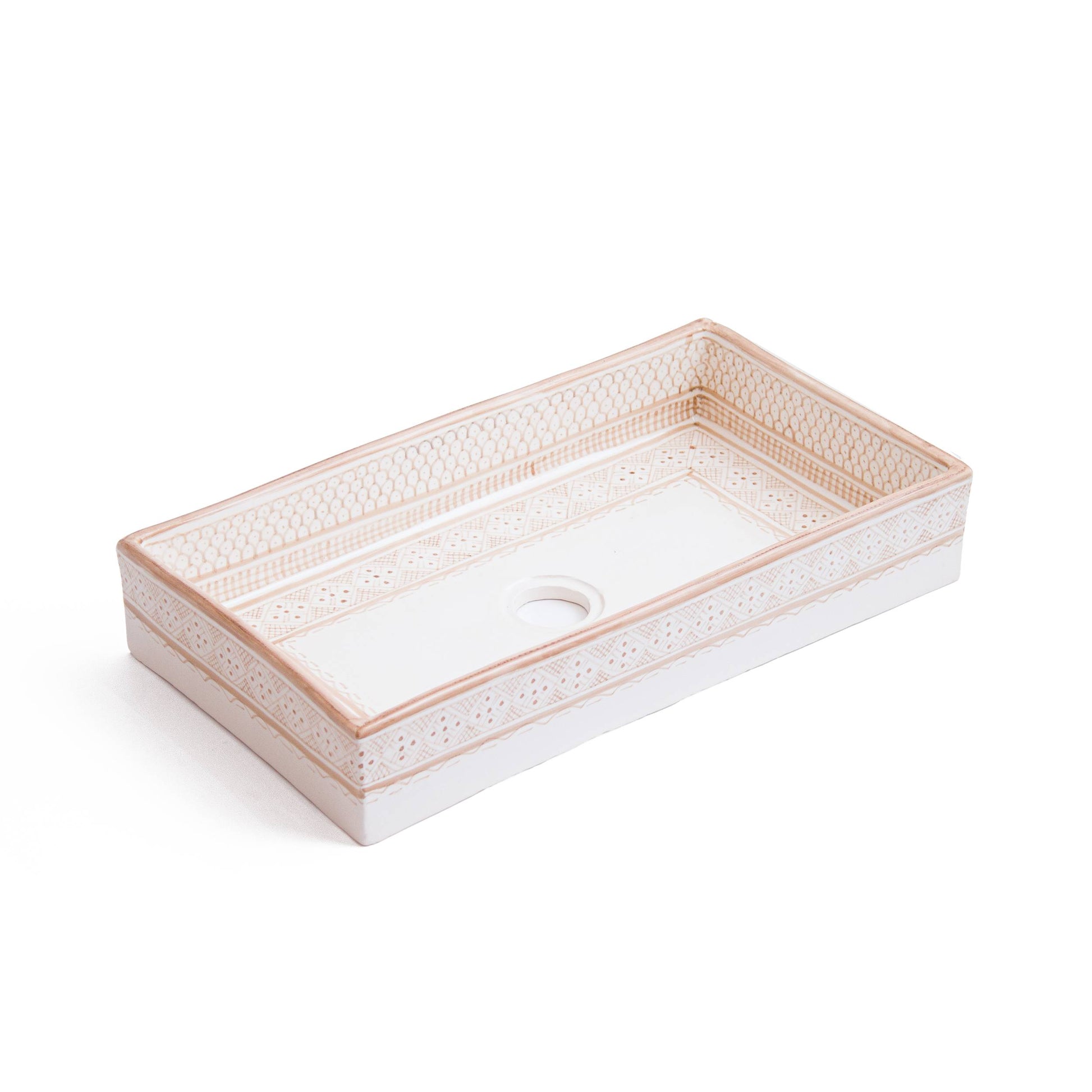 Delicati motivi a trama rosa pallido creano un bordo morbido e romantico su questo lavandino rettangolare. I complessi disegni geometrici sono dipinti a mano in tonalità rosa calde, creando un look femminile ma sofisticato. Il colore sottile porta calore ed eleganza senza sovrastare lo spazio.