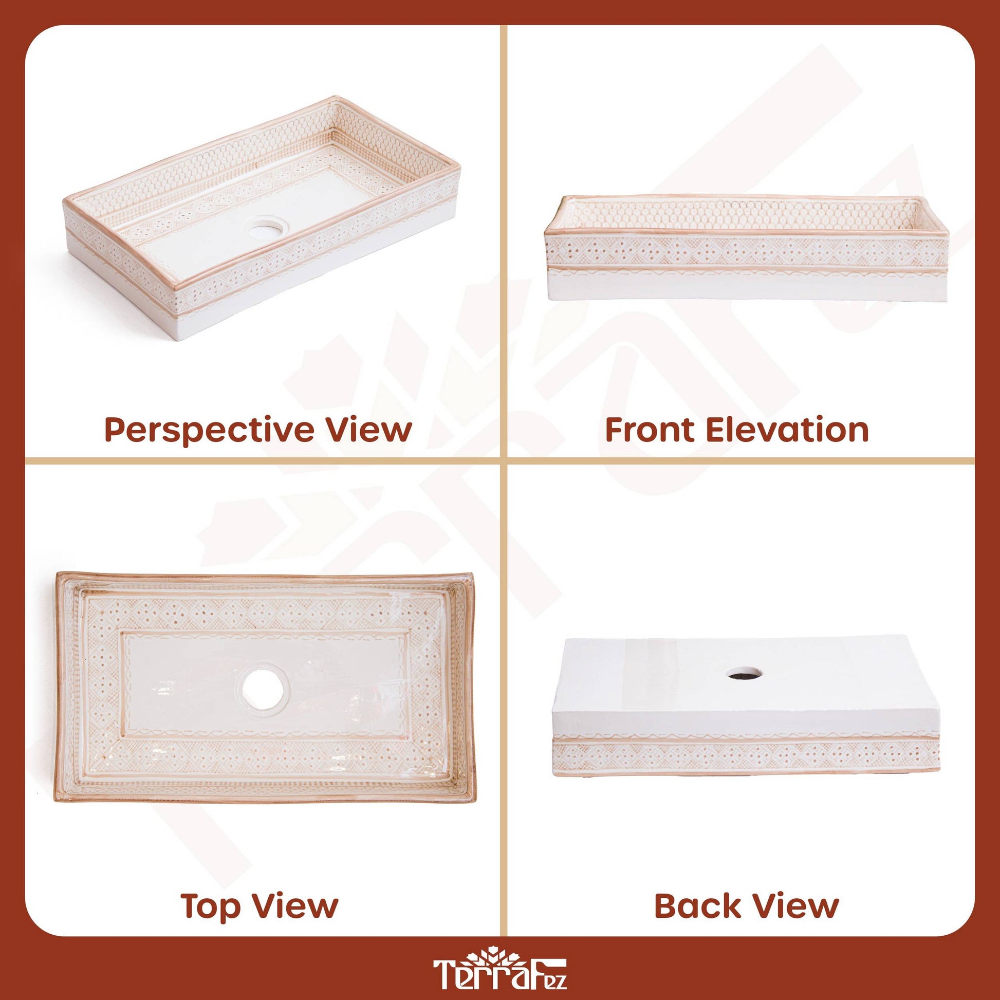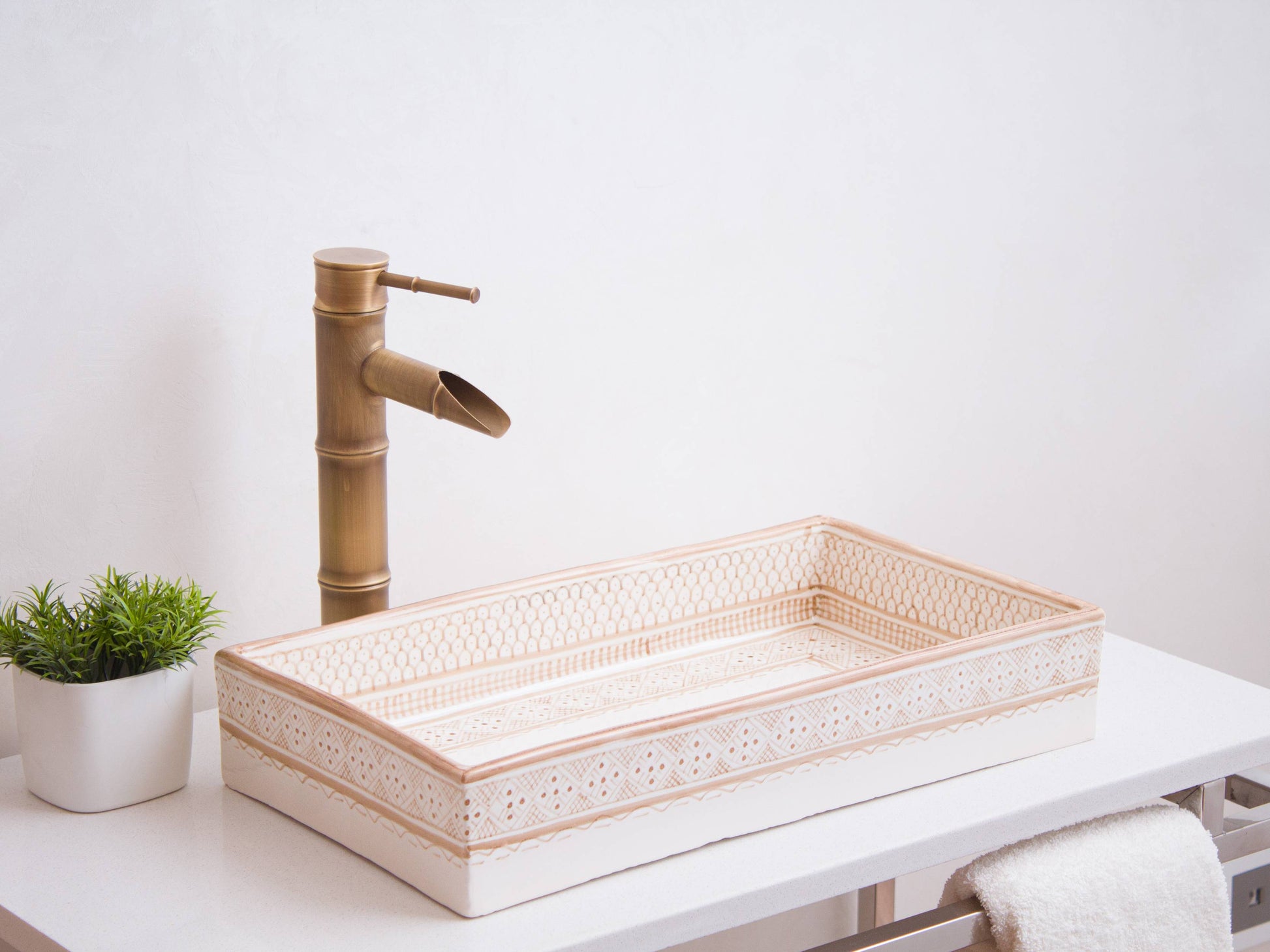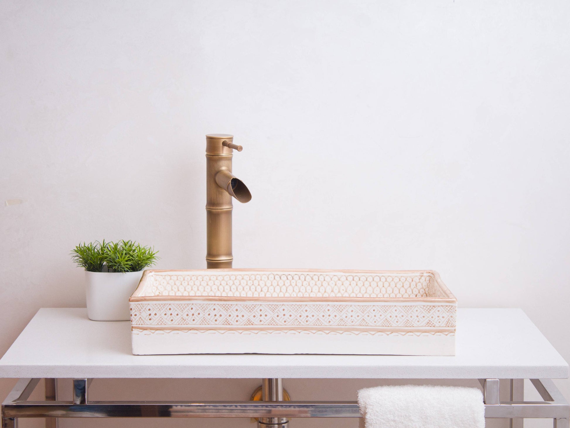 Bello in bagni romantici, femminili o eclettici. La forma rettangolare fornisce uno spazio pratico per il bacino. Si abbina meravigliosamente con rubinetteria in oro rosa, oro o ottone.