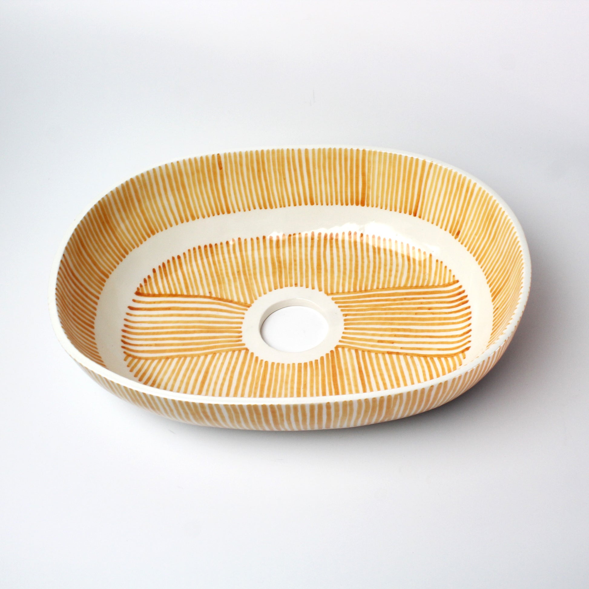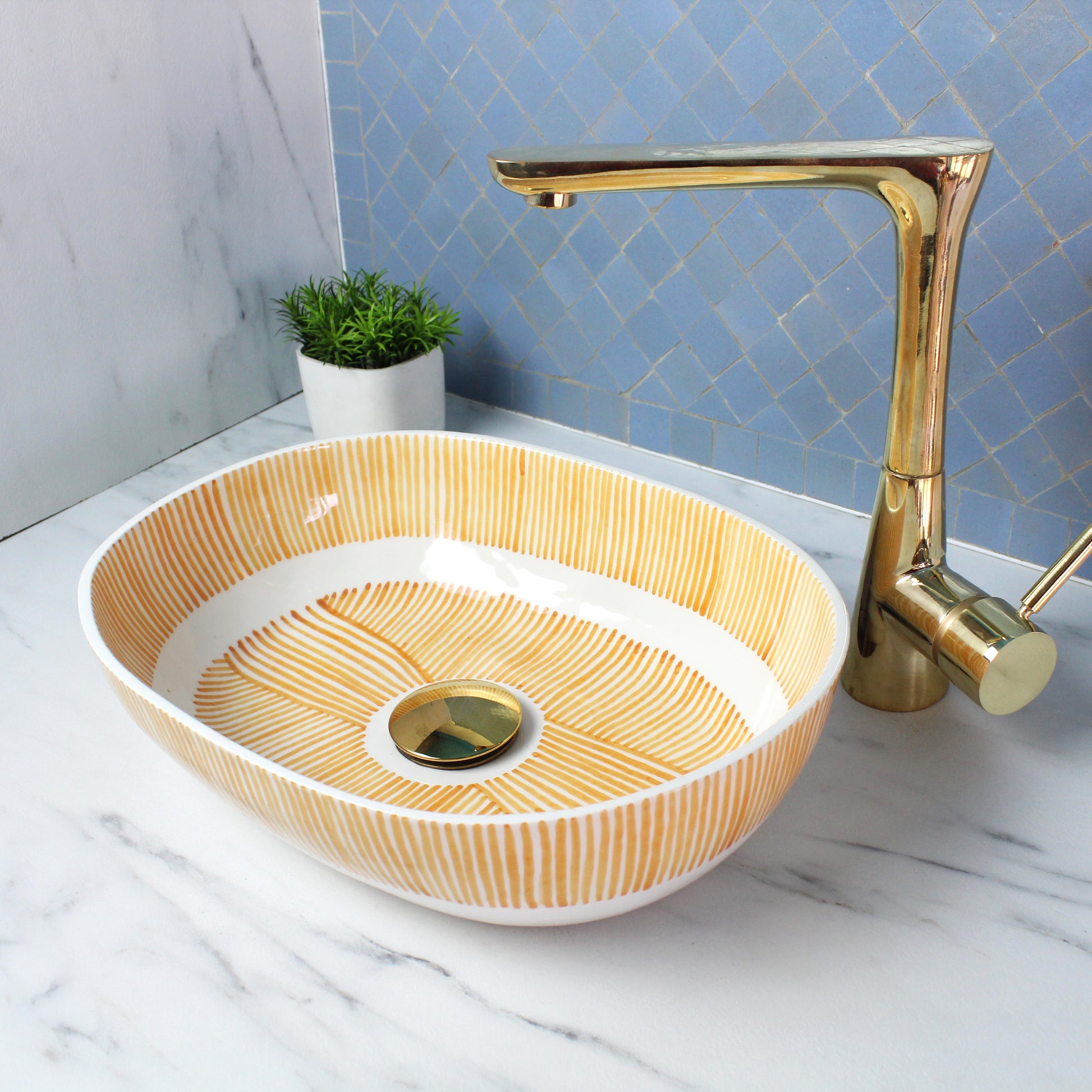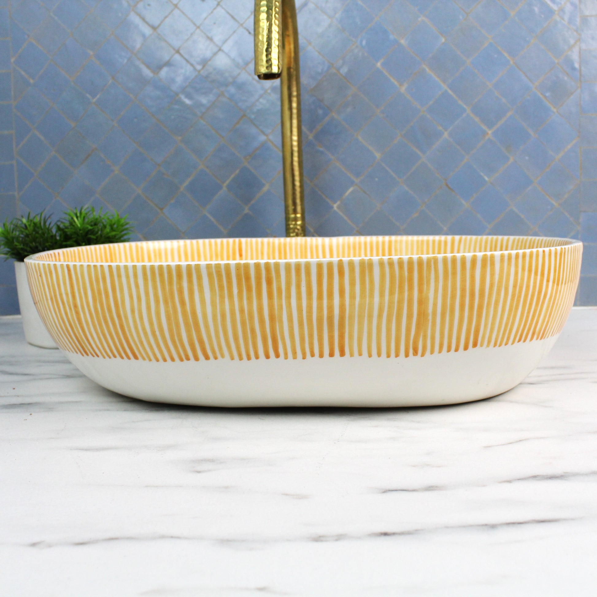 Lavabo a vasca ovale in ceramica con motivi esplosione gialla. Dipingiamo ogni design radiante individualmente a mano nel nostro laboratorio utilizzando tecniche di pennello tradizionali per creare l'effetto simile al sole.