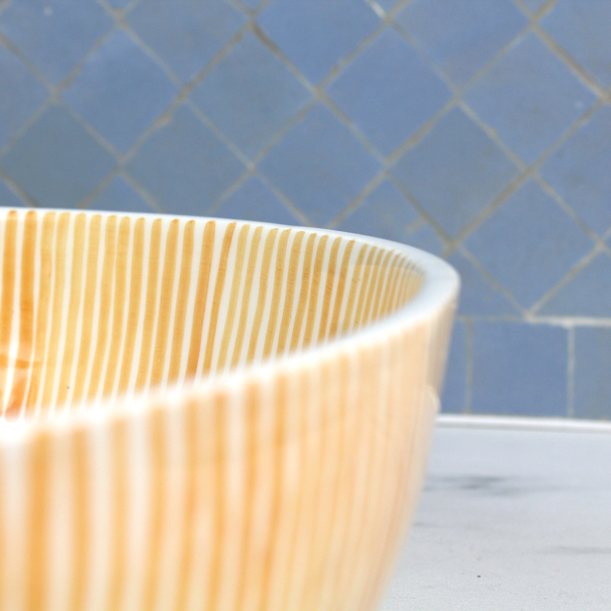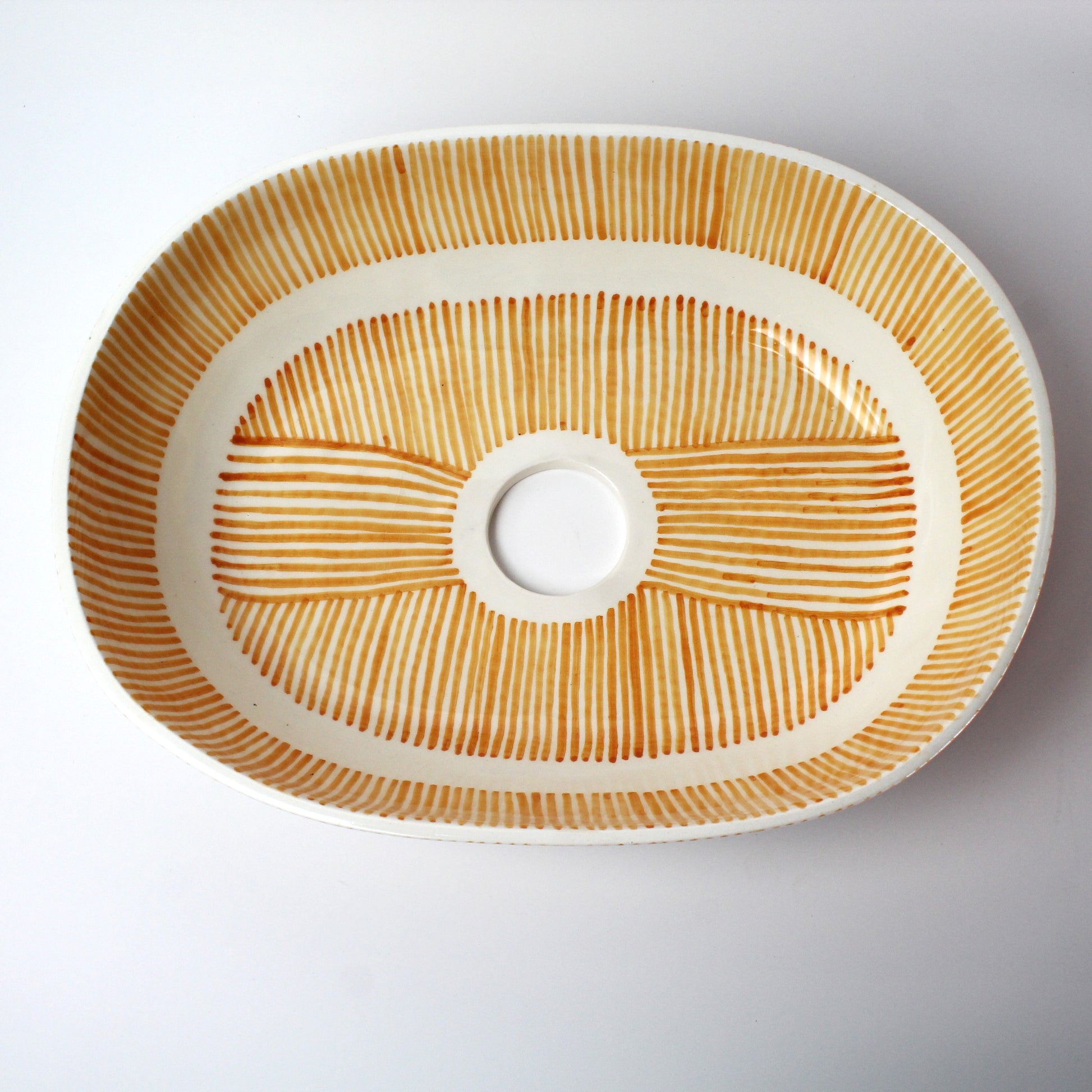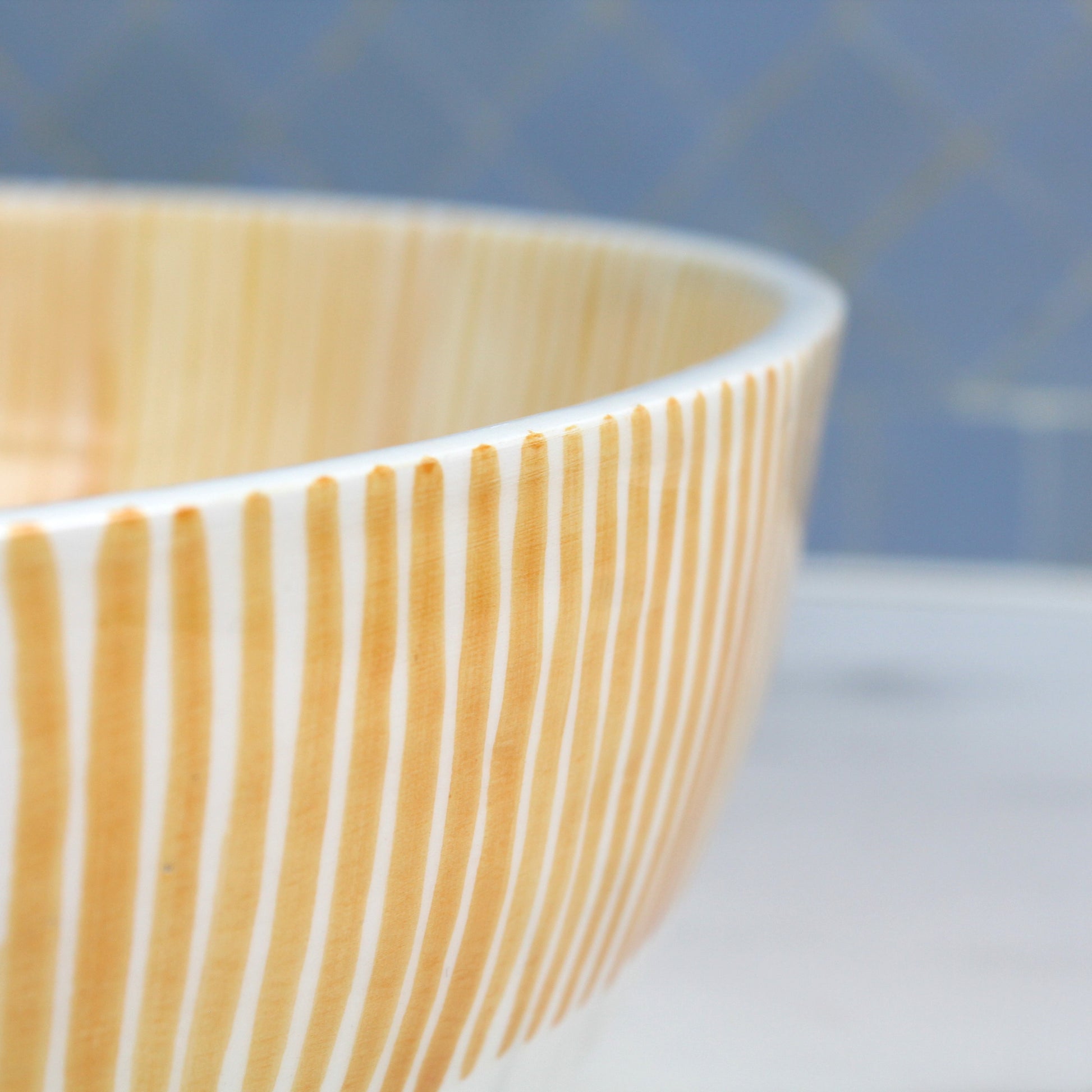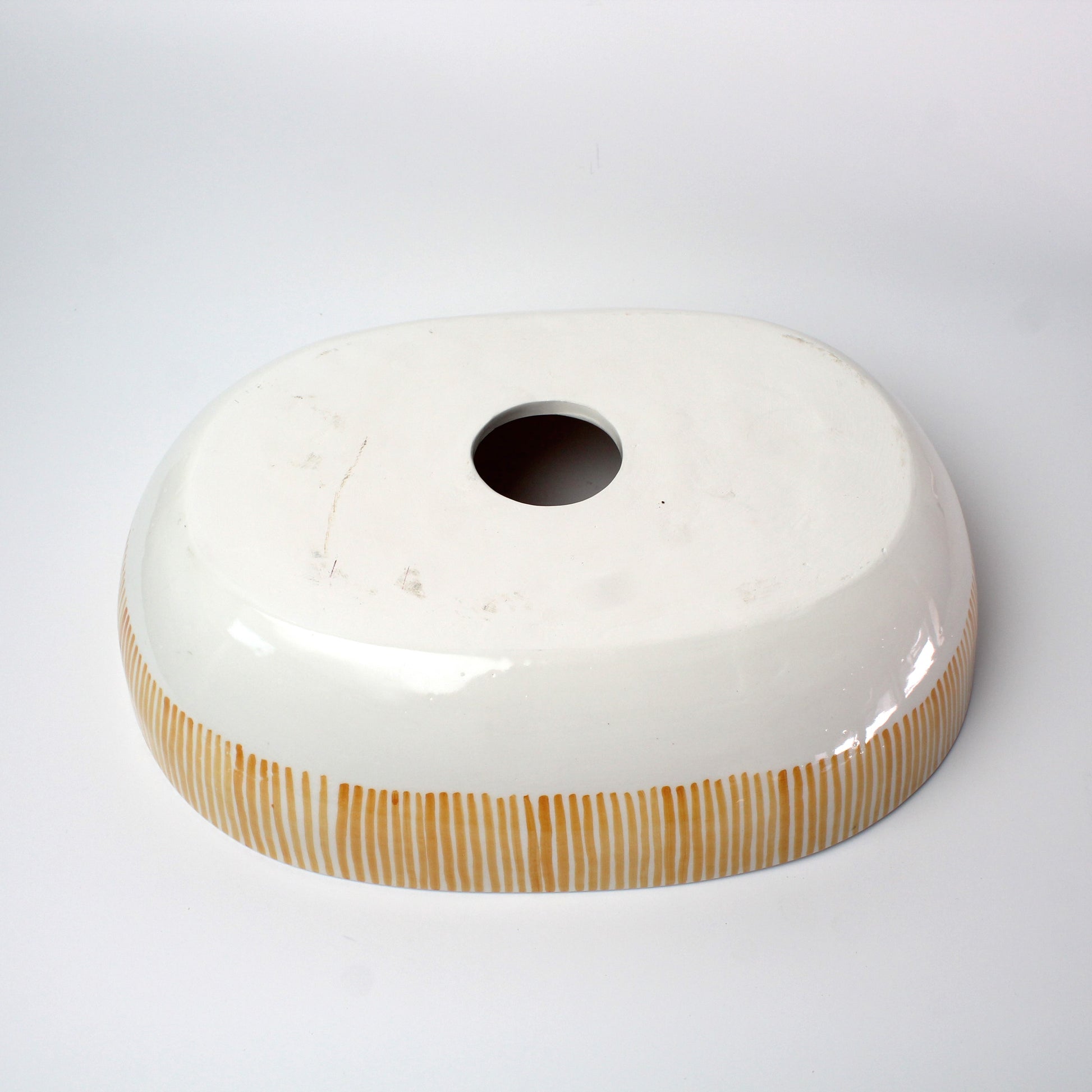 Lavabo a vasca ovale in ceramica con motivi esplosione gialla. Dipingiamo ogni design radiante individualmente a mano nel nostro laboratorio utilizzando tecniche di pennello tradizionali per creare l'effetto simile al sole.