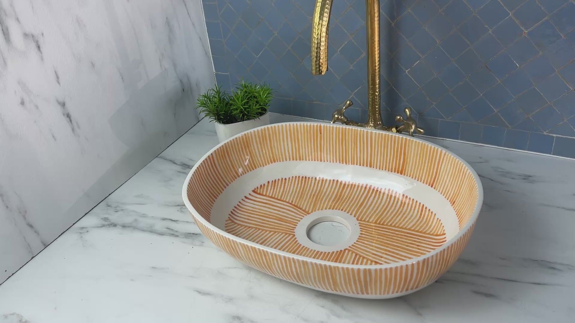 Richiede fino a 2 settimane per il completamento perché ogni motivo richiede una pittura attenta dal centro verso l'esterno. La forma ovale offre più area di lavaggio rispetto ai lavabi rotondi.