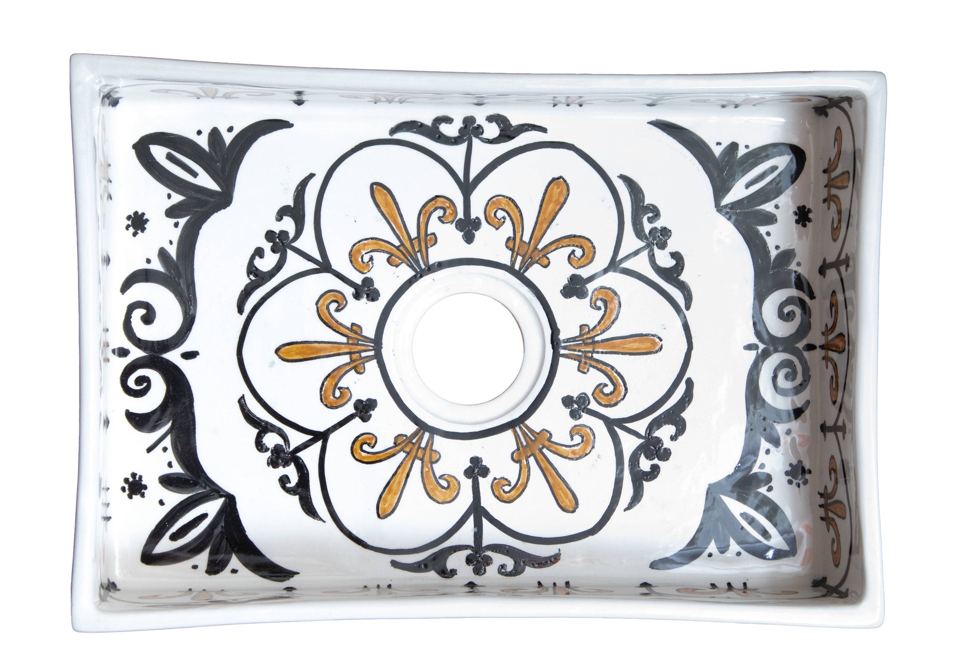 This elegant mini rectangular sink features intricate bronze and black scalloped arch patterns hand-painted along the border. The repeating arch motifs create a sophisticated, Art Deco-inspired design with a brass-toned sunburst accent at the drain. Each arch is carefully painted by hand, creating subtle variations.