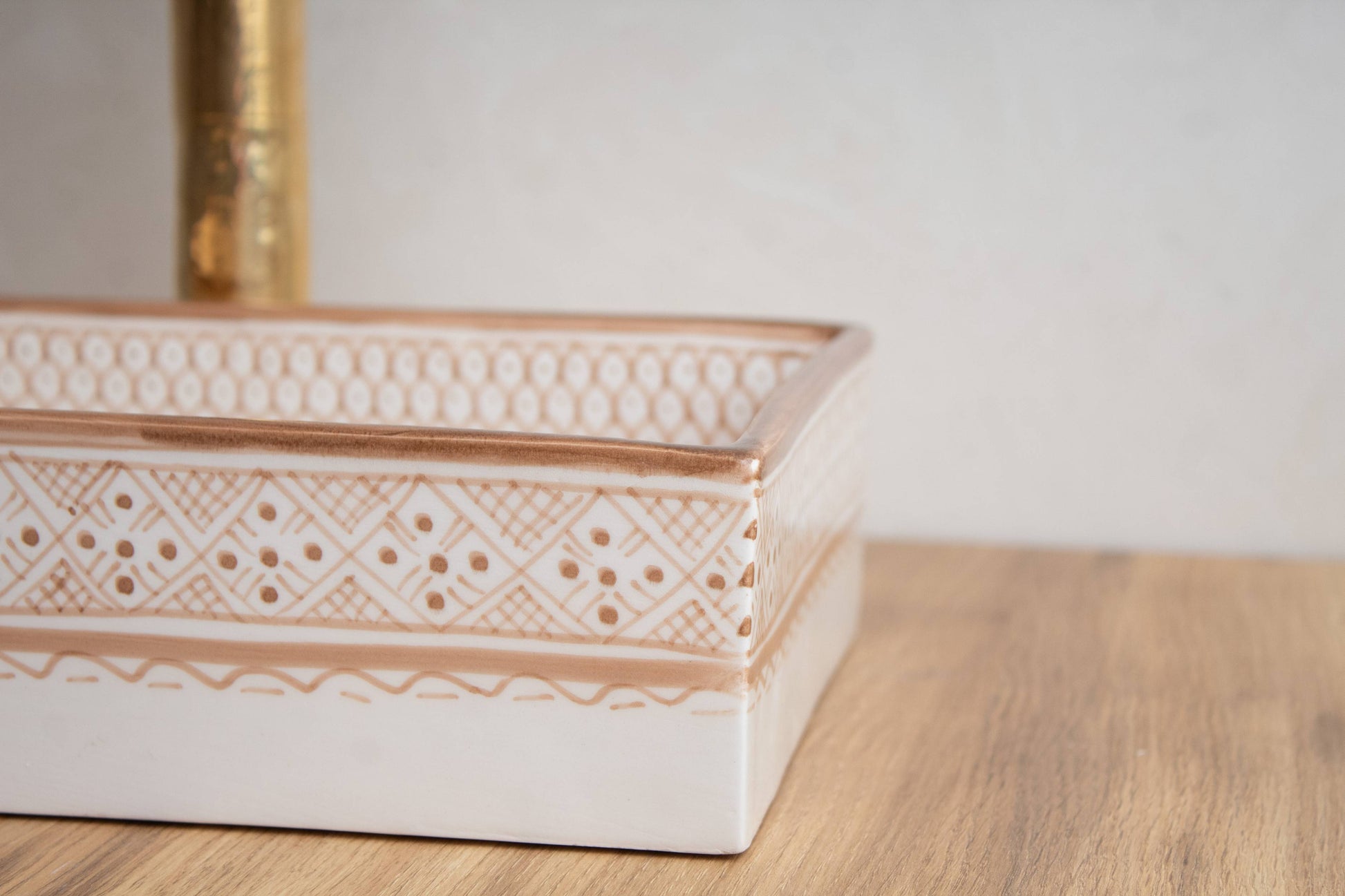 This charming mini rectangular sink features delicate blush pink geometric lattice patterns hand-painted on the interior border. The intricate diamond shapes and linear elements create a soft, romantic look in a compact format. Each element is carefully painted by hand, creating subtle organic variations.